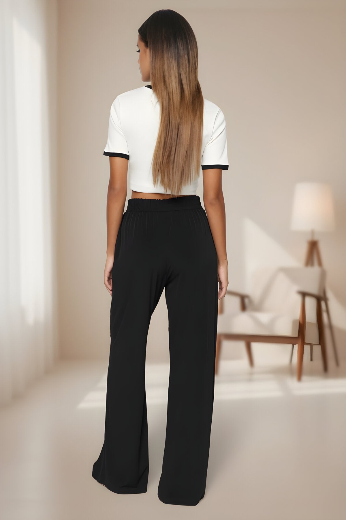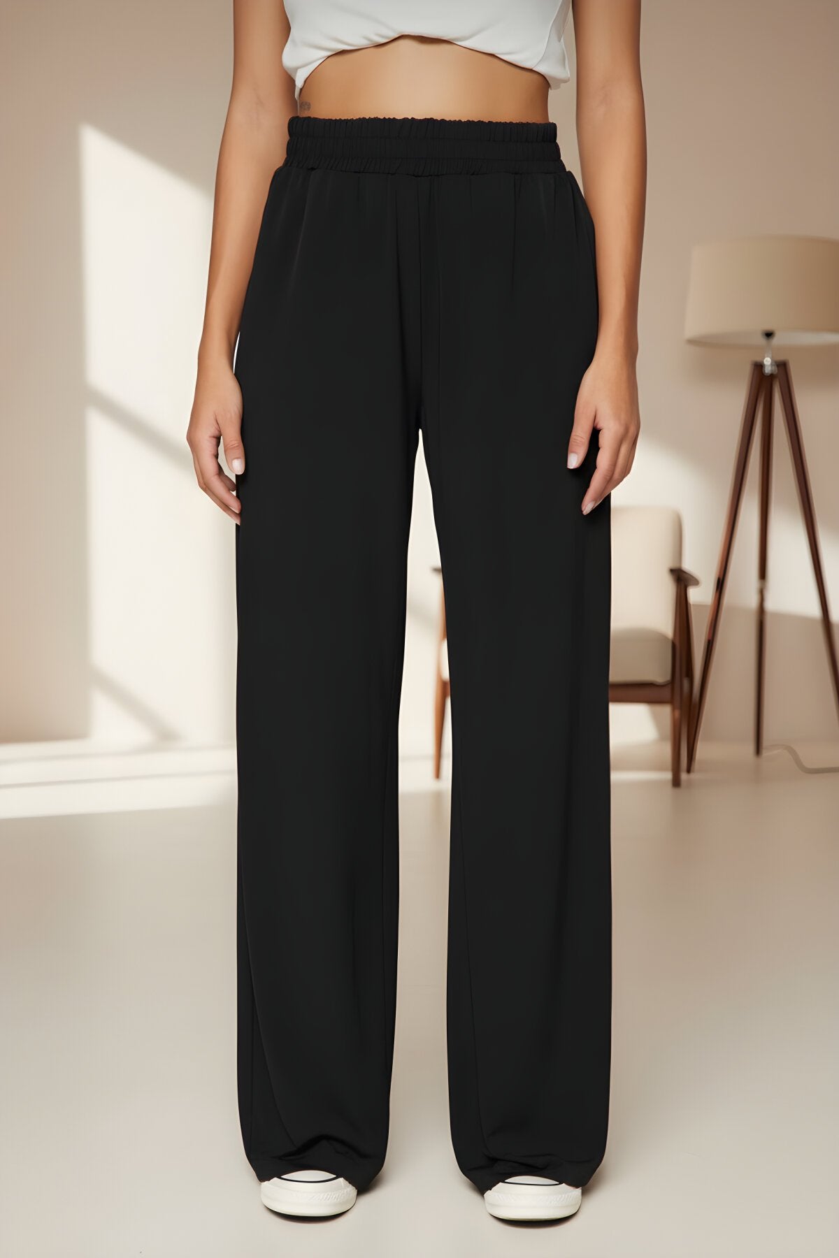 Material: Cotton, Fabric Type: Knitted, Leg Type: Wide Leg, Waist: High Waist, Pattern: Solid, Color: Black, Pocket: No Pockets, Product Detail: Elasticated, Collection: Young, Thickness: Thin, Lining: Unlined, Length: Regular, Silhouette: Jogger, Setting: Young, Fit: Palazzo, Additional Feature: Elasticated Waistband, Weave Type: 2-Yarn, Persona: Cool & Comfort, Print/Embroidery Technique: No Print/Embroidery, Belt/Sash: No Belt, Sustainability Detail: No, Season: Summer, Box Status: No Box