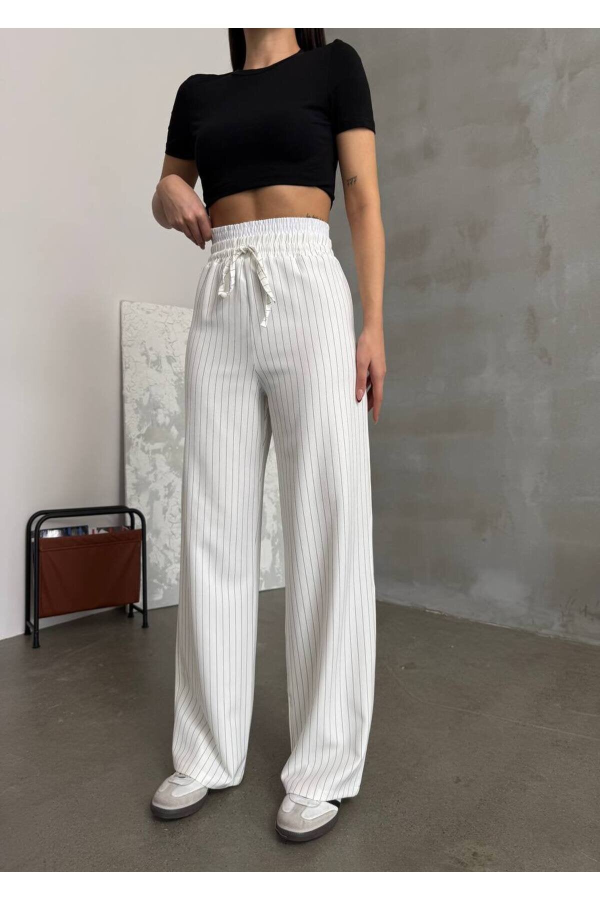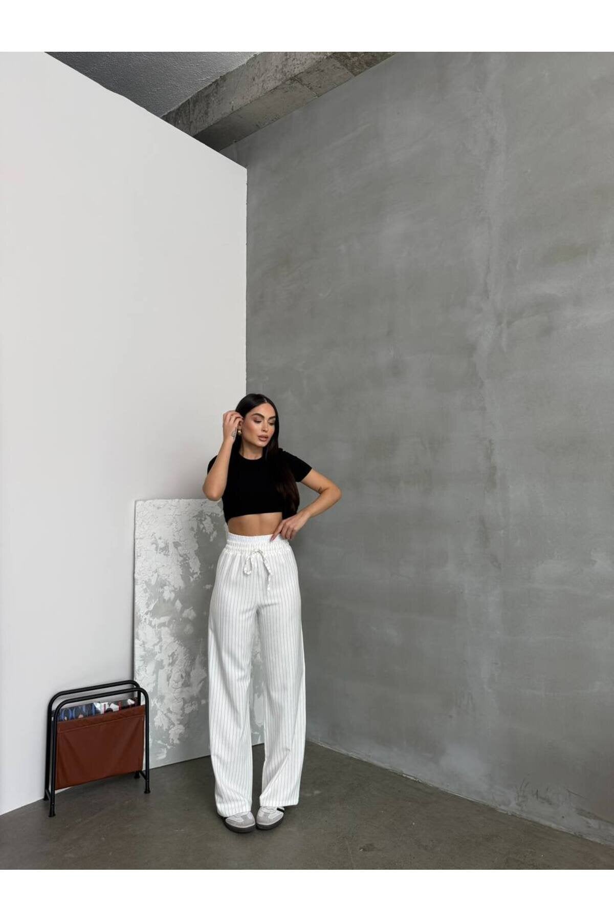 These white palazzo pants offer a sophisticated yet relaxed aesthetic, combining a timeless pinstripe pattern with a modern wide-leg cut. The airy, flowing fabric creates graceful movement with every step, making them a must-have addition to a refined and contemporary wardrobe.
