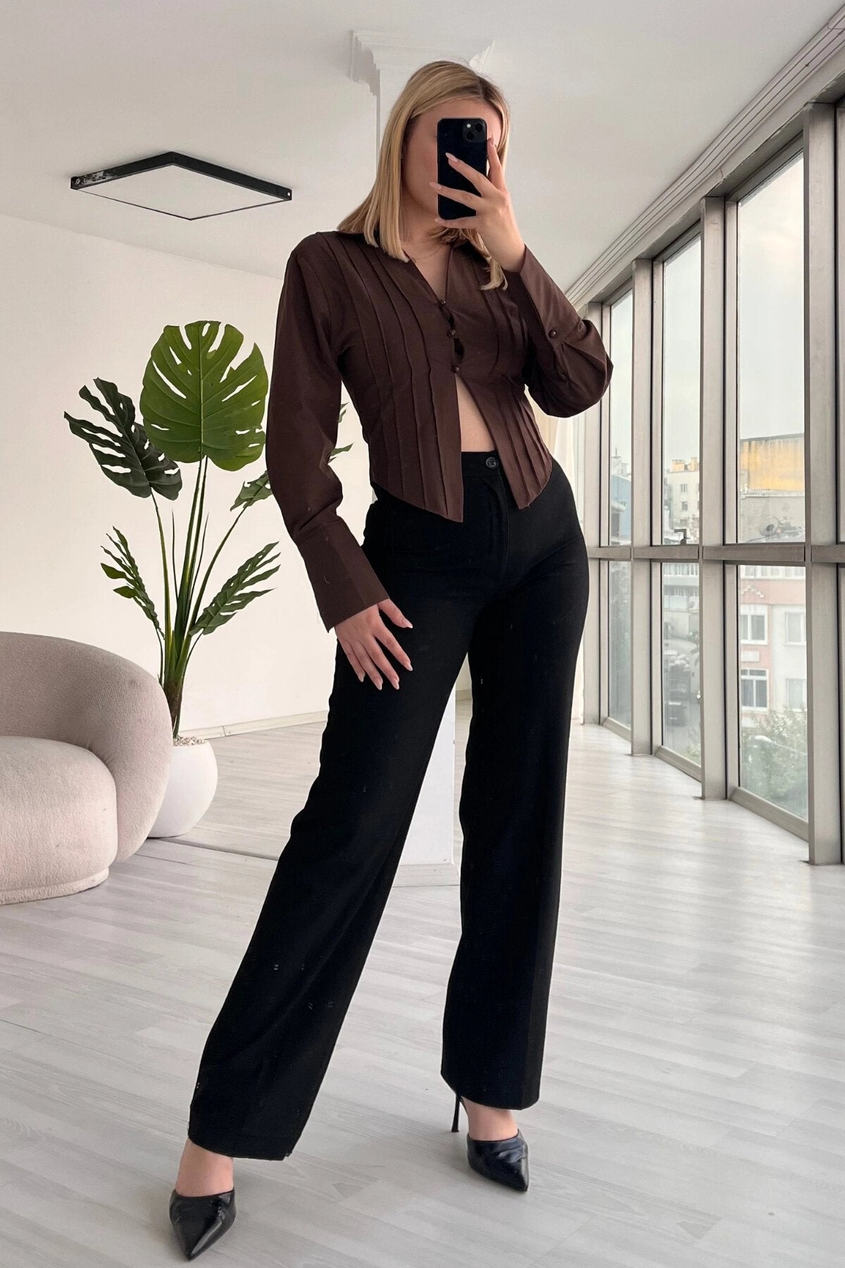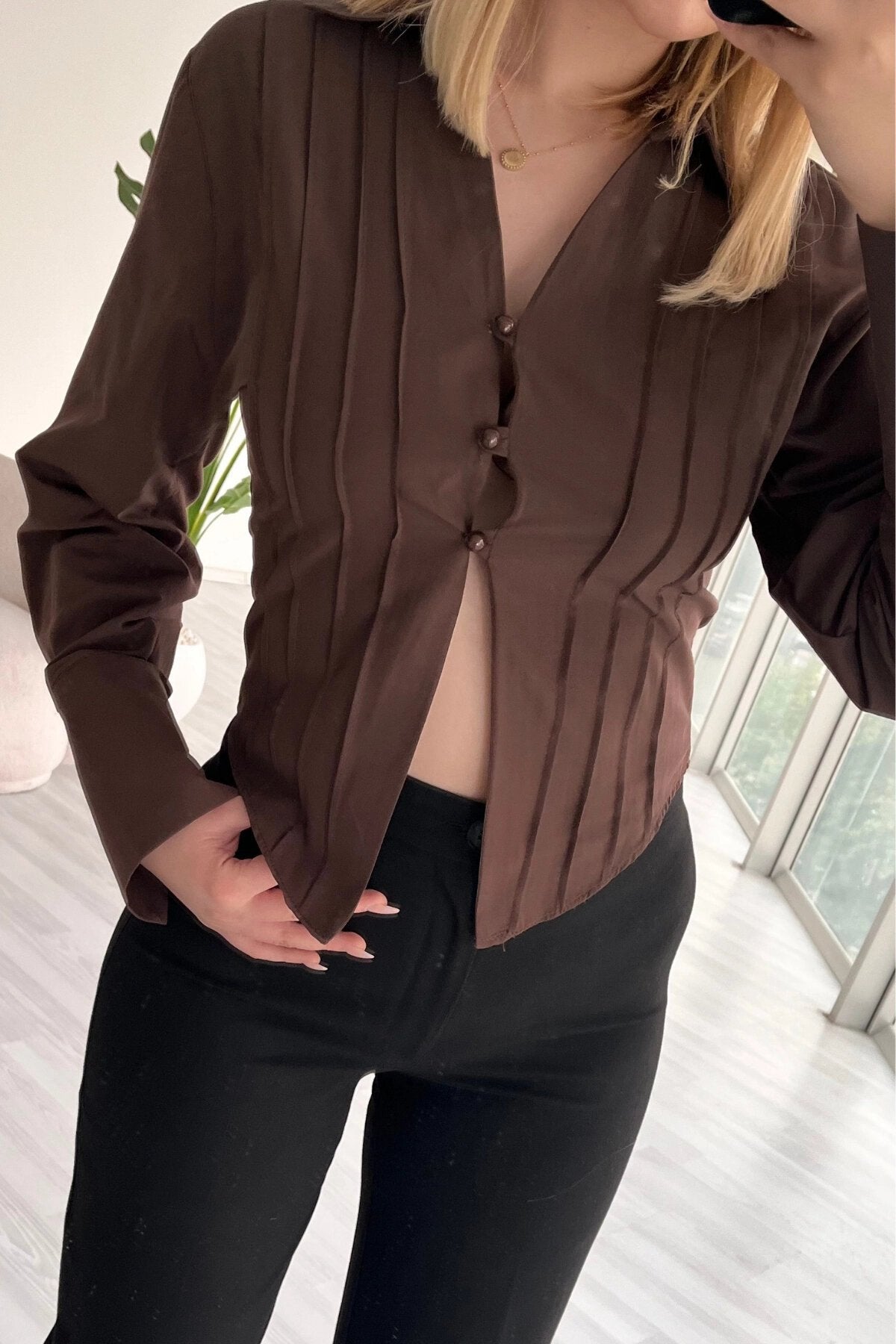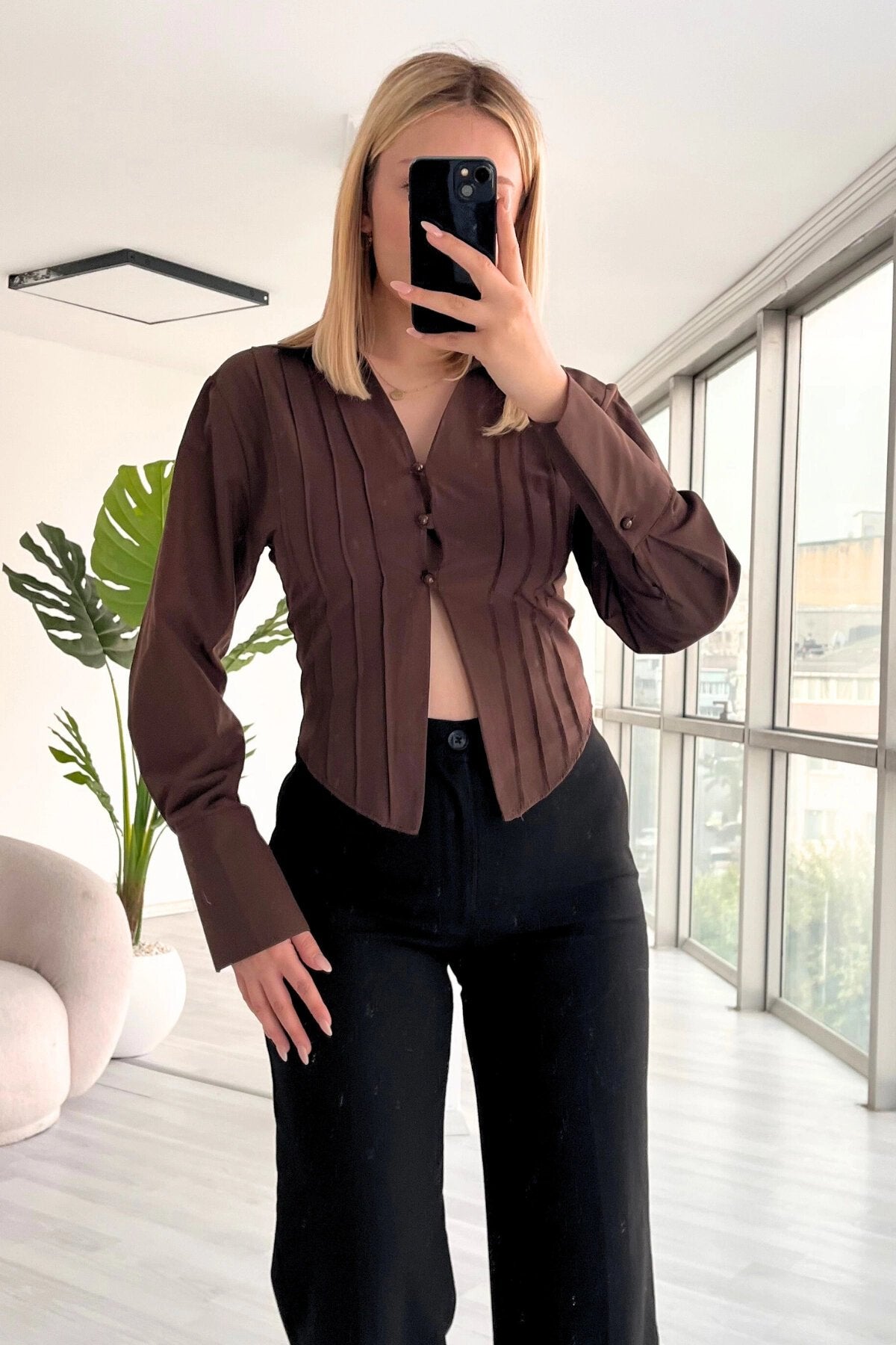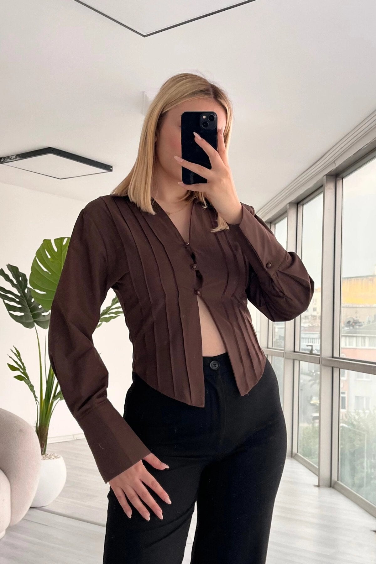 Low-Cut Poplin Button-Detail Shirt - Brown