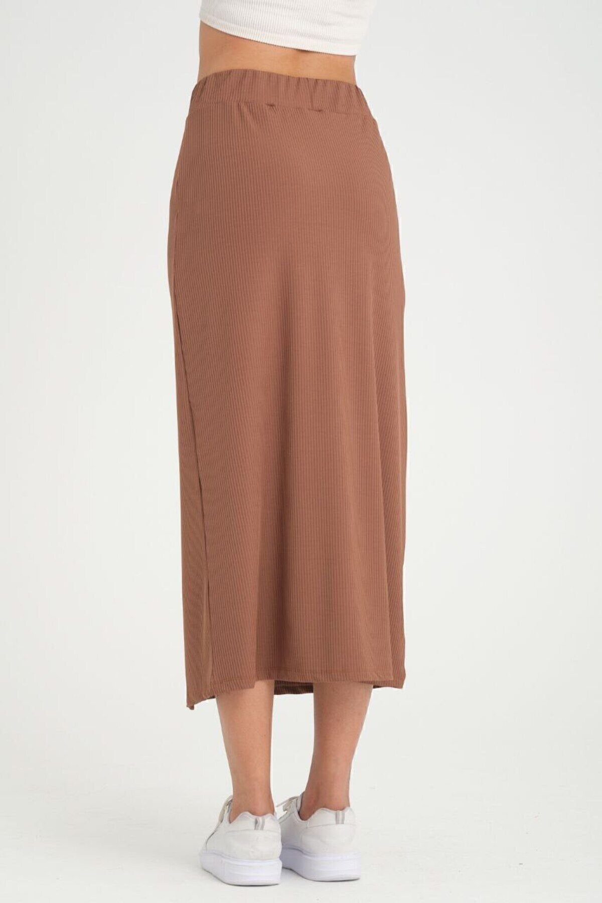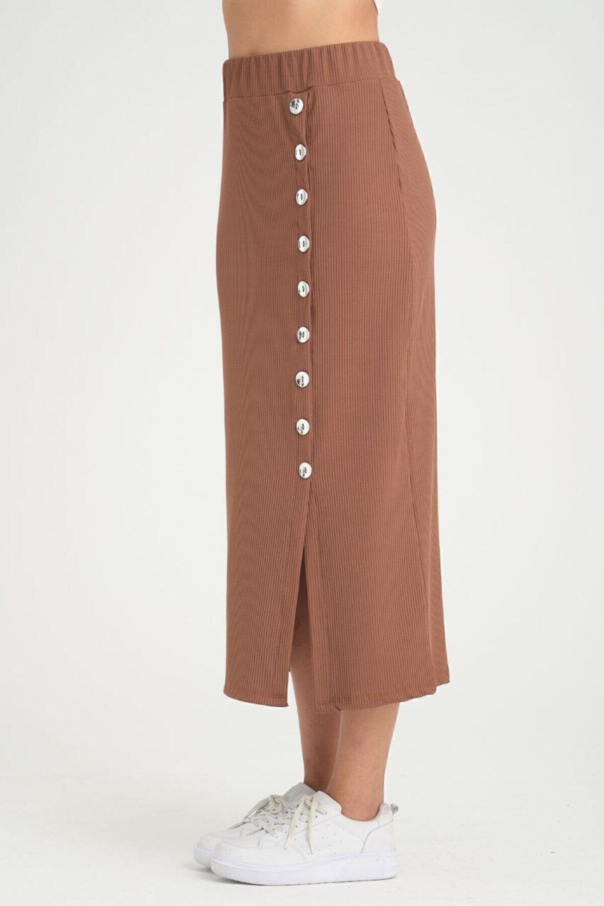 Long Ribbed Slit Skirt with Button Detail - Brown