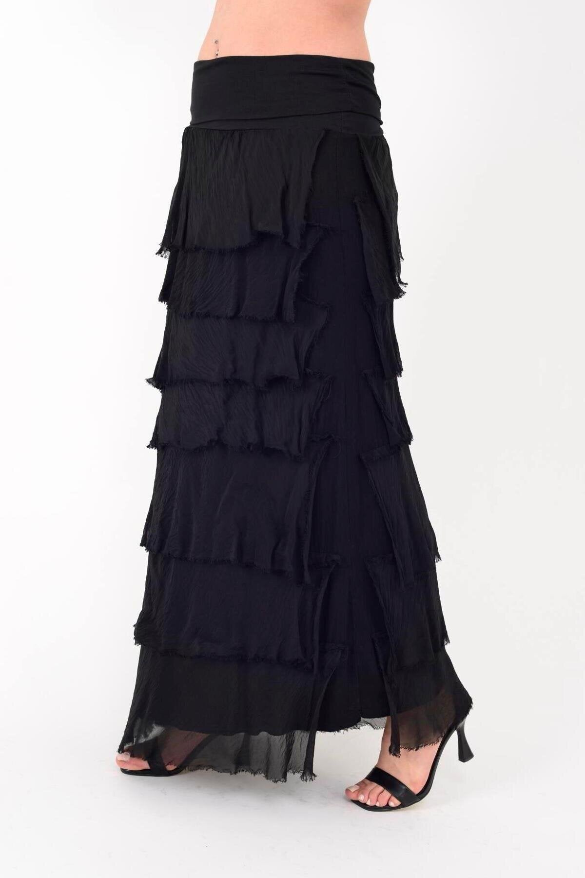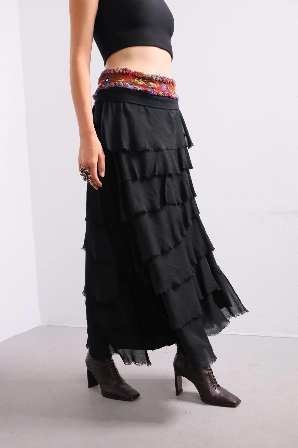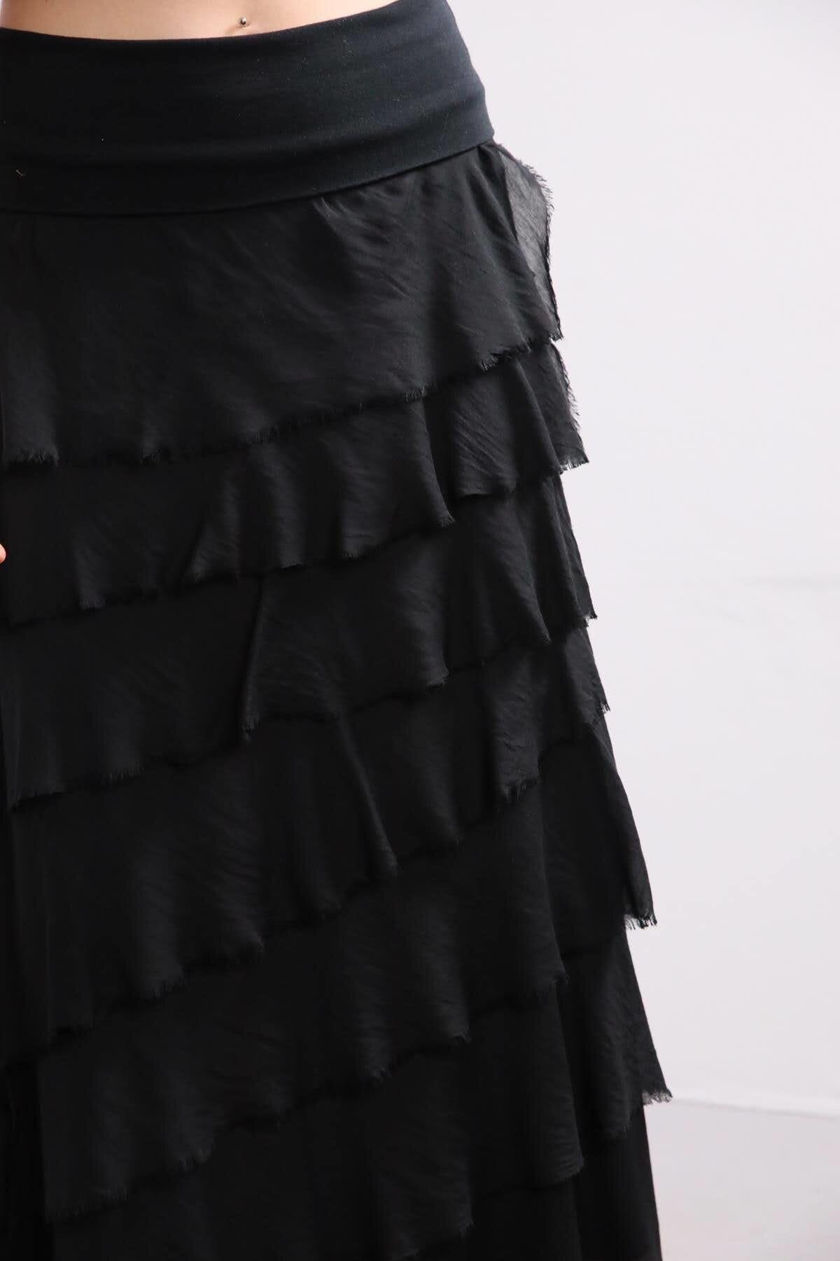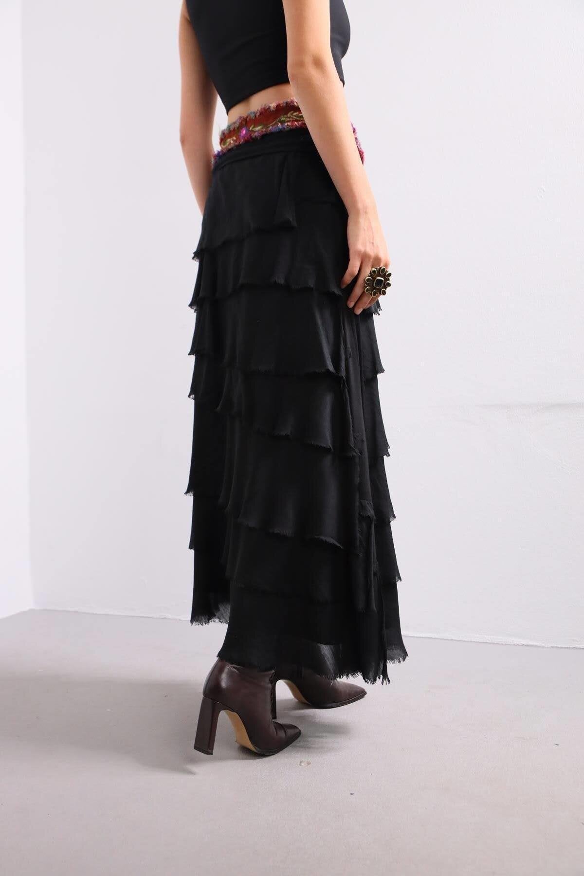 - Crafted with multiple flowing tiers, this black skirt creates a dynamic, undulating silhouette that moves beautifully with every step. The subtle raw edge detailing on each layer adds a touch of bohemian chic and modern character.