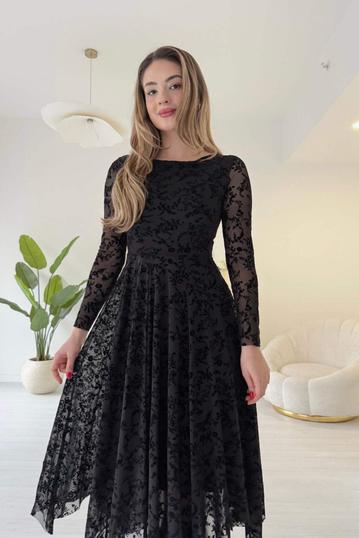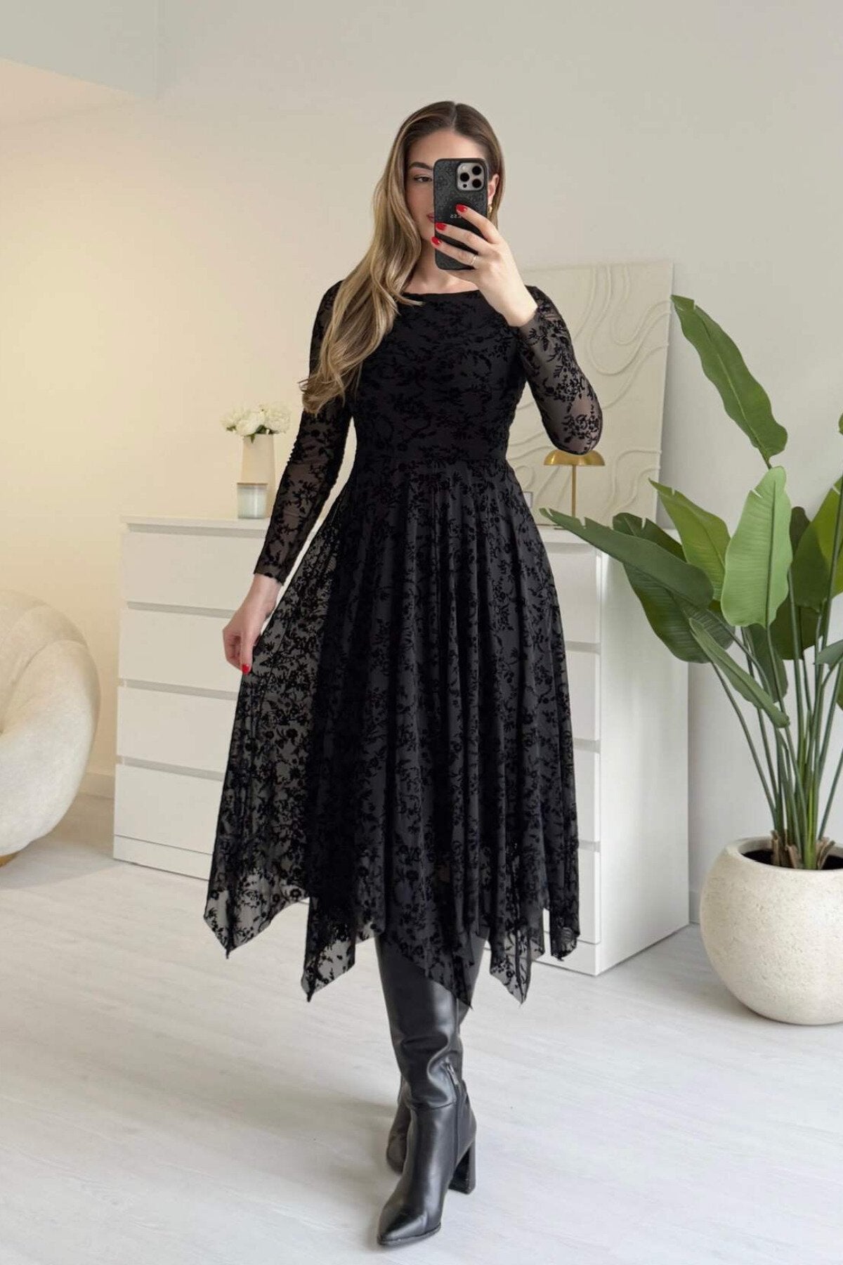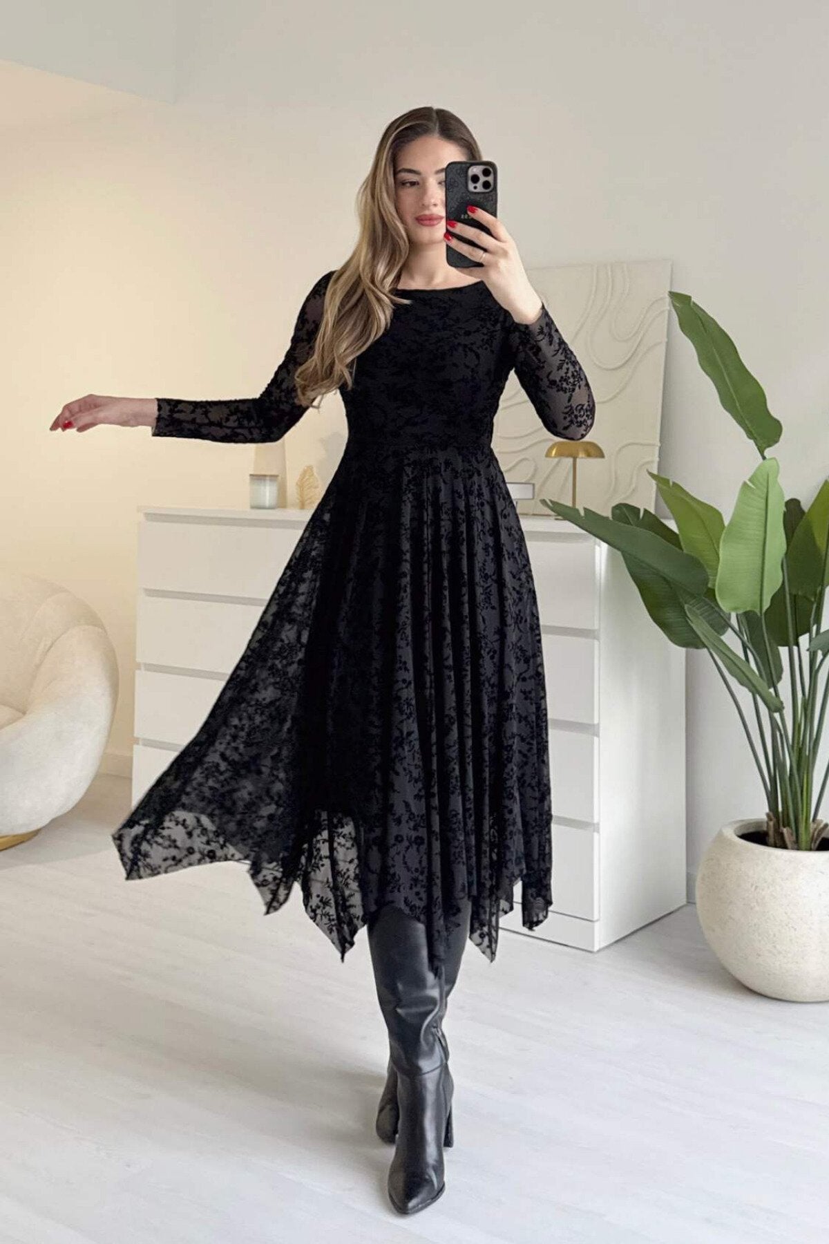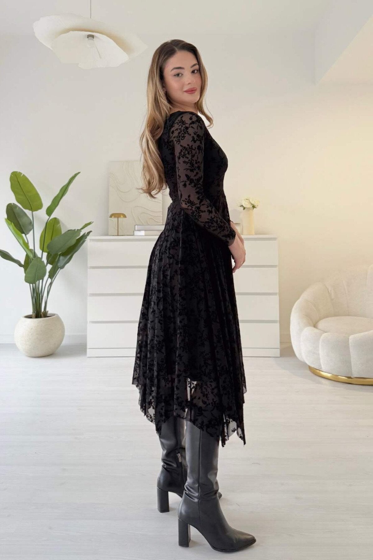 Asymmetric Long Skirt Flock Print Dress - Black
