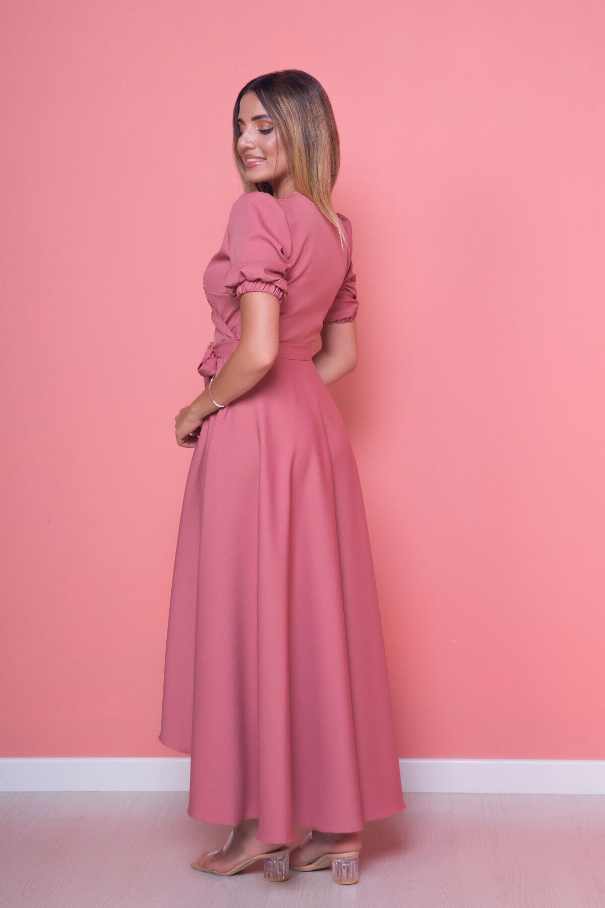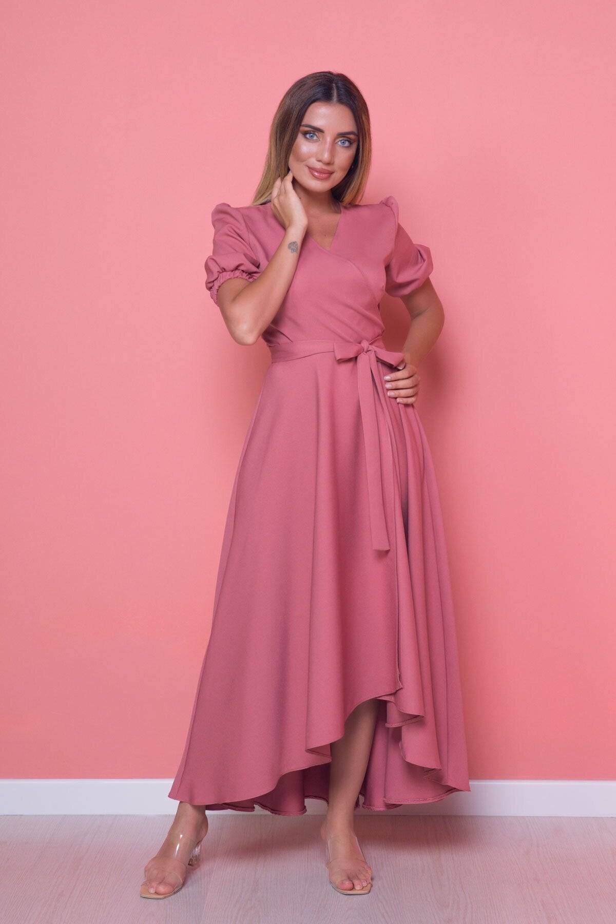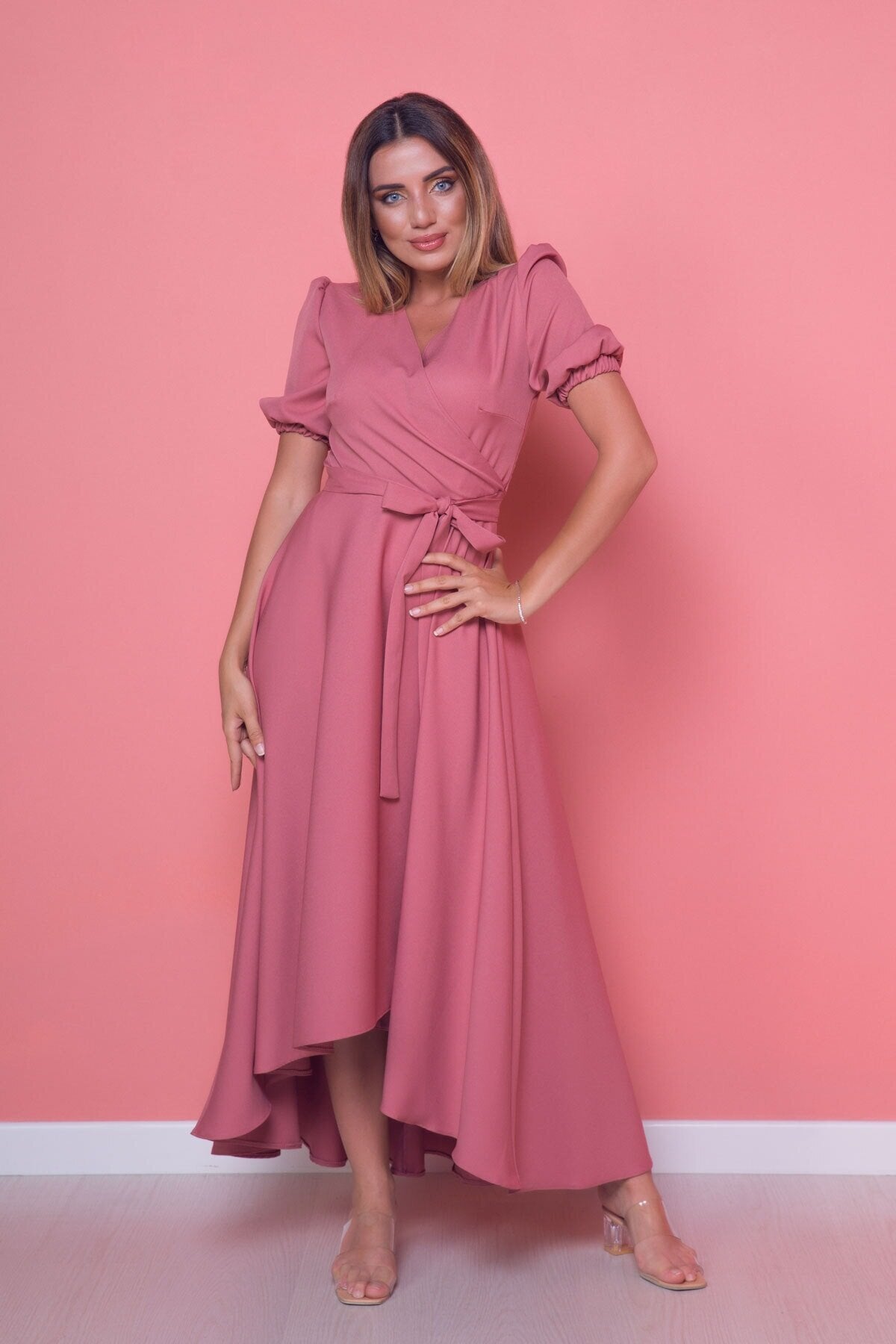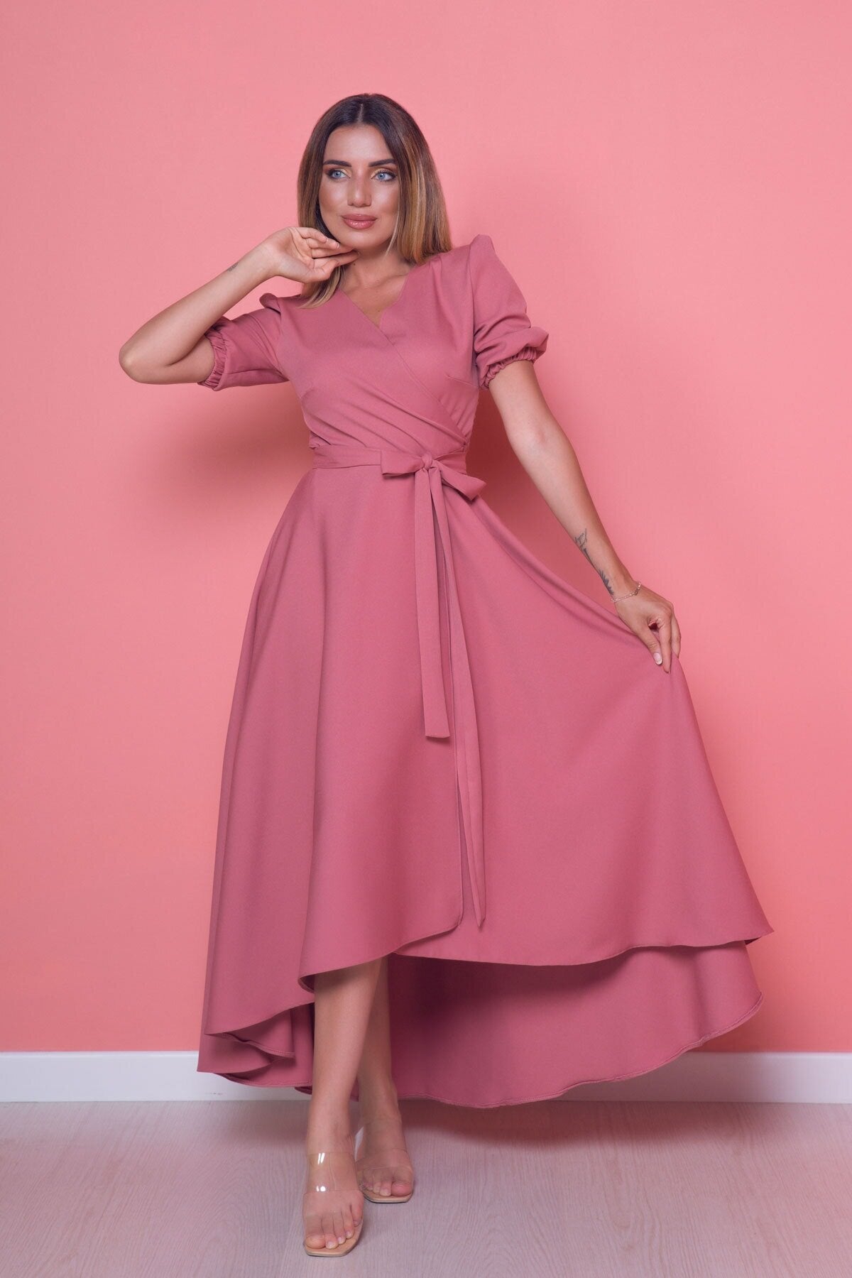 Fabric Type: Woven; Material: Crepe; Sleeve Type: Short Sleeve; Pattern: Plain; Color: Pink; Fit: Regular; Neckline: Wrap; Closure Type: Zippered; Sleeve Length: Short; Product Detail: Belted; Pocket: No Pockets; Collection: Modest; Thickness: Medium; Lining: Unlined; Length: Midi; Persona: Fashion Forward; Silhouette: Asymmetric; Occasion: Casual/Daily; Weave Type: Tulle; Additional Feature: Opaque; Print/Embroidery Technique: No Print; Belt/Sash: Belted; Sustainability Detail: No; Package Contents: Single Item