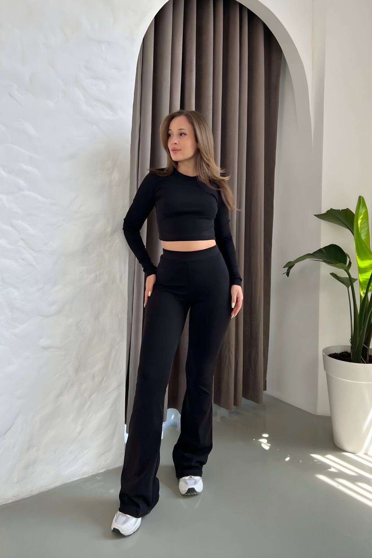 Basic Crop Flare Leg Leggings Thumbhole Set - Black