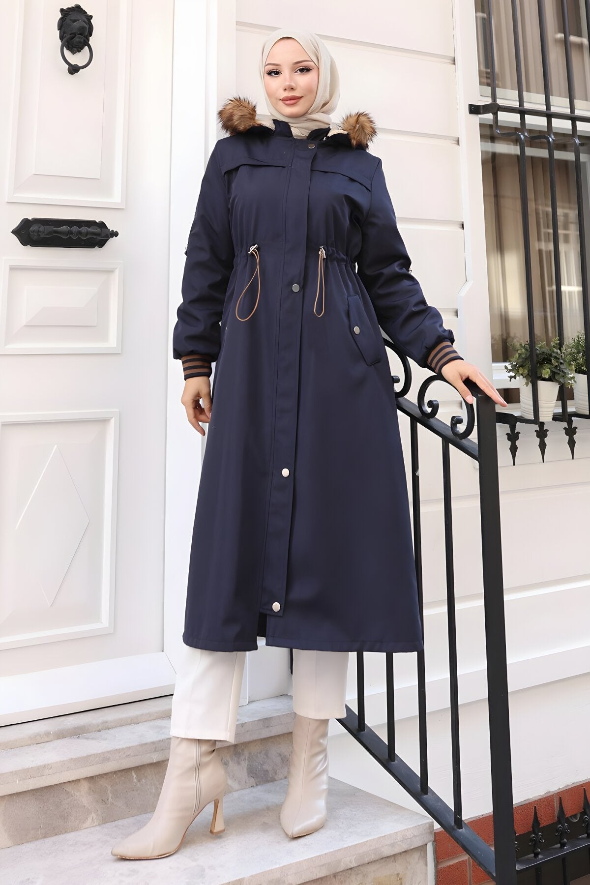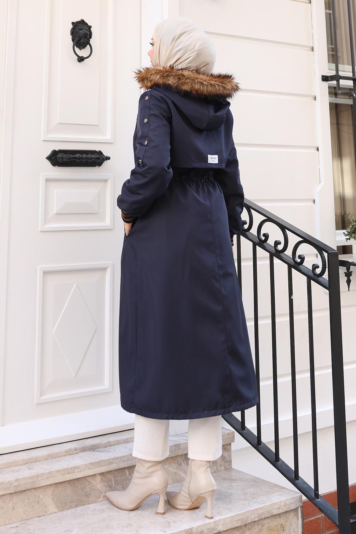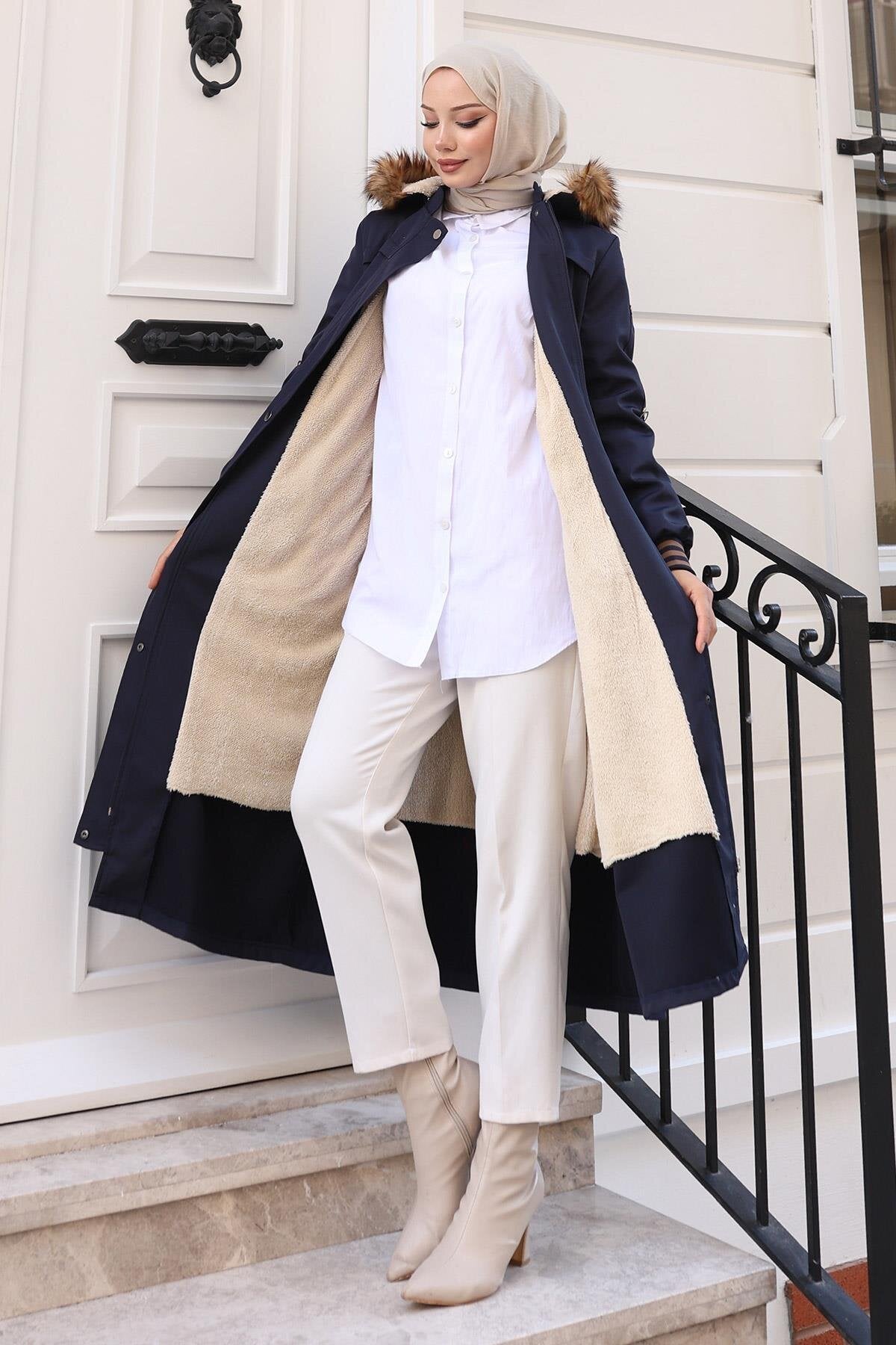 Product Features: New season modest fashion product. Fur-lined. Features a hidden front zipper. Ribbed cuffs. Drawstring waist. Pockets available. Detachable hood. Product color may show slight variation due to concept photography.