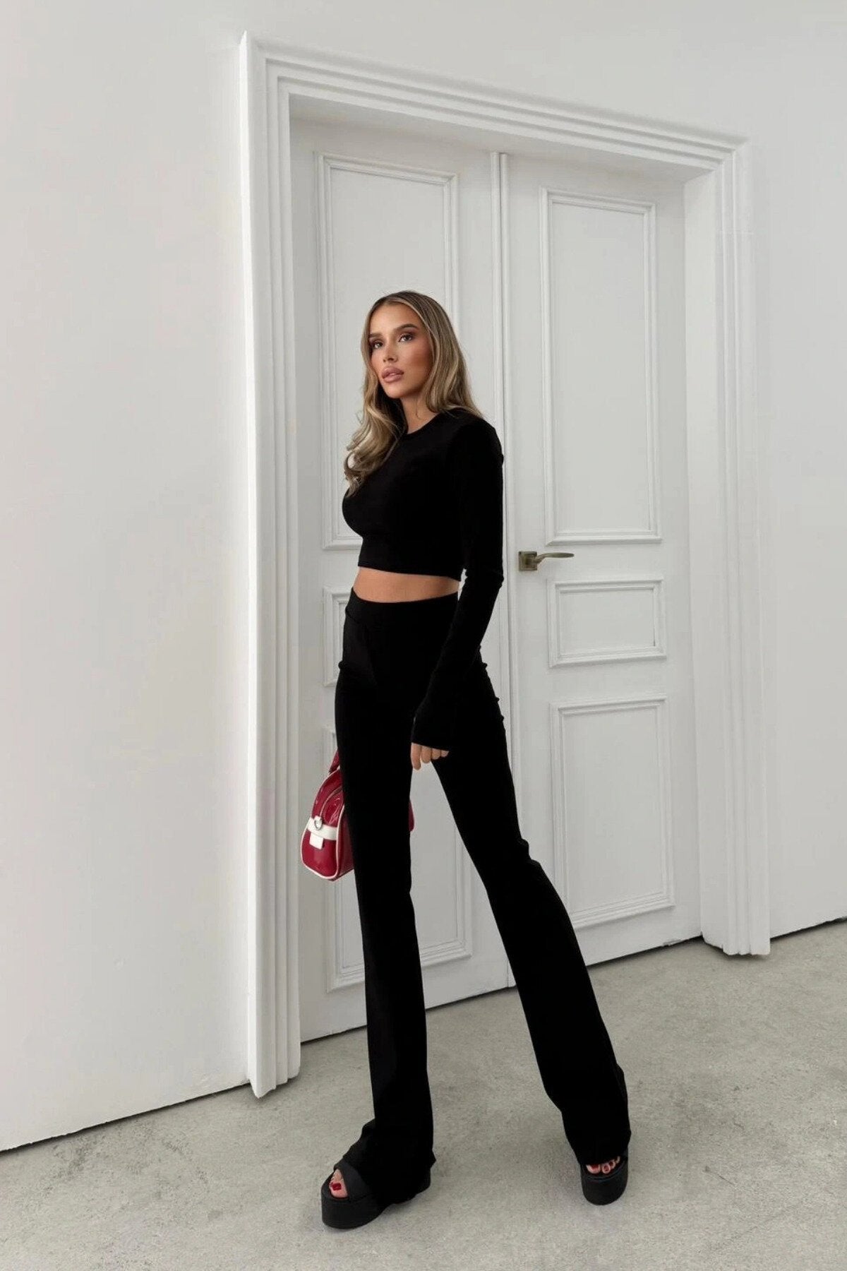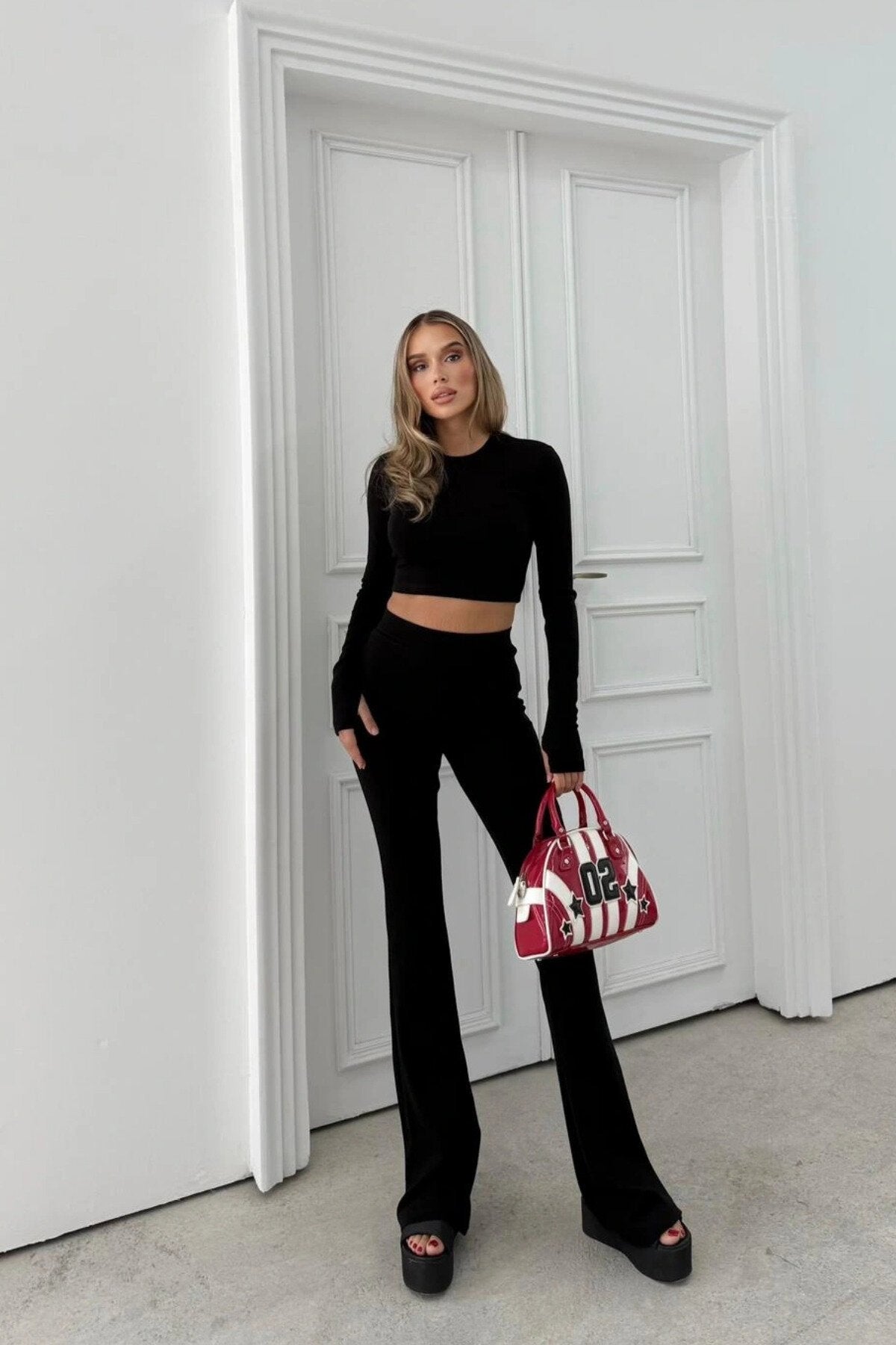 Crew Neck Flare Leg Thumb Hole Blouse Leggings Set - Black