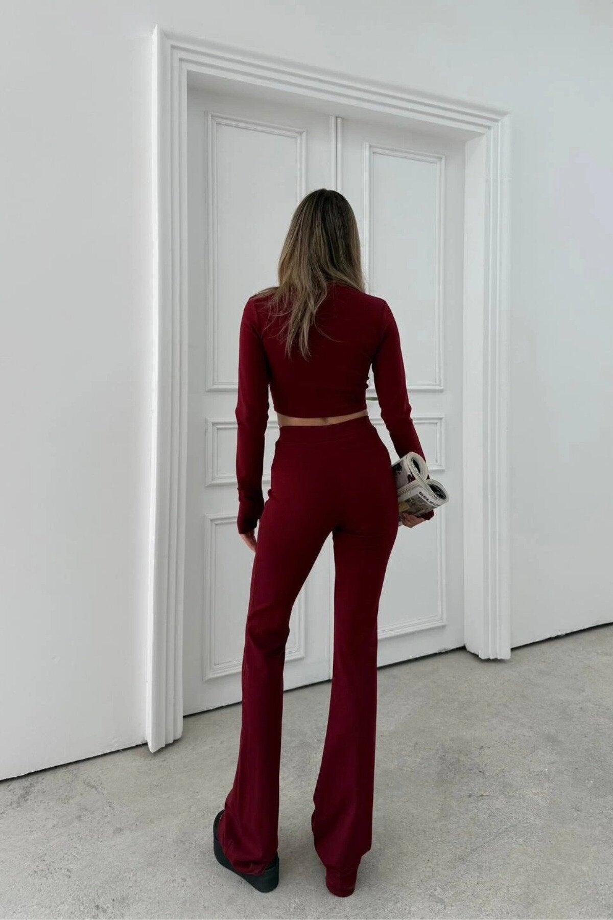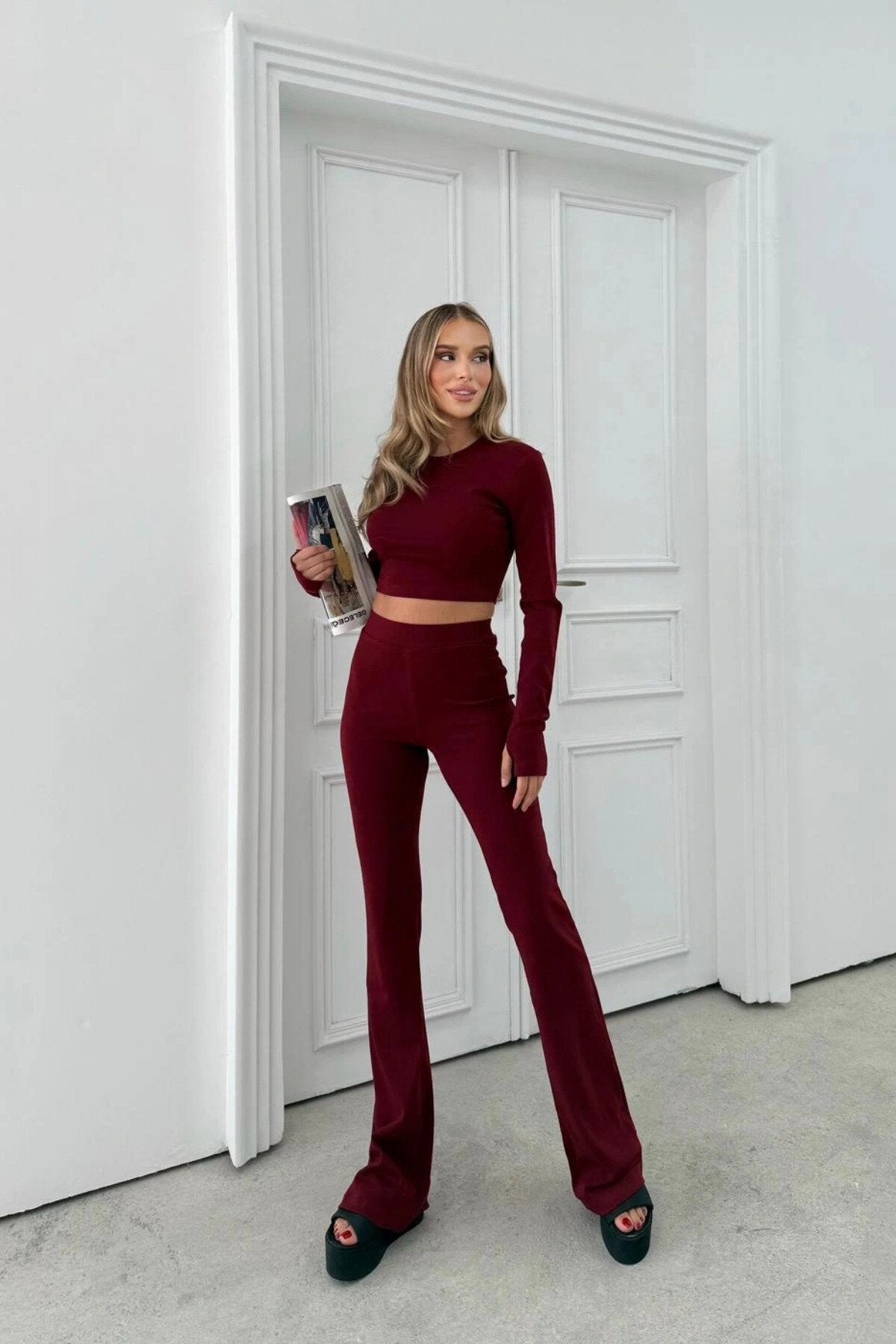 Fabric Type: Woven; Material: Cotton Polyester; Pattern: Solid; Fit: Fitted; Neckline: Crew Neck; Color: Burgundy; Product Detail: No Detail; Pocket: No Pockets; Product Type: Plain; Sleeve Length: Long; Sleeve Type: Standard Sleeve; Collection: Design; Thickness: Medium; Waist: High Waist; Leg Type: Flare Leg; Silhouette: Fitted; Style: Trendy; Length: Crop; Set Type: Leggings-T-shirt; Additional Feature: Stretchy; Weave Type: Ribbed; Persona: Cool & Comfort; Belt Status: No Belt; Print/Embroidery: No Print; Number of Pieces: 2; Lining Status: Unlined; Sustainability Detail: Yes; Package Contents: 2-Pack; Season: Winter; Origin: Turkey; Box Status: No Box; Closure Type: Mono Closure;