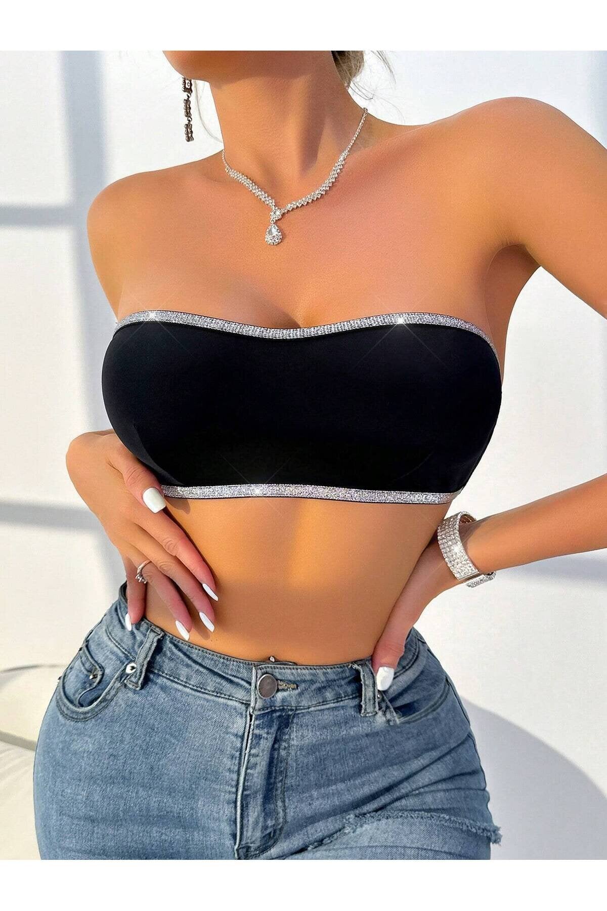 Crop Strapless Shimmery Crossed-Elastic Bustier - Black