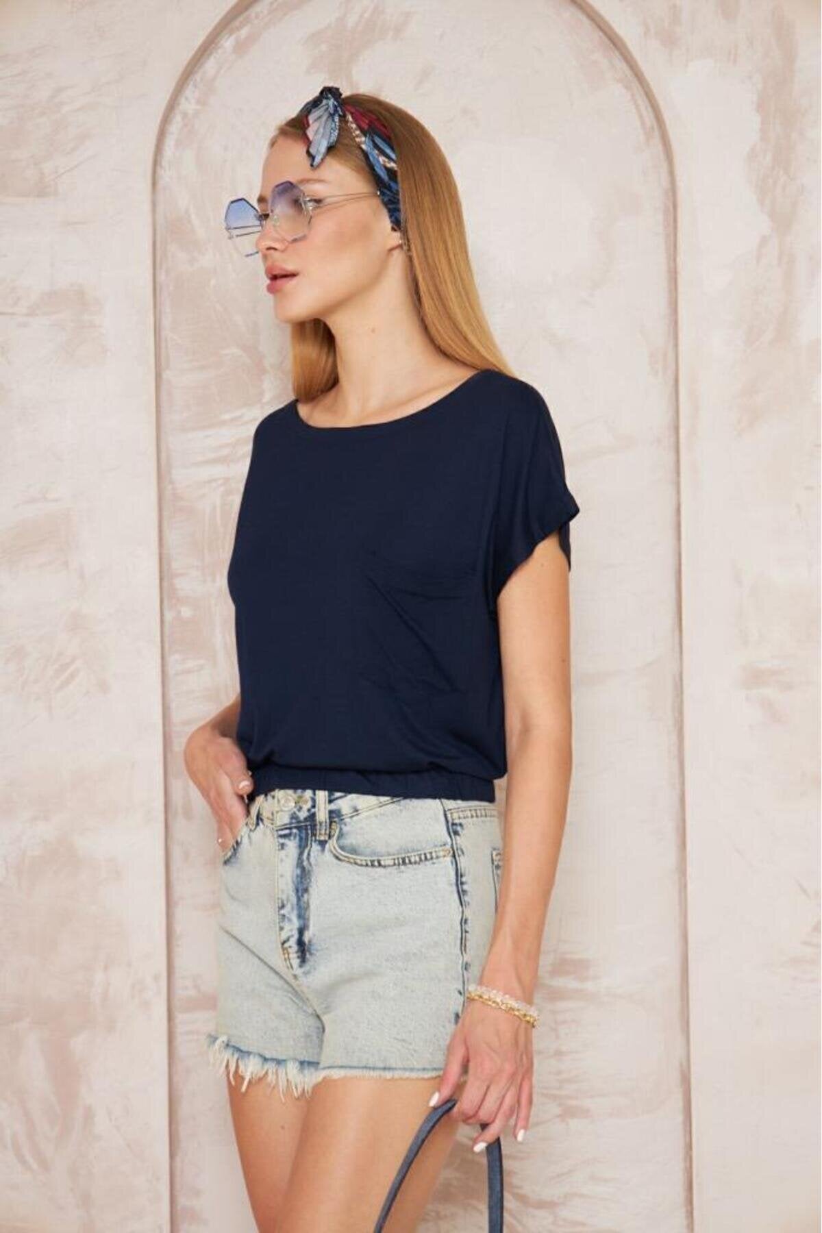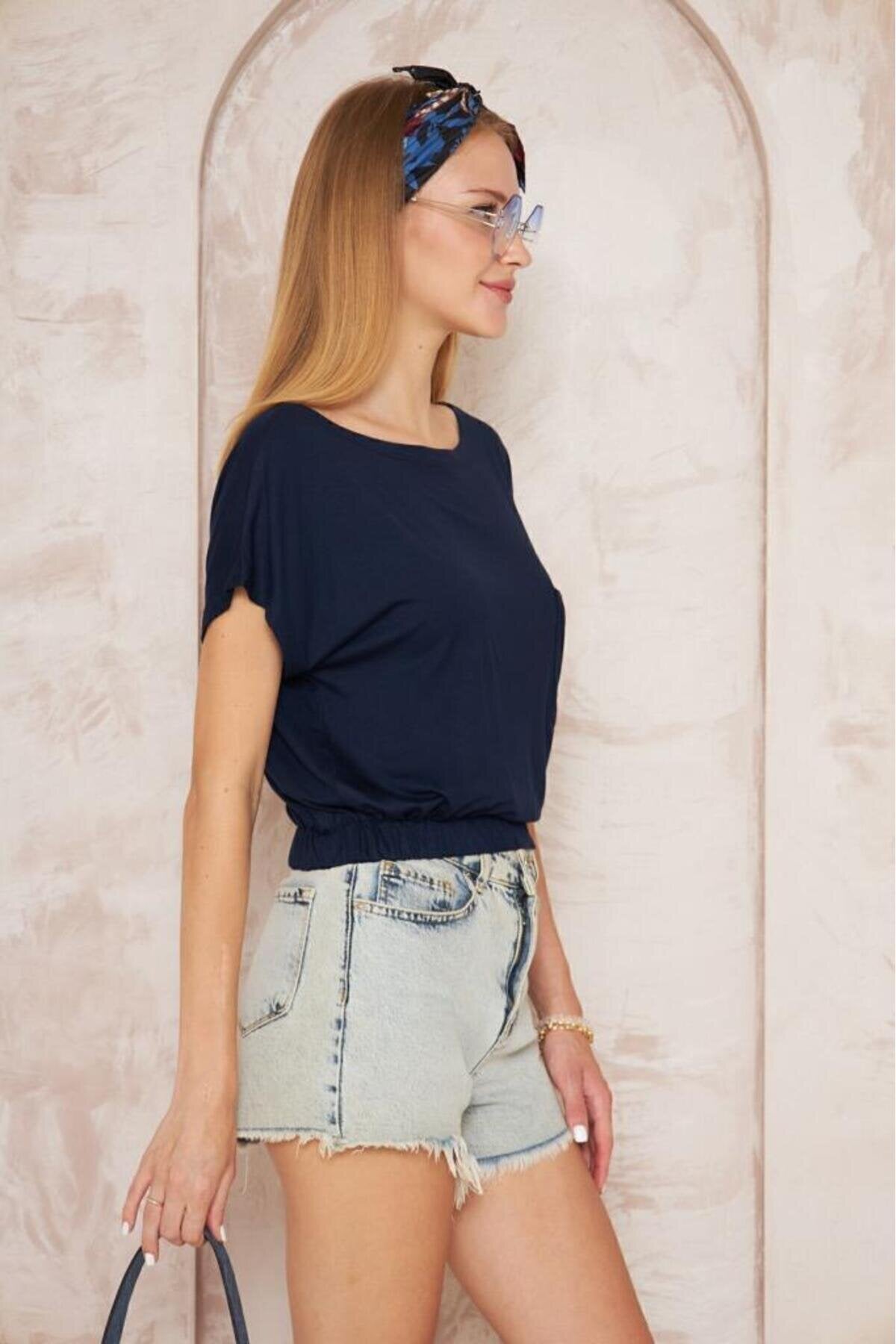Cropped Elasticated-Hem Blouse - Navy