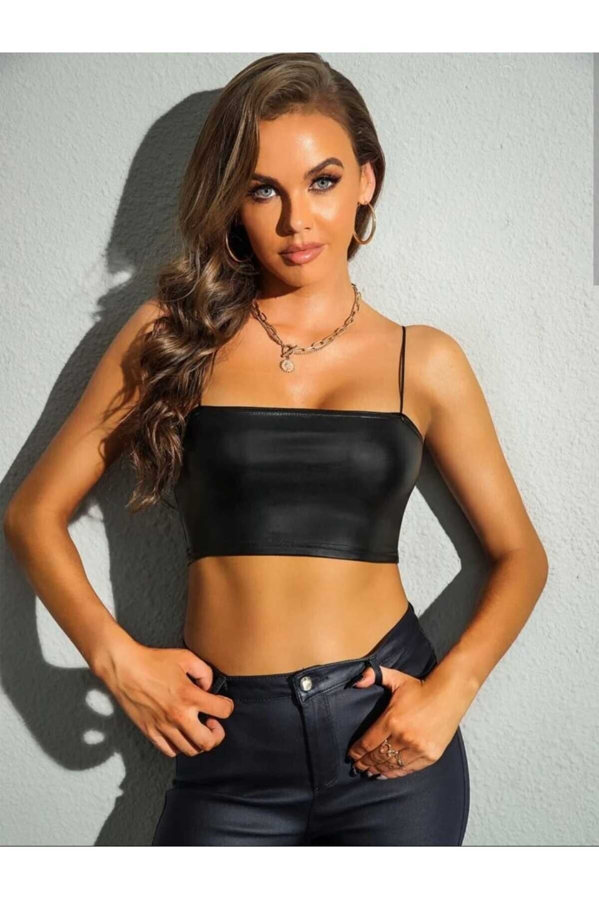 Cropped Leather Thin-Strap Bustier - Black