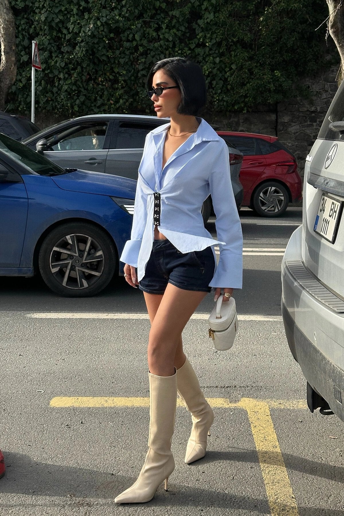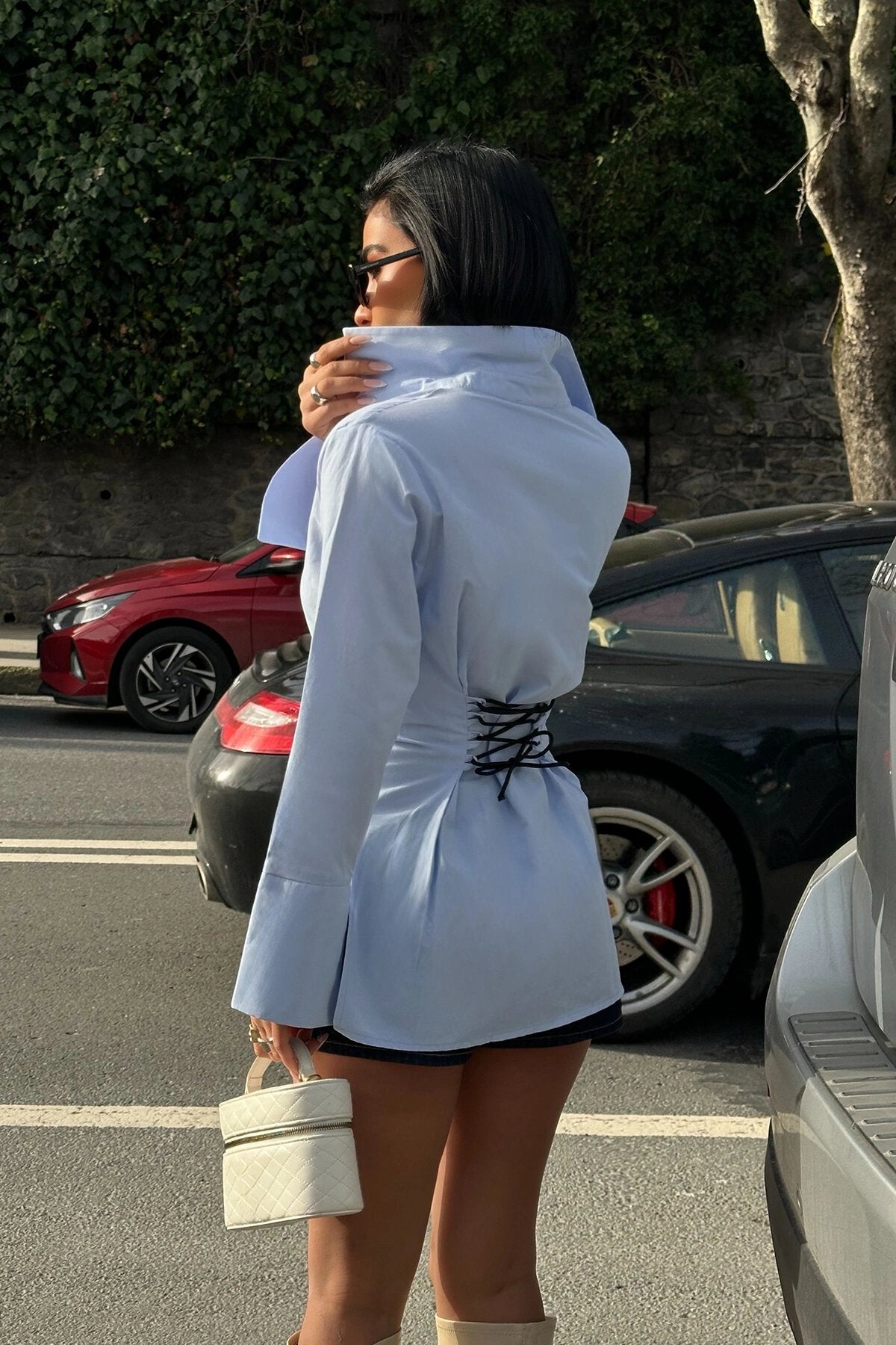 Design Hook Closure Back-Tie Detail Shirt - Baby Blue
