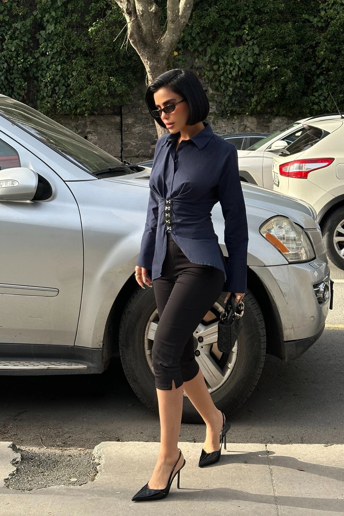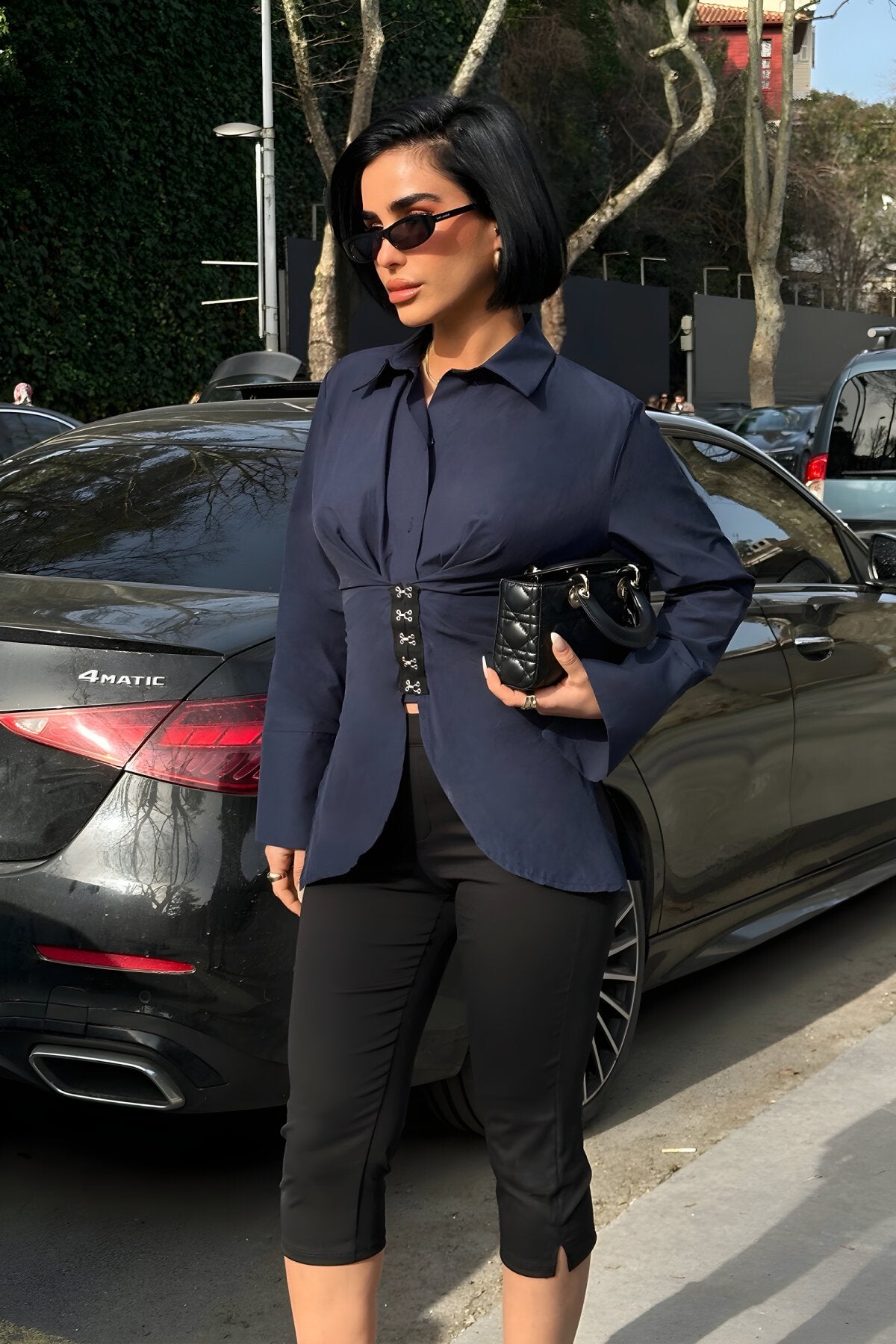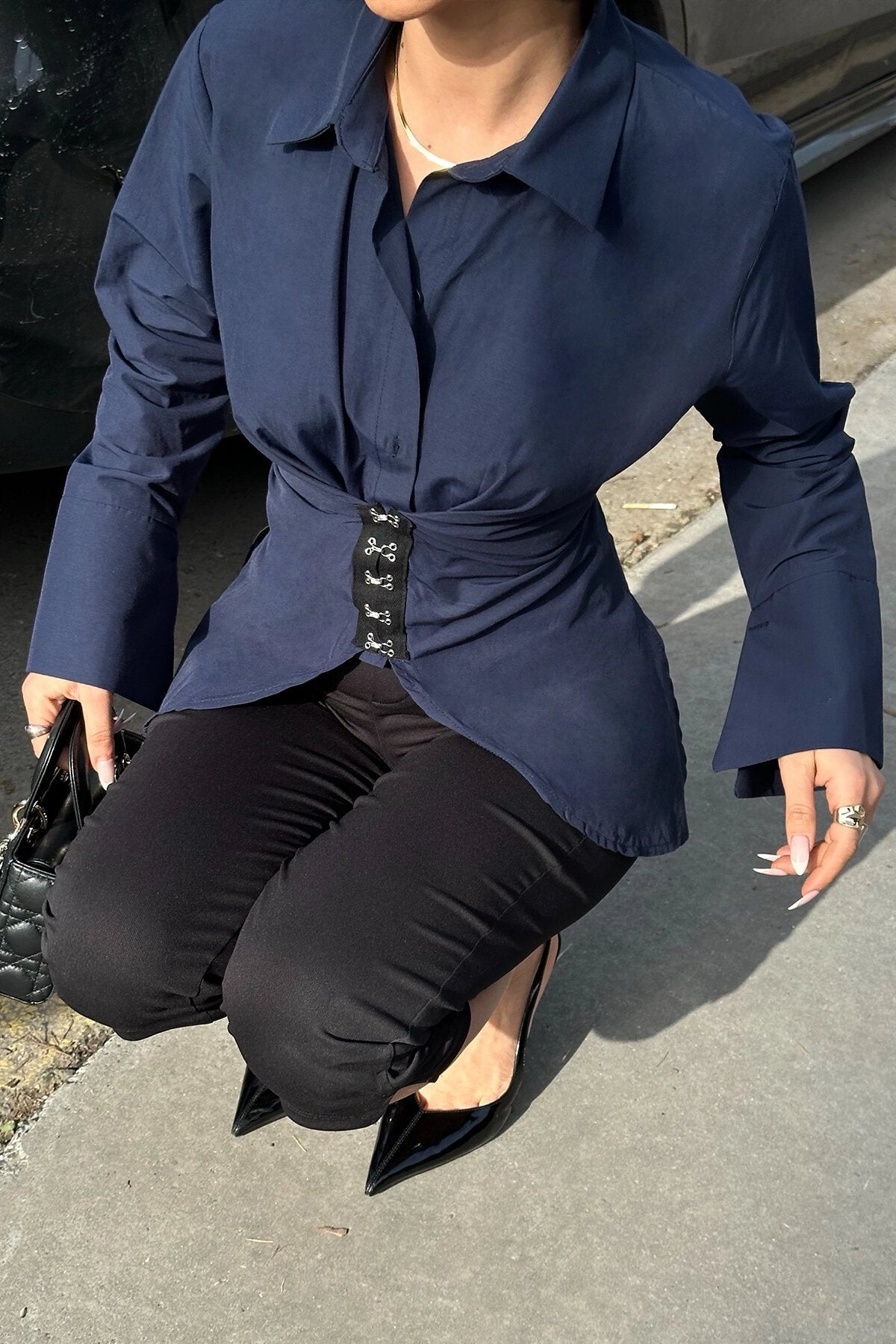 Designer Hook-Closure Back-Tie Shirt - Navy