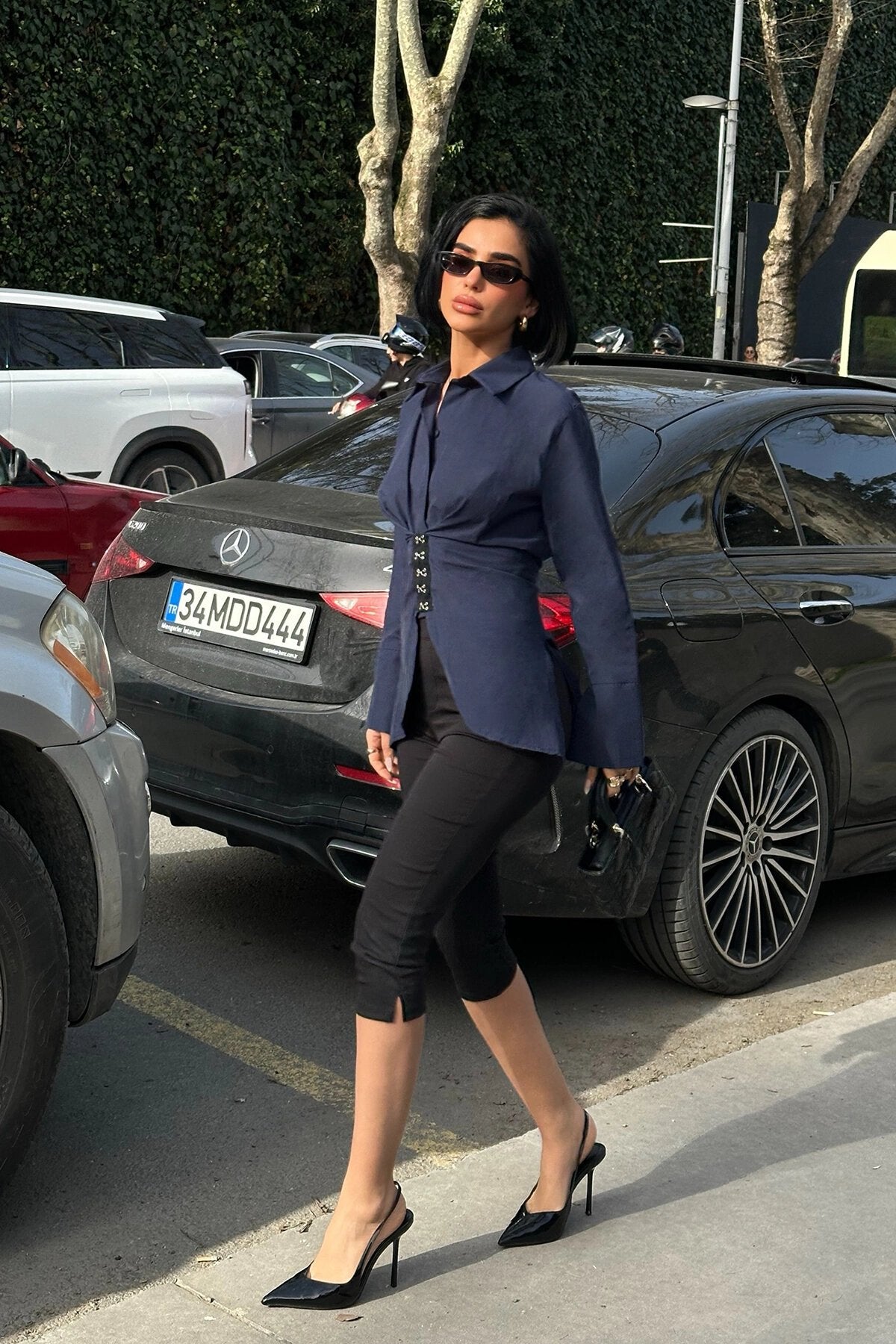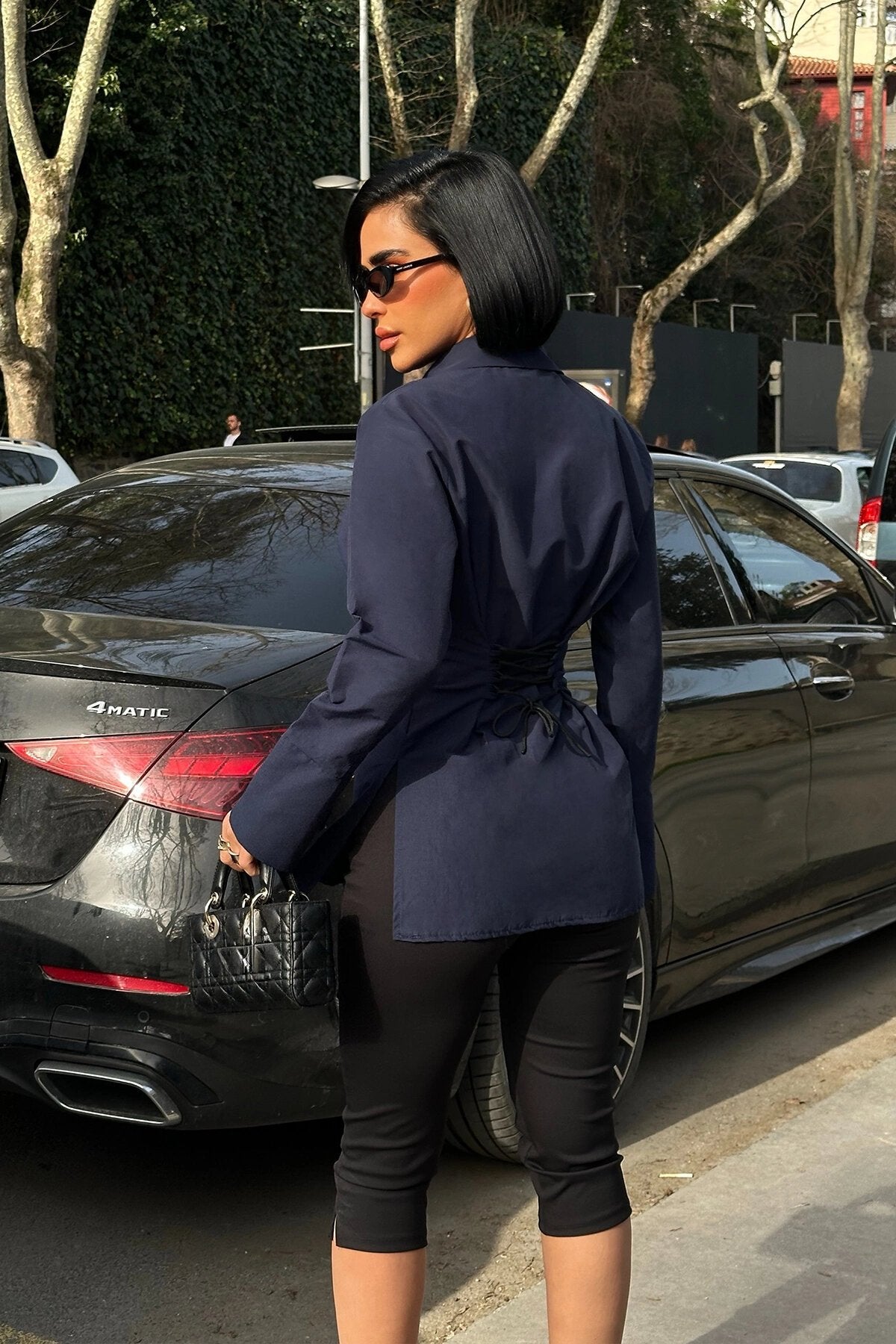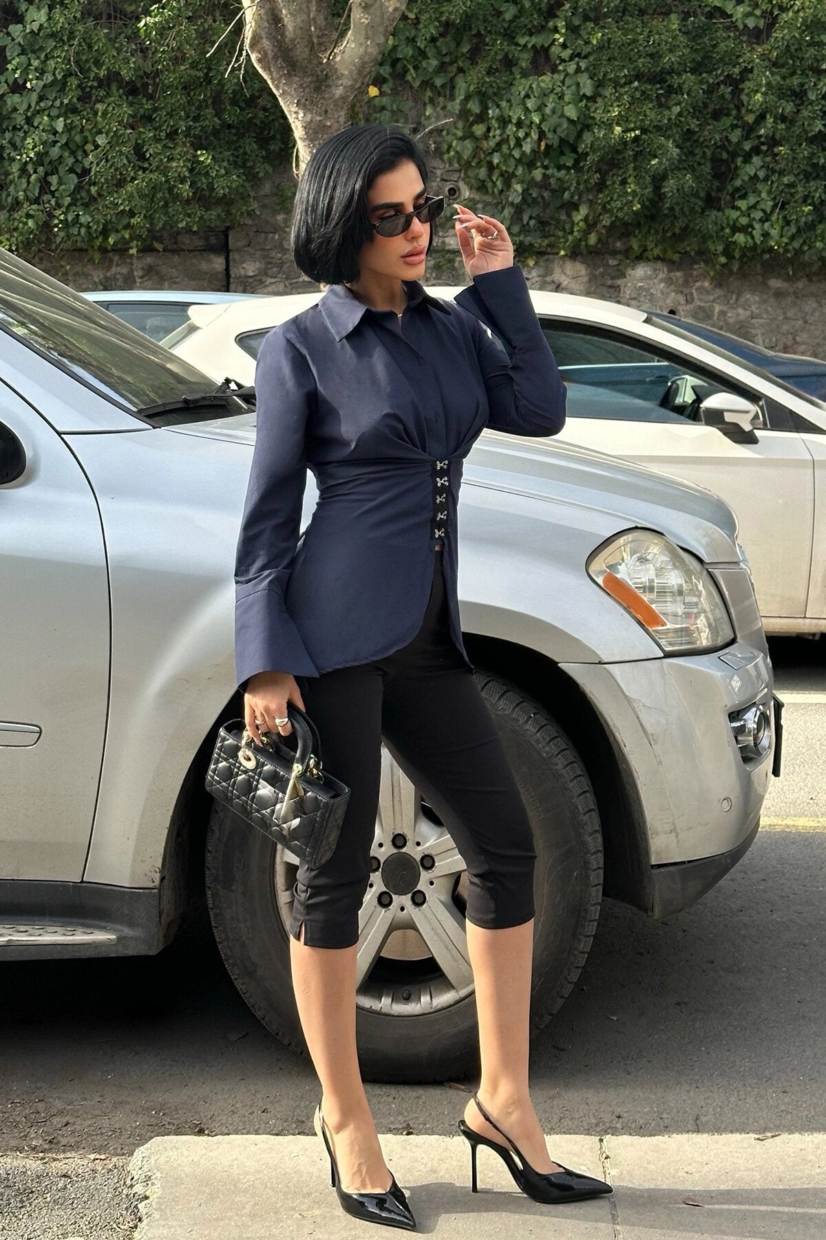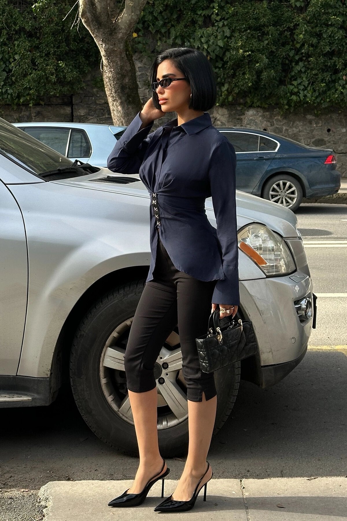 Designer Hook-Closure Back-Tie Shirt - Navy