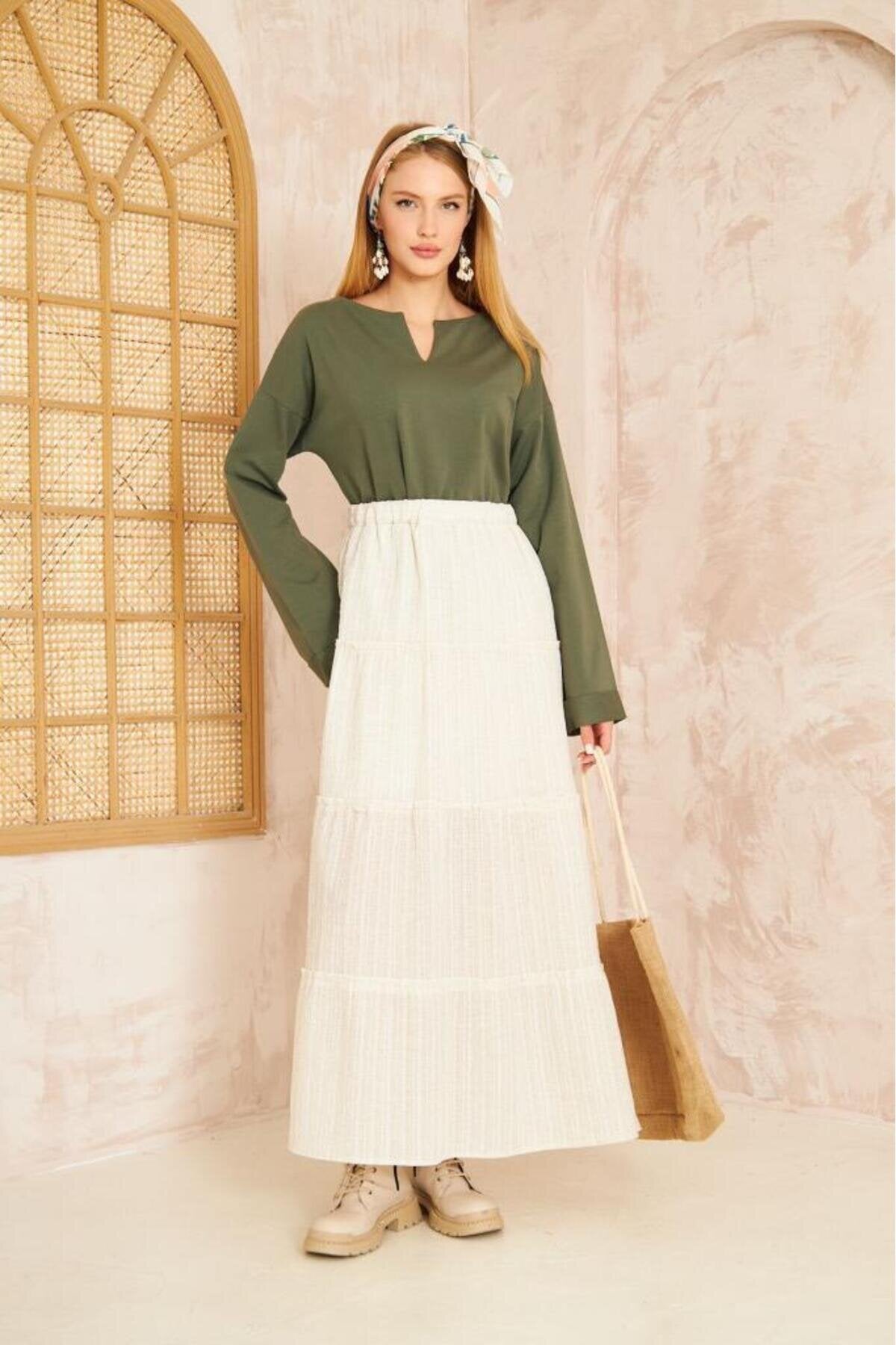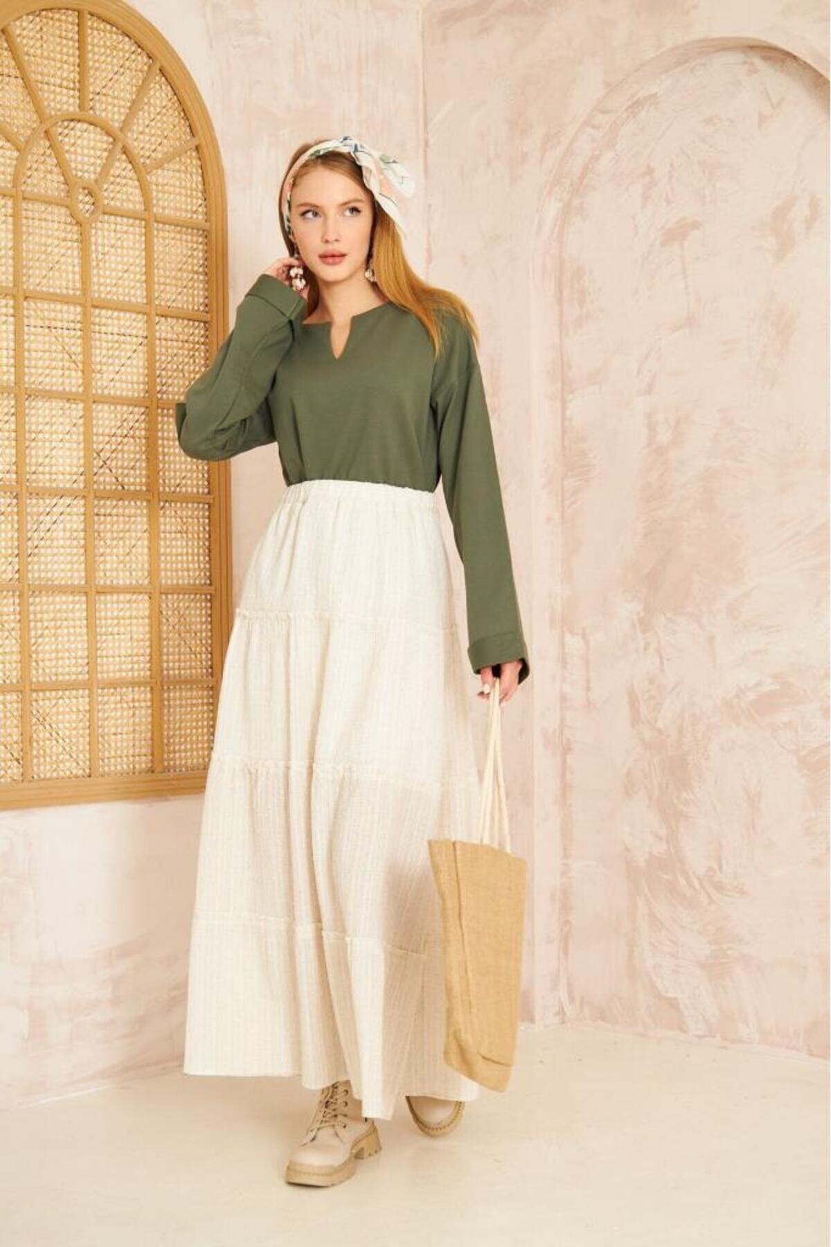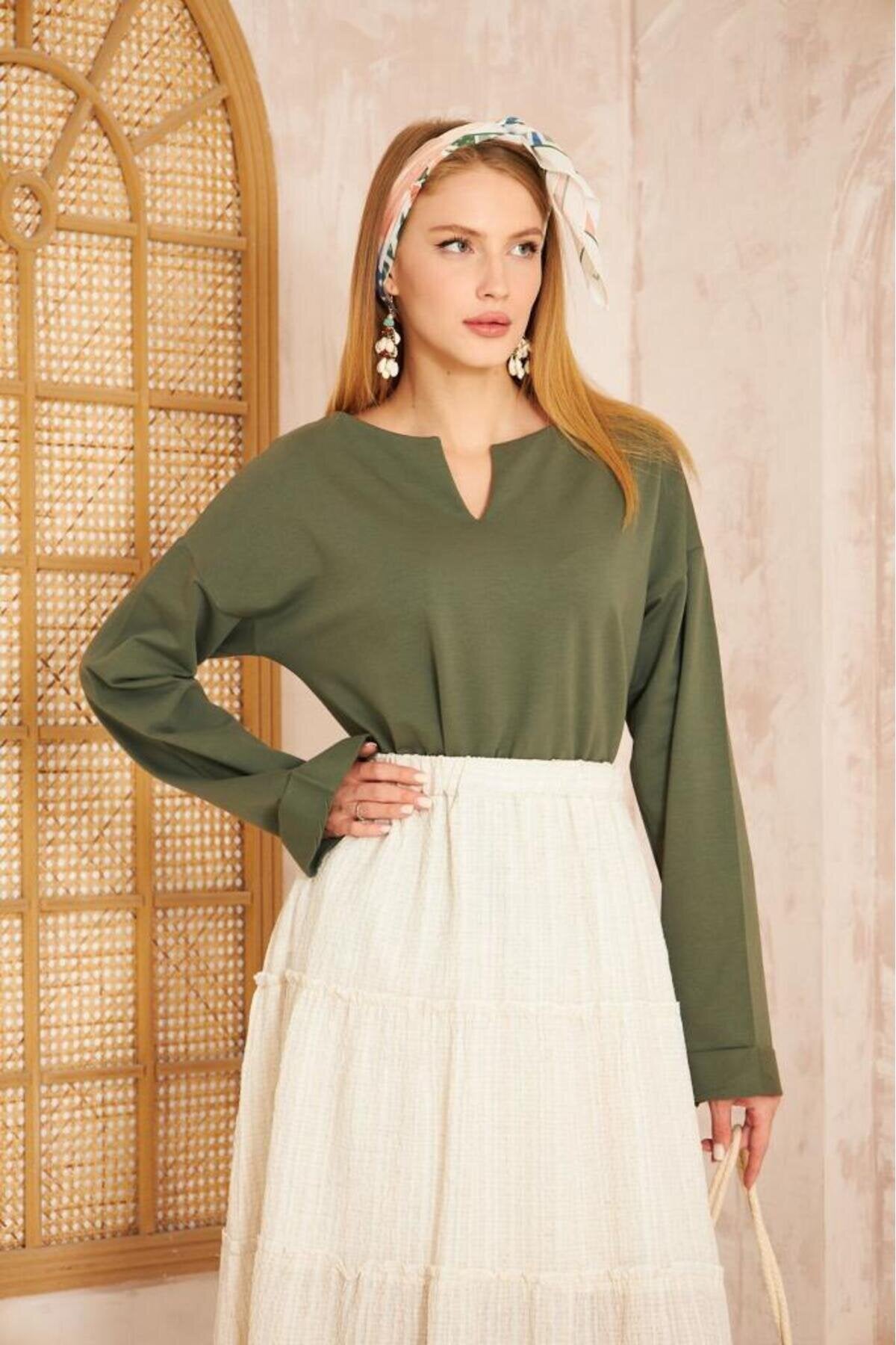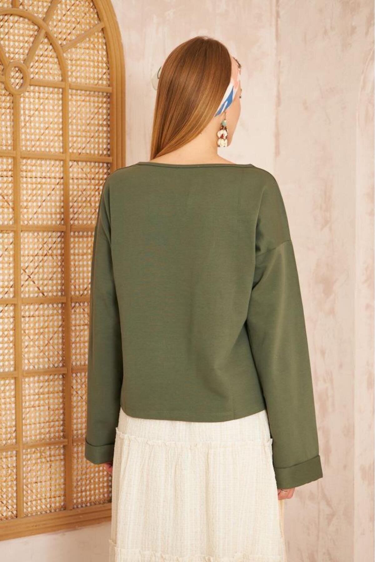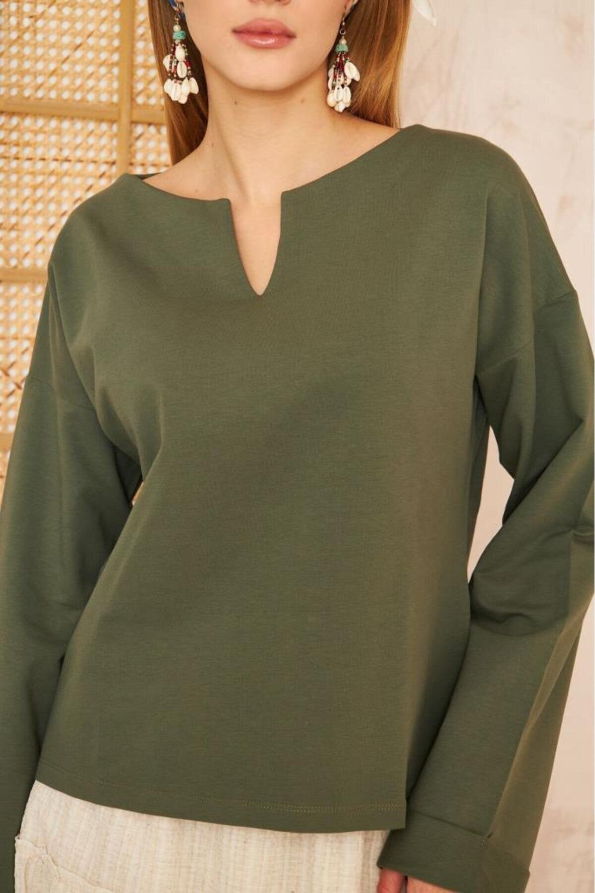 Extra Long Slouchy Cuffed Slit Collar Sweatshirt - Khaki