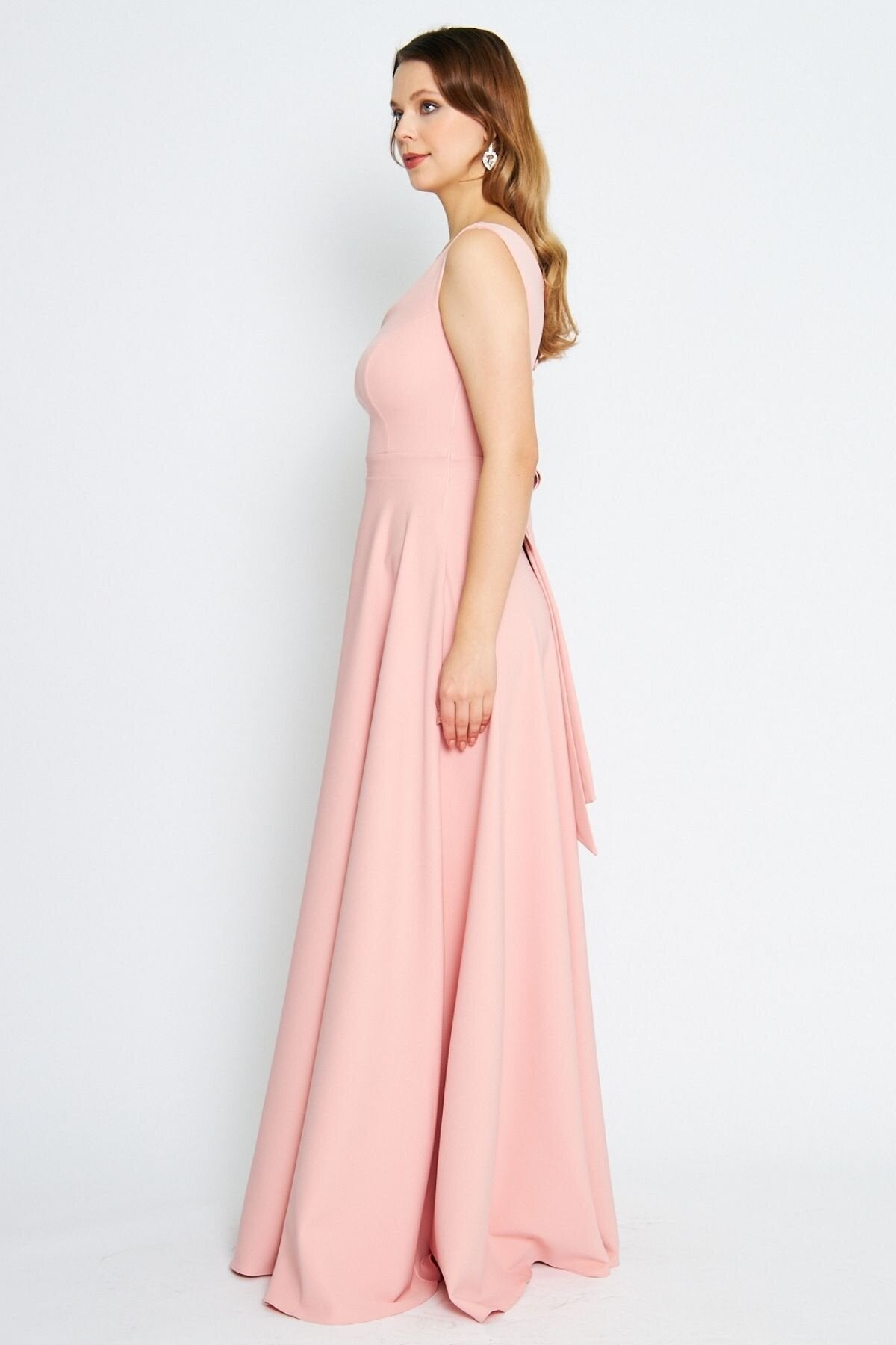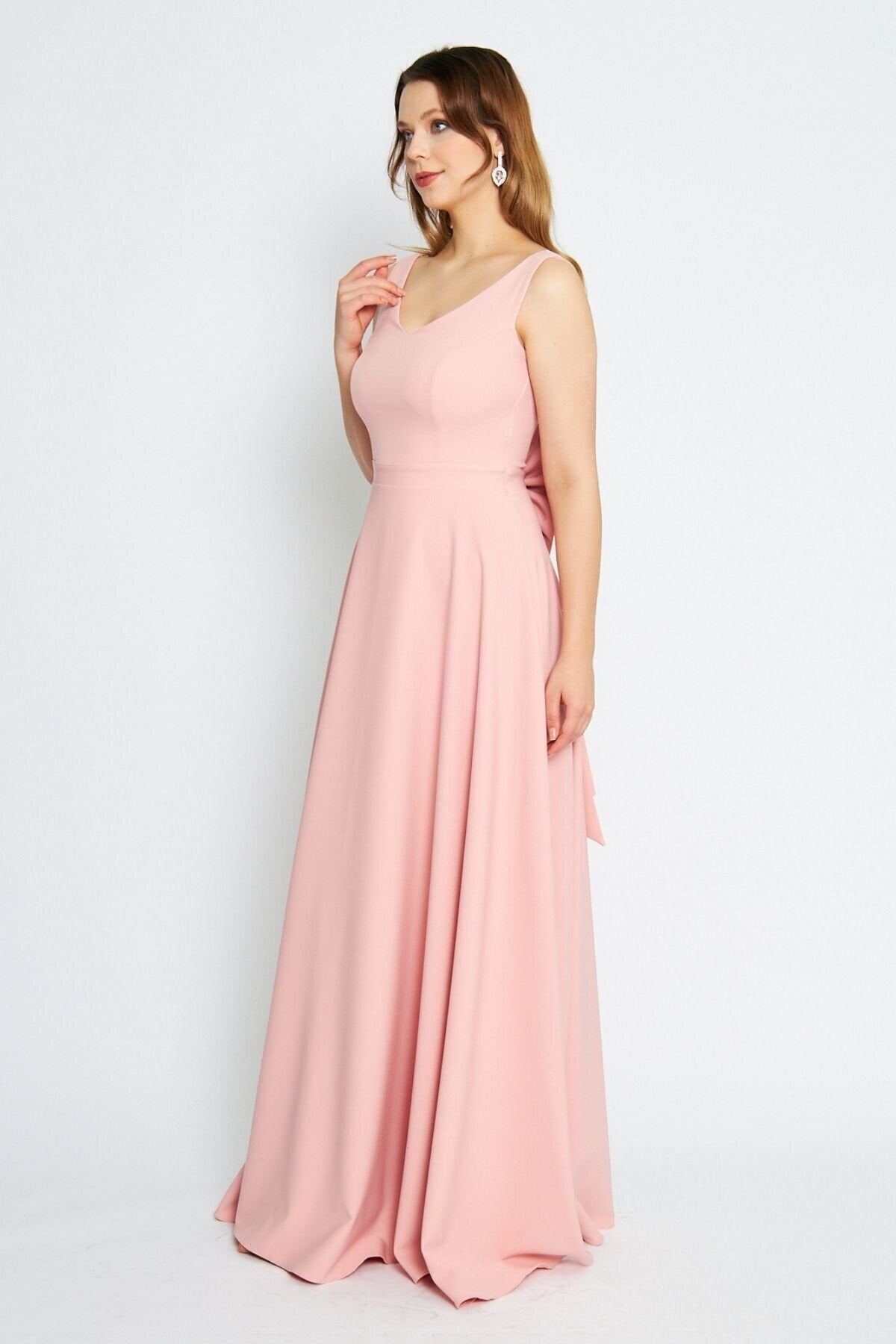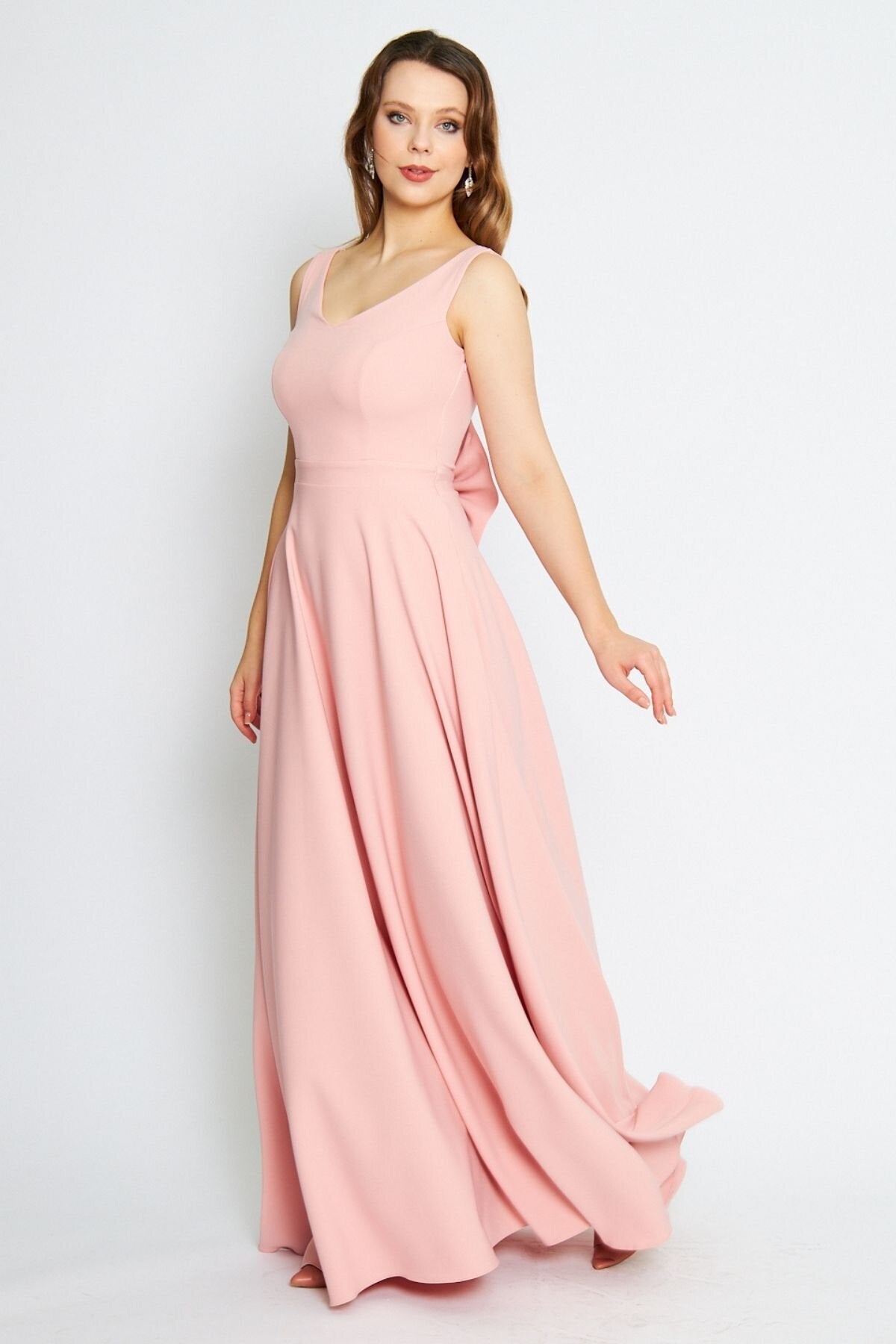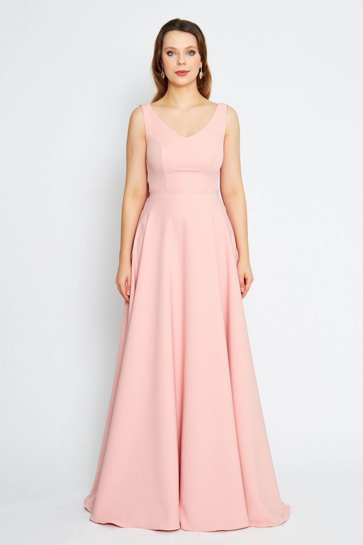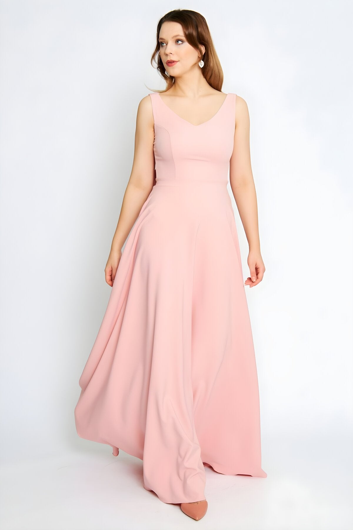 This stunning powder pink evening dress captures the essence of sophisticated femininity. Its classic A-line silhouette is expertly crafted to glide beautifully as you move, creating a romantic and modern look that is sure to turn heads at any formal gathering.