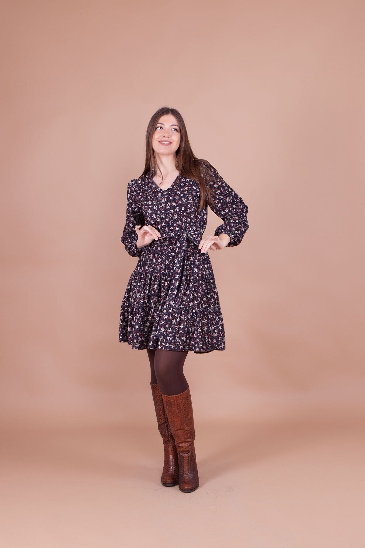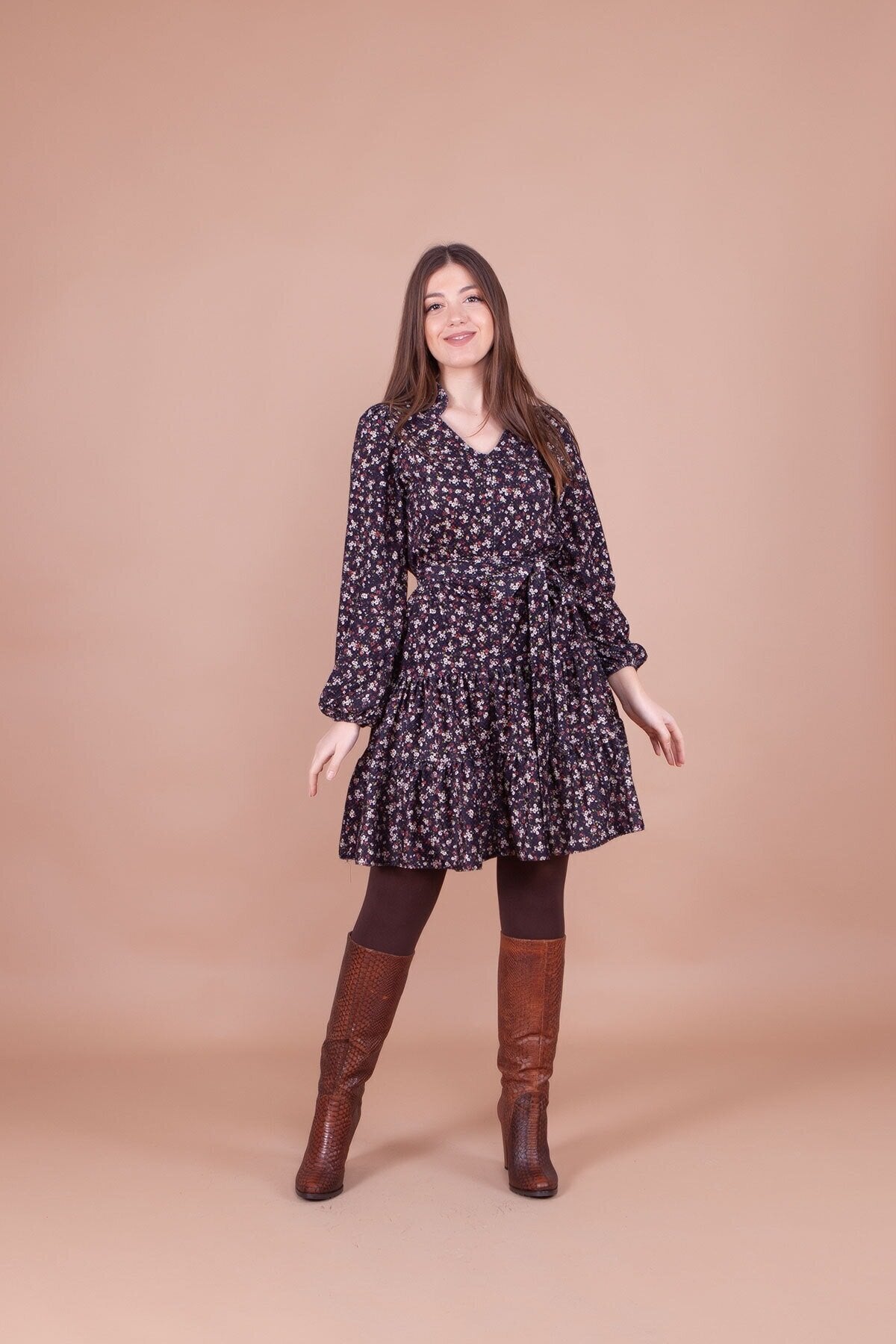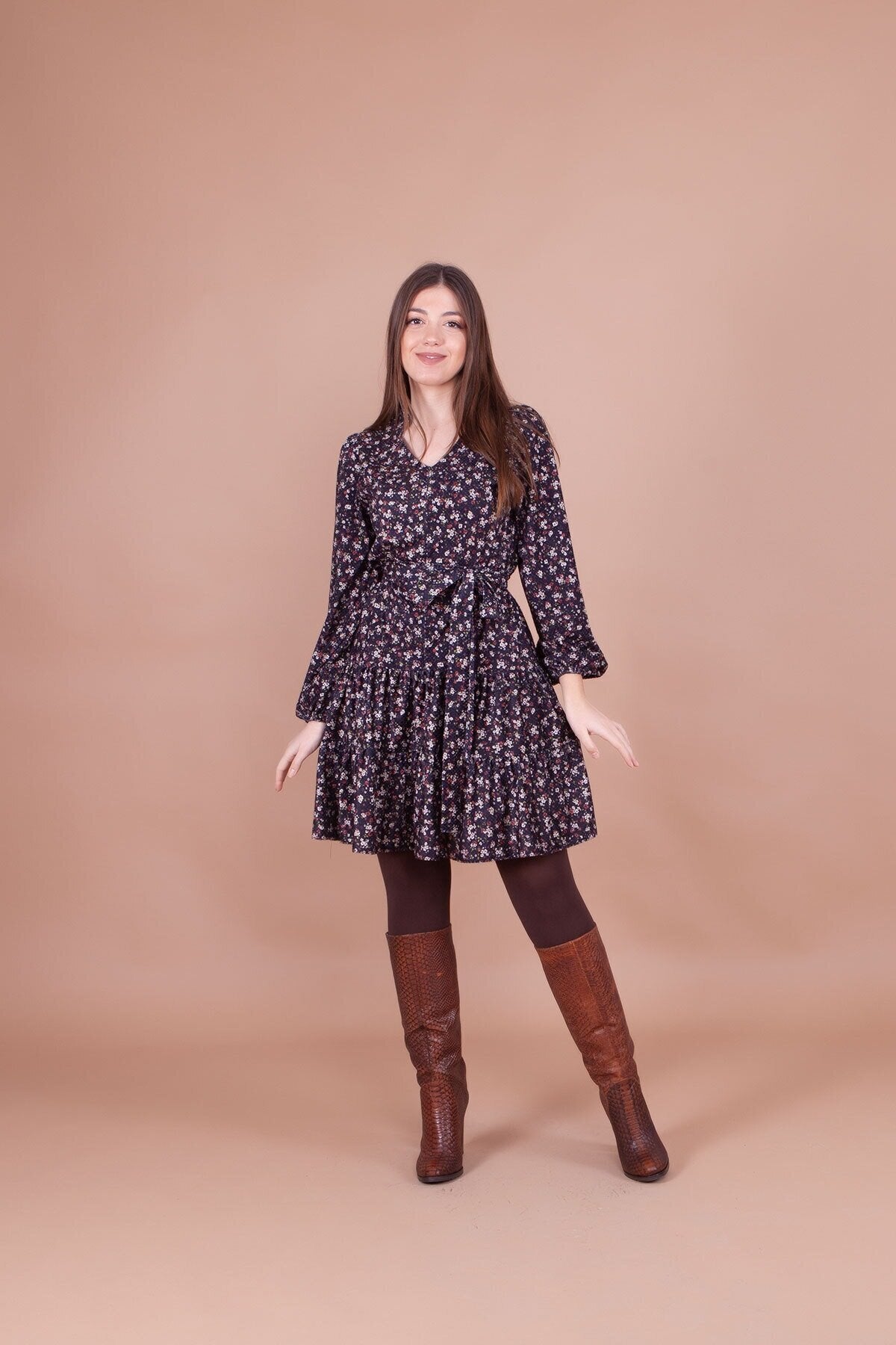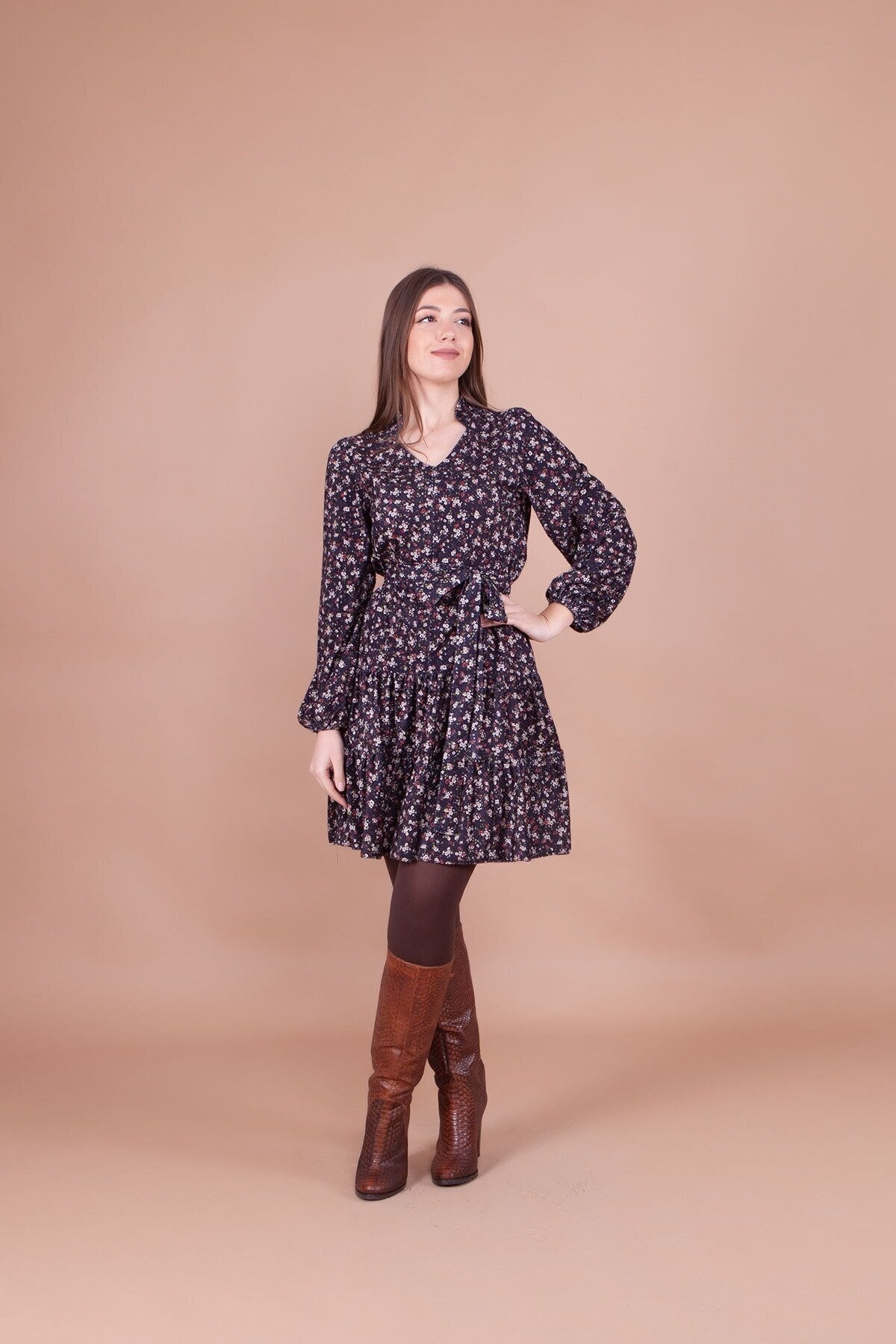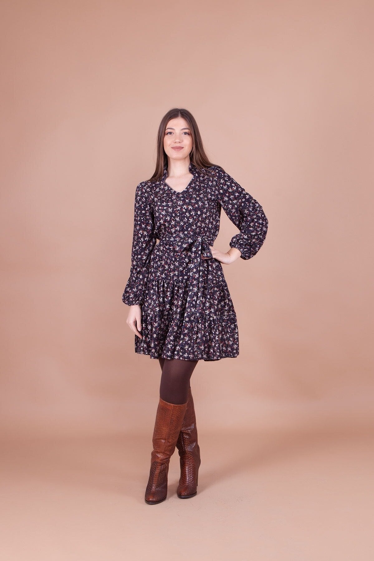 Floral Patterned Mini Collar Detail Dress - Black