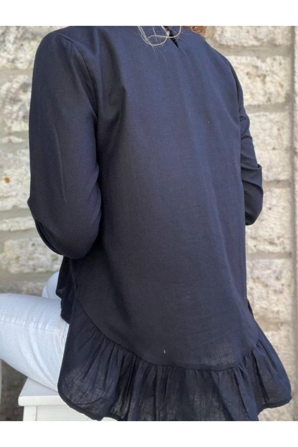 High-Low Cotton Linen Ruffled Blouse - Black