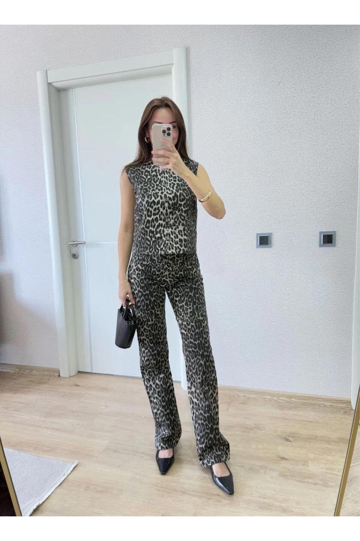 This striking two-piece set redefines modern coordination with its bold, monochromatic leopard pattern. The sleeveless blouse paired with matching trousers creates a cohesive, high-fashion silhouette that effortlessly balances an edgy animal print with refined, polished tailoring.