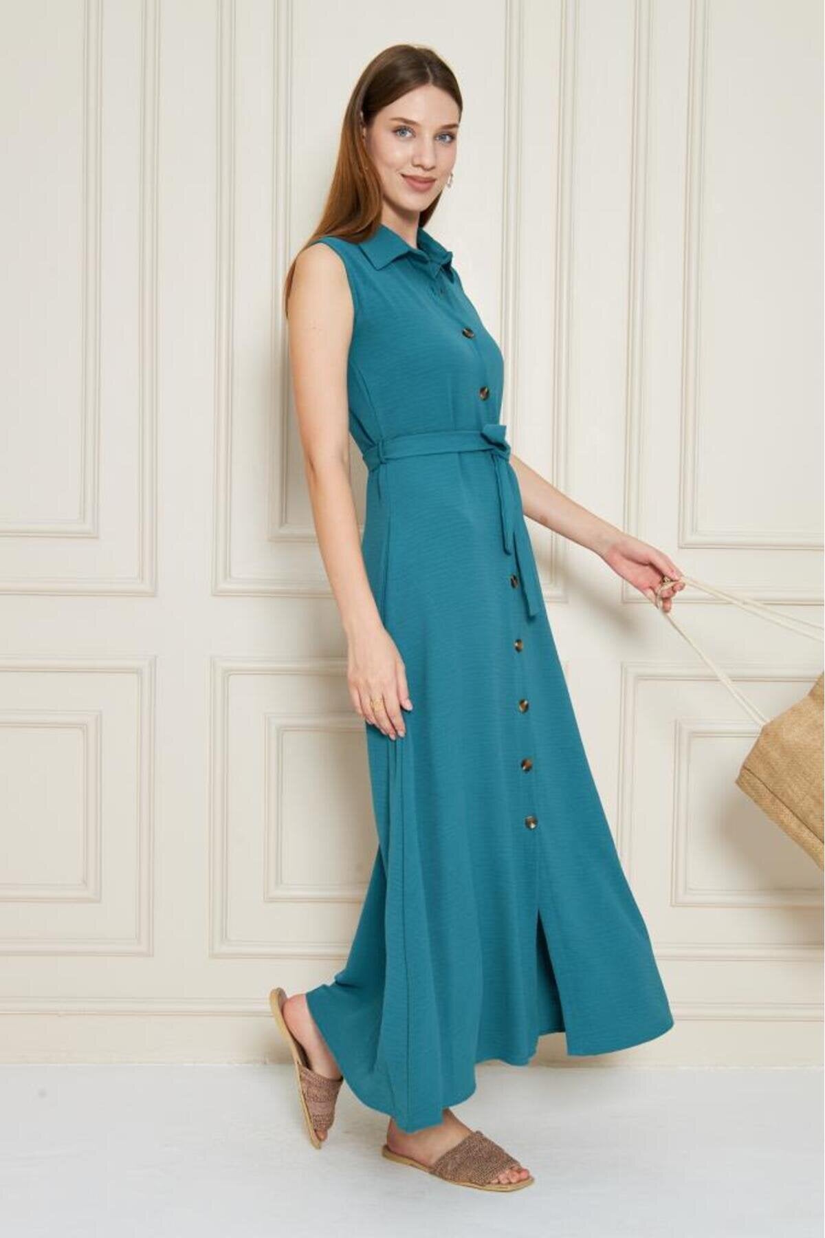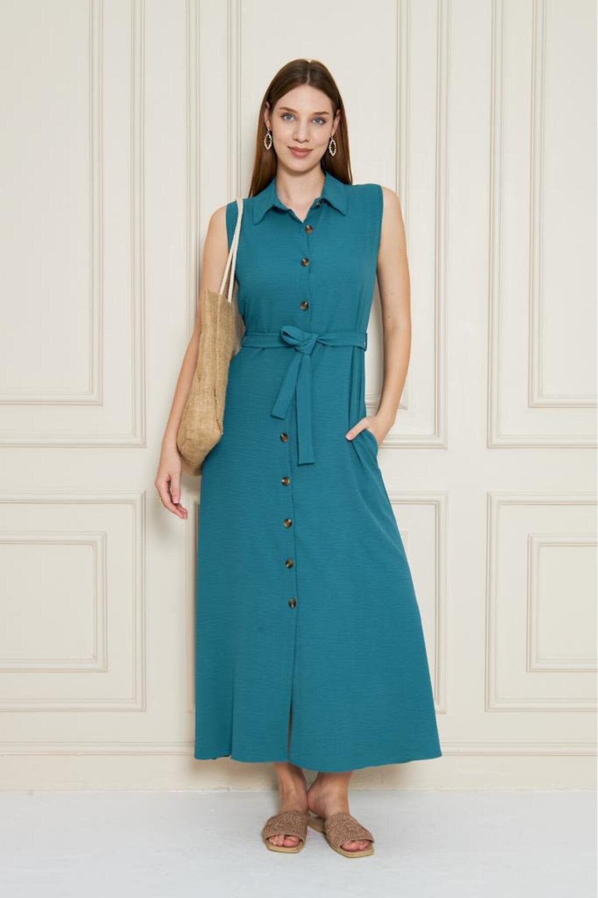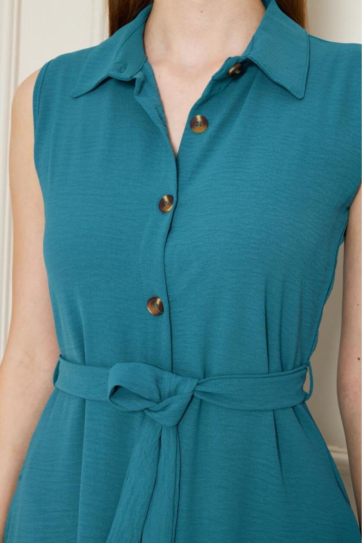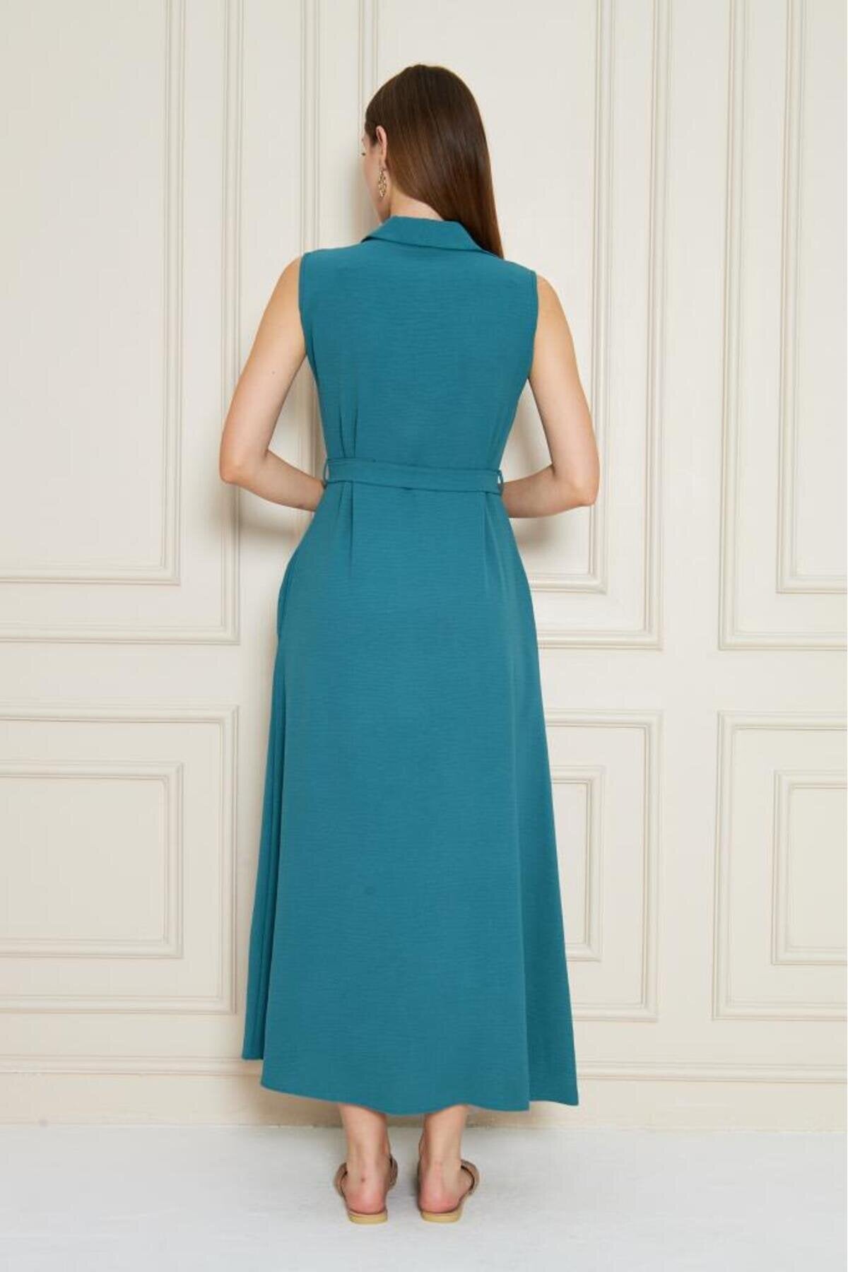 Long Aerobin Belted Shirt Collar Dress - Petrol