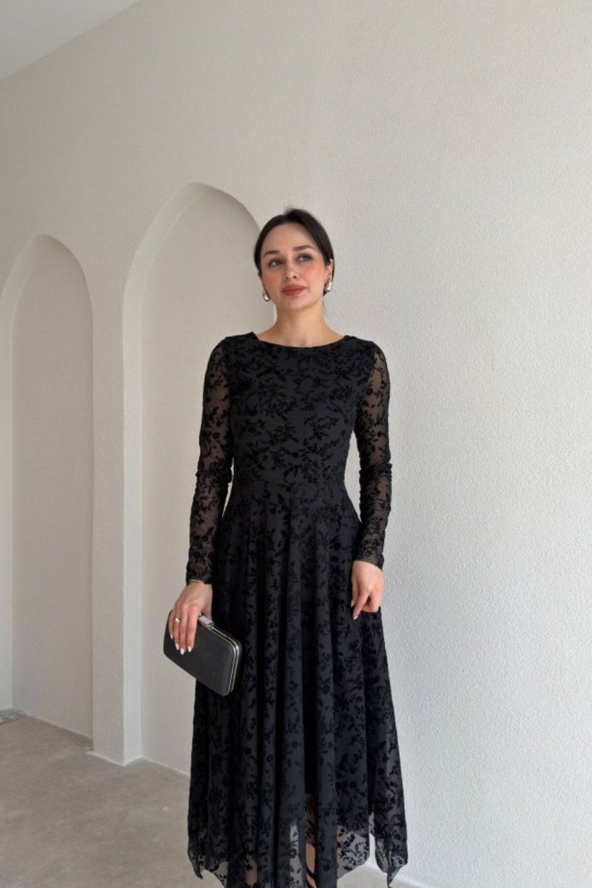 - Sleek, Modest Silhouette: Featuring a high round neckline and long sheer sleeves, this piece balances coverage with allure, offering a timeless fit-and-flare shape that highlights your silhouette beautifully.