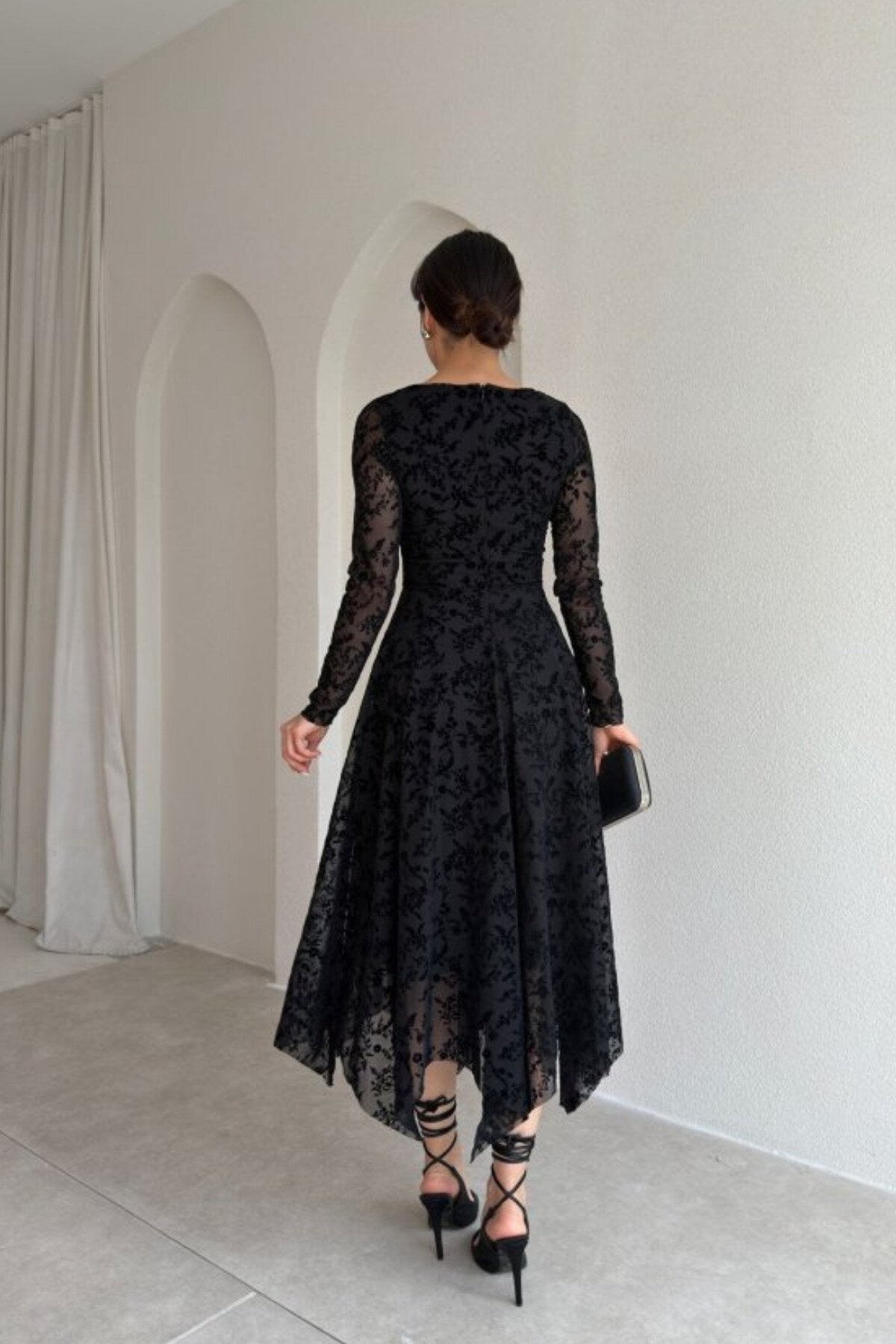 Whether you're attending a formal gala or a sophisticated evening reception, this asymmetric flock-printed lace dress ensures you command the room with effortless grace. Its versatile black palette and rich, textured finish make it a perennial favorite for high-end events that require a touch of drama and elegance.