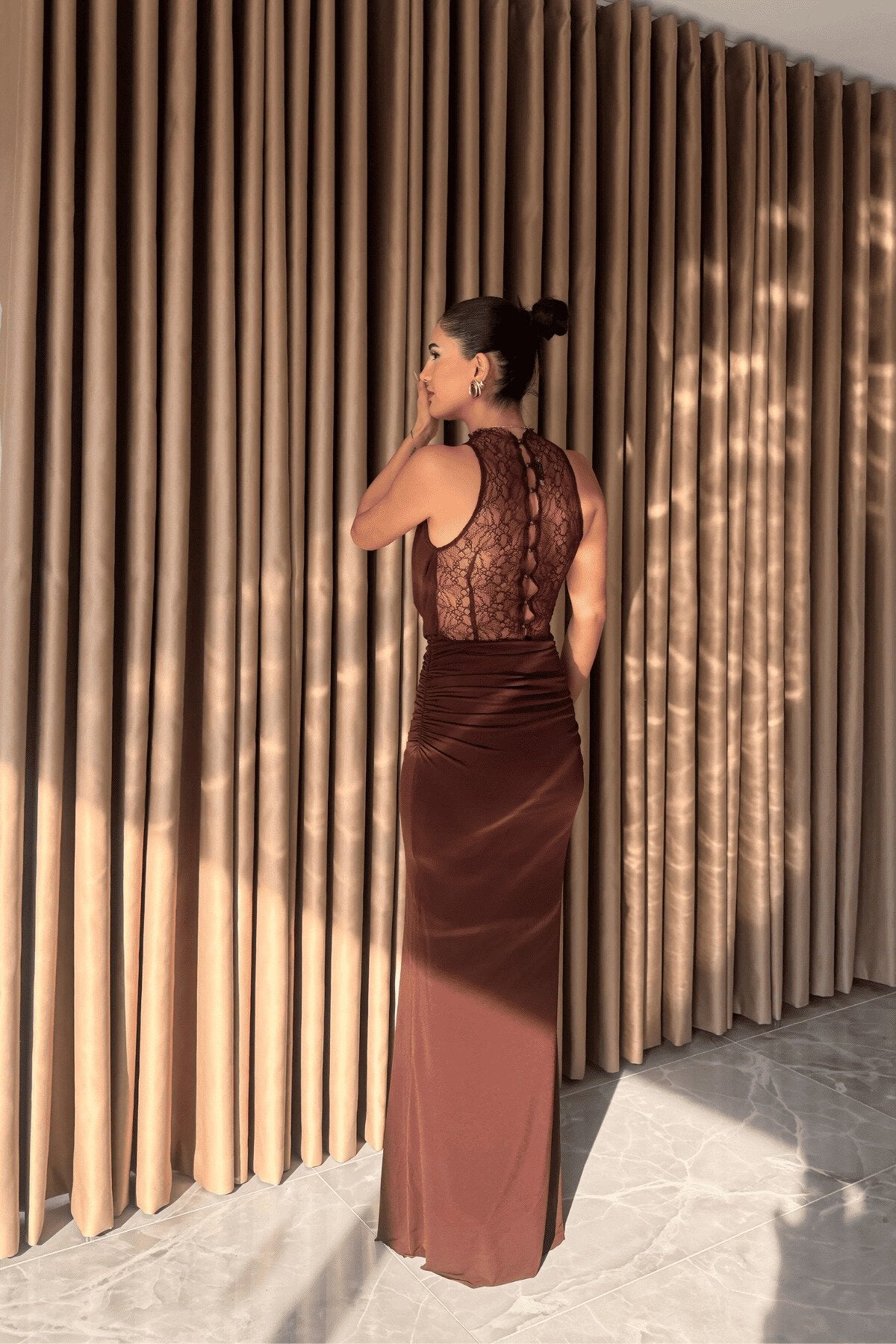 Designed for the moments that demand your most polished self, this backless evening dress is the epitome of red-carpet readiness. Whether you are attending a winter gala or a summer formal, the rich brown tone and intricate textures ensure you remain the center of attention.
