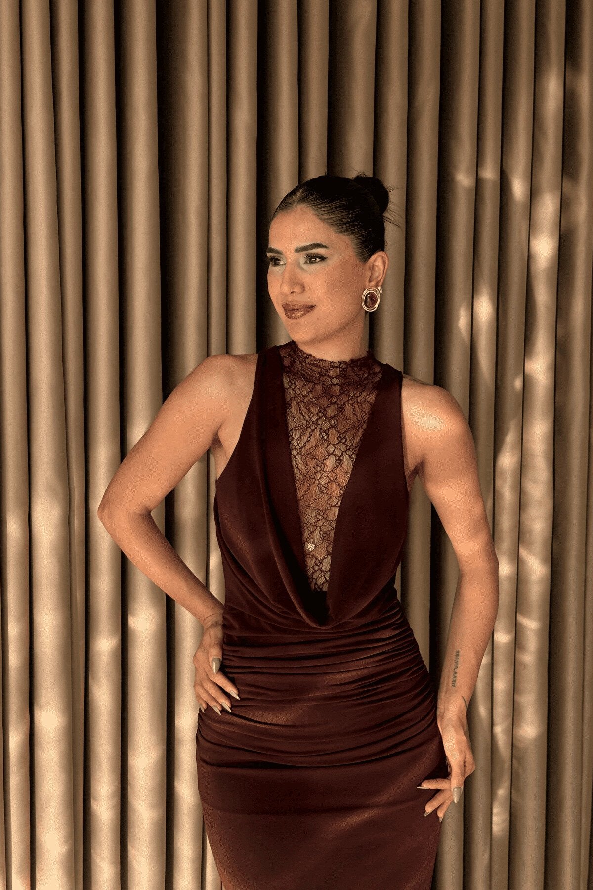 - Styling Tip: Elevate the warm, chocolate tones by pairing this dress with gold statement earrings and minimalist strappy heels for a cohesive and luxurious ensemble.