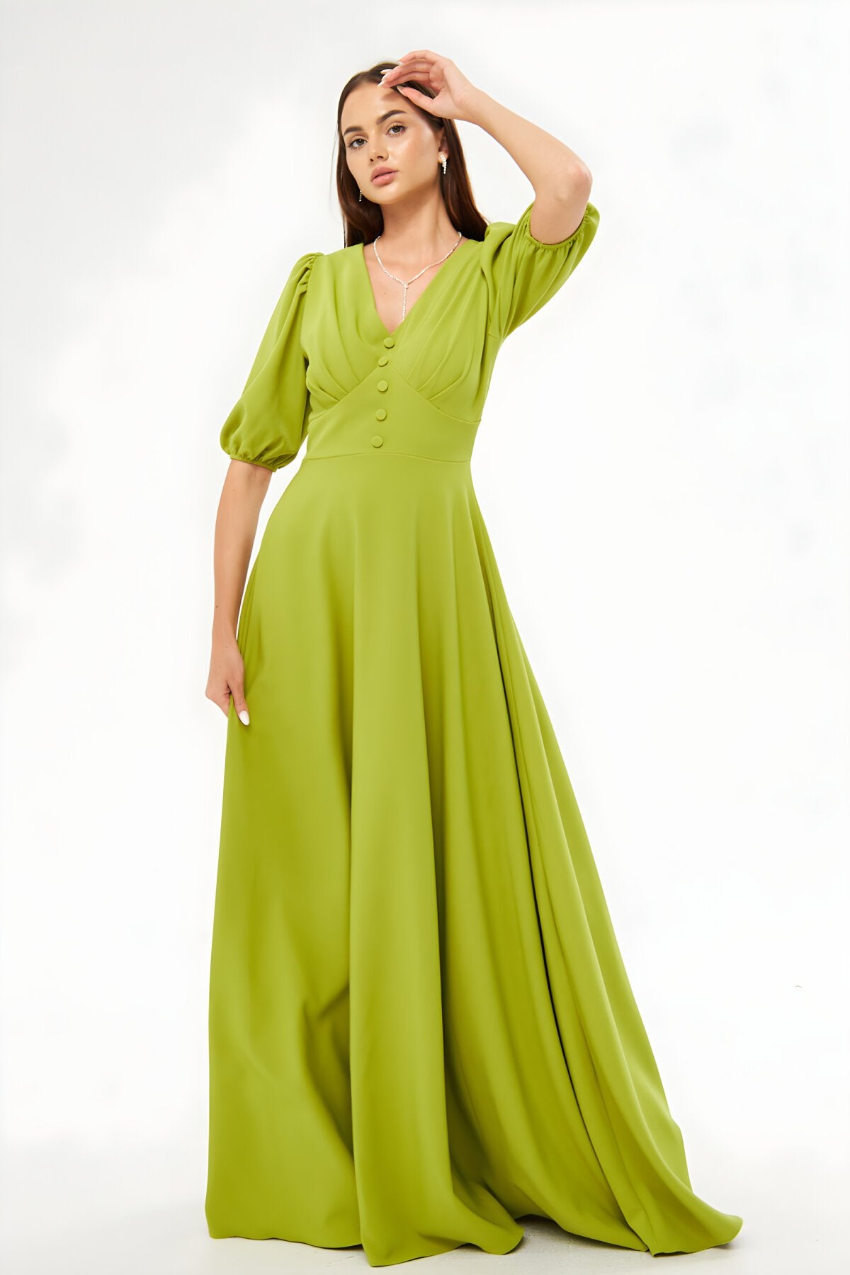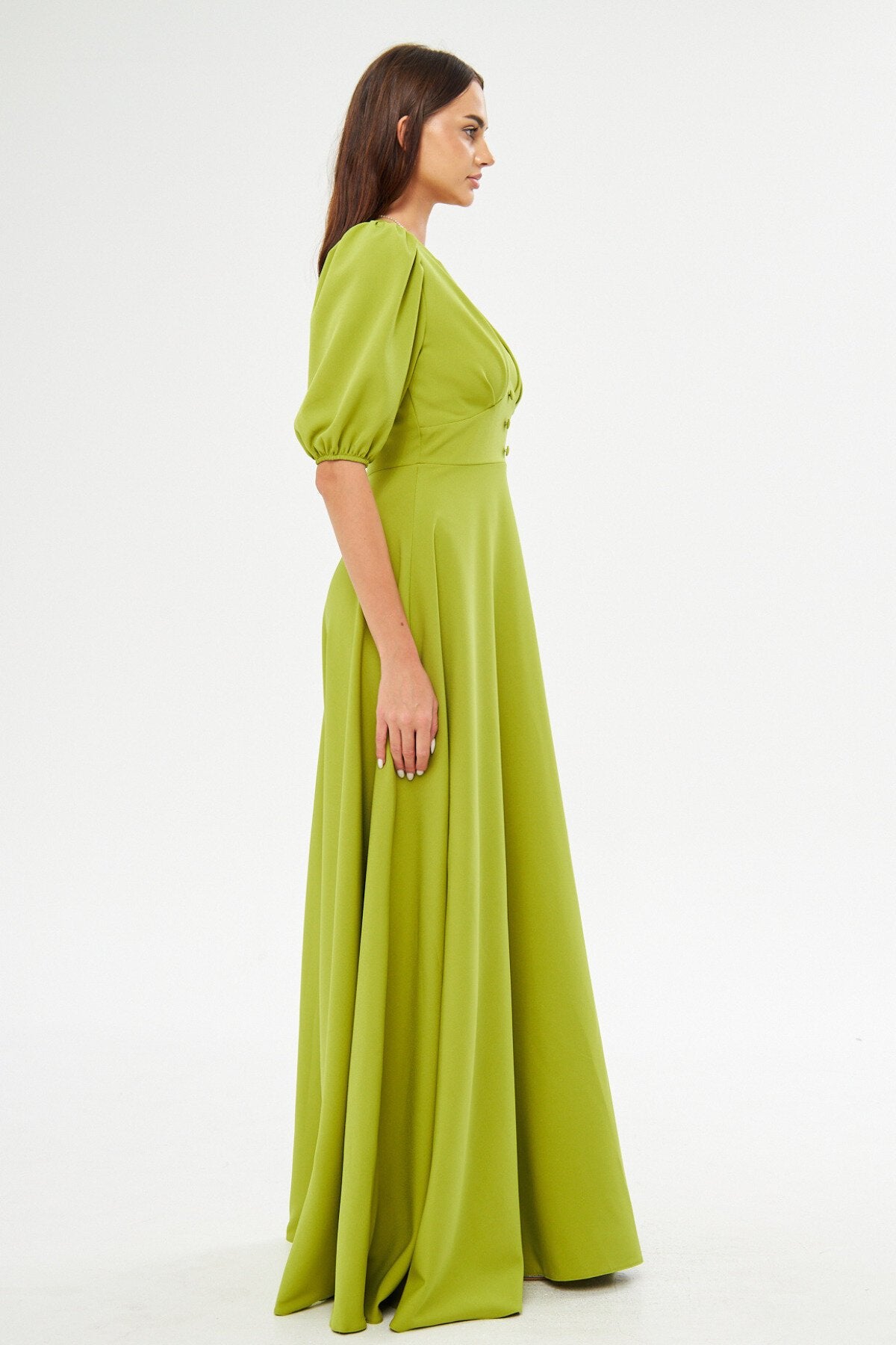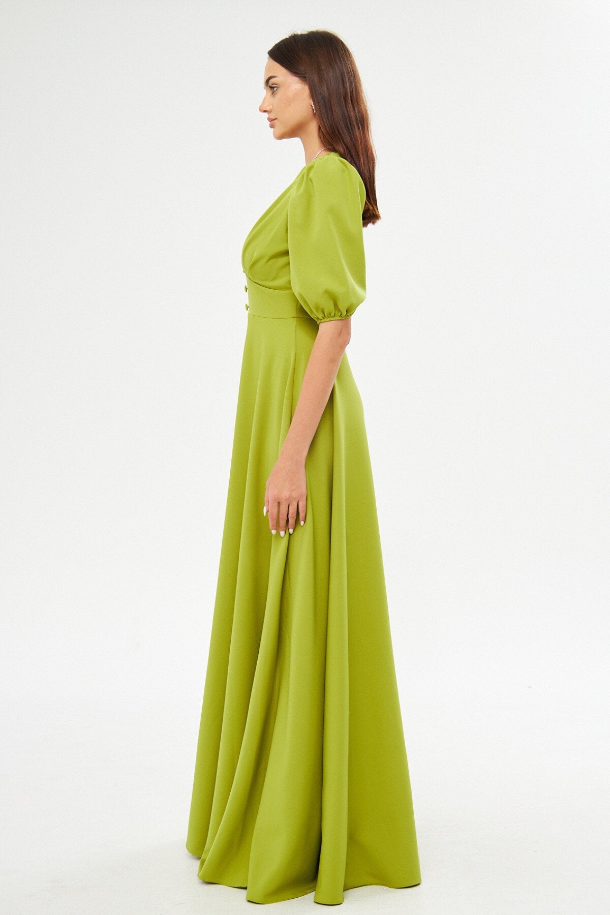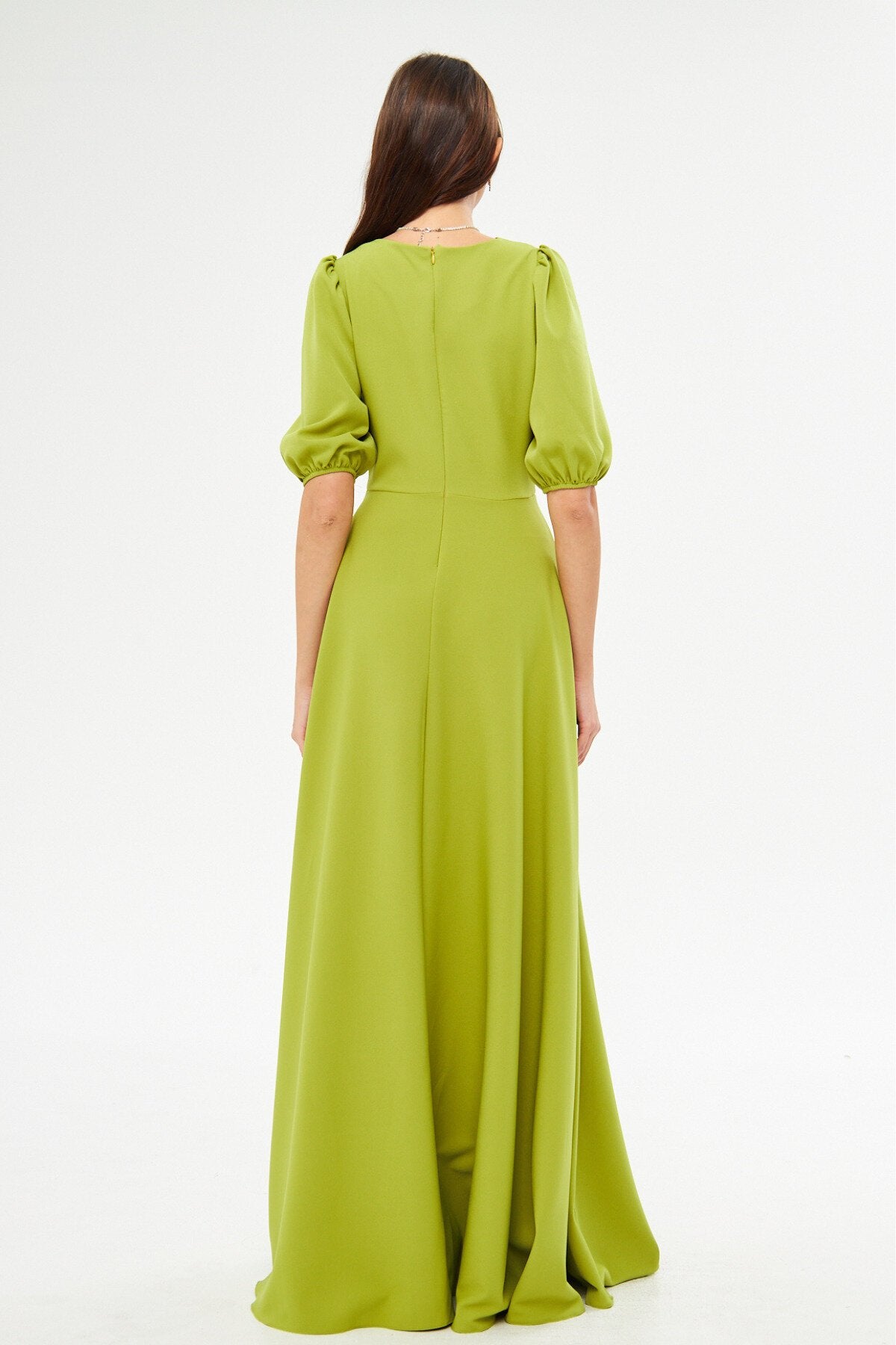 Long Balloon Sleeve V-Neck Pleated Bust Draped Evening Dress - Pistachio Green