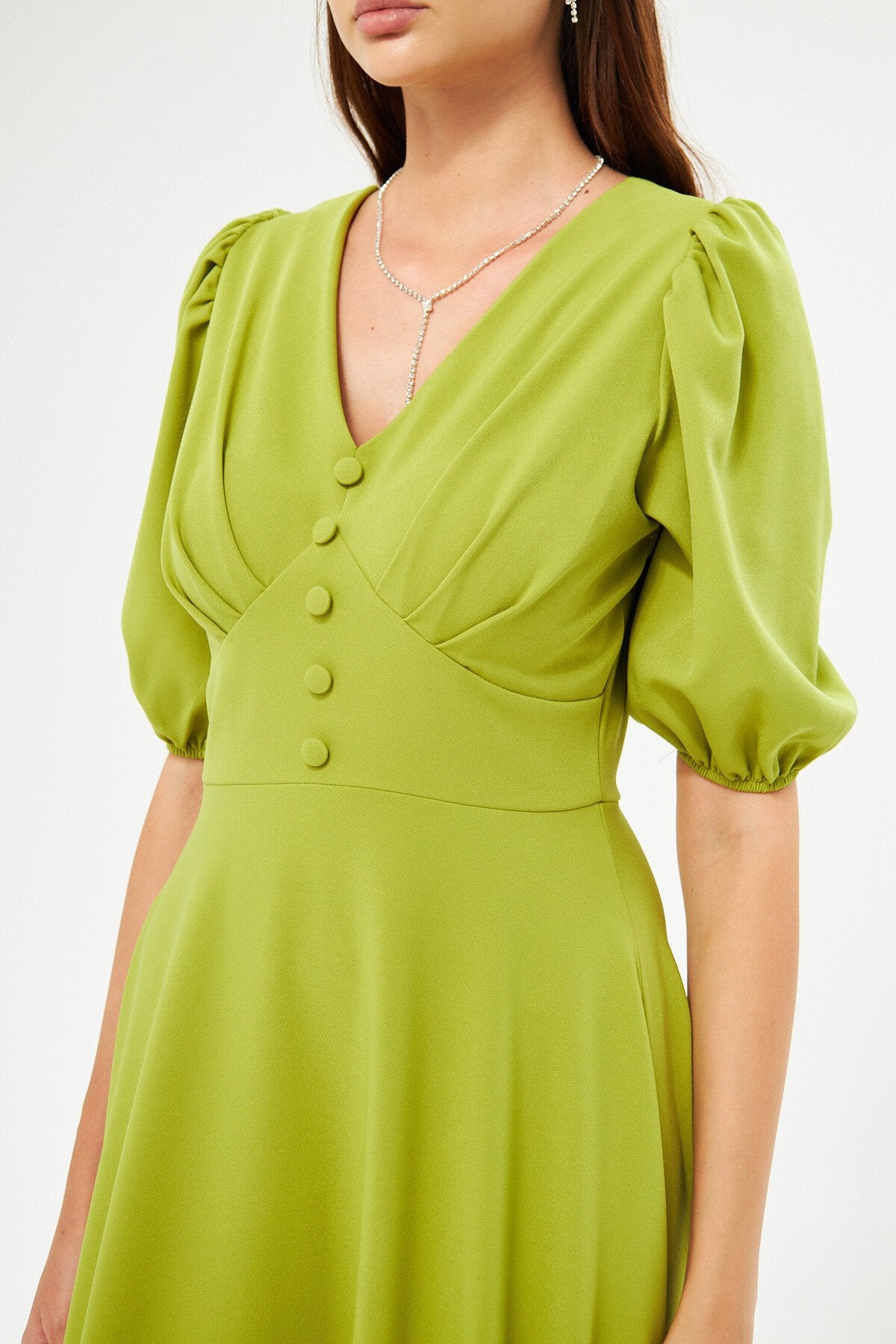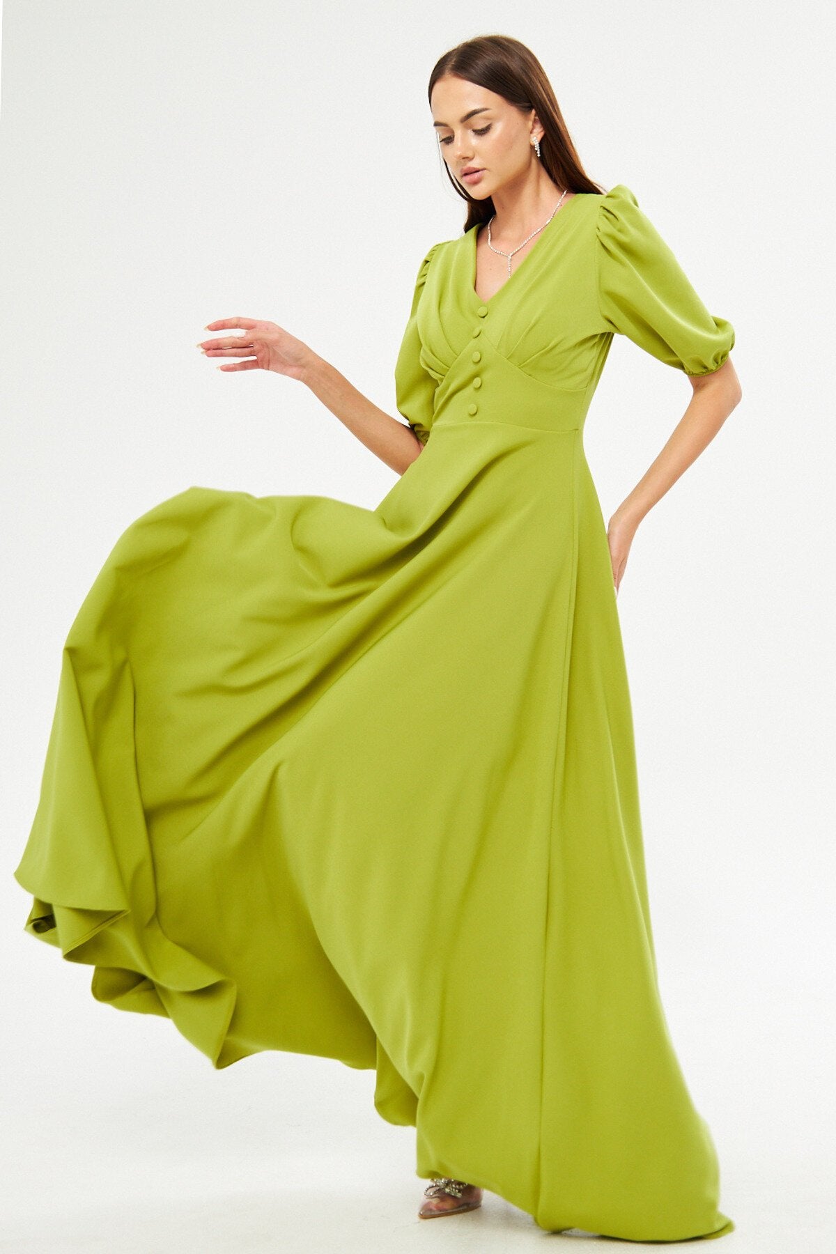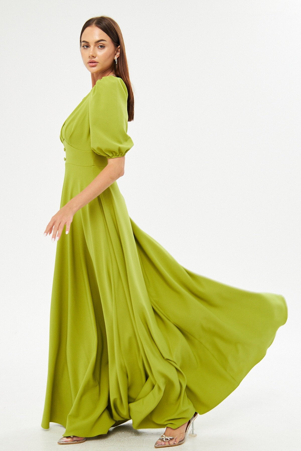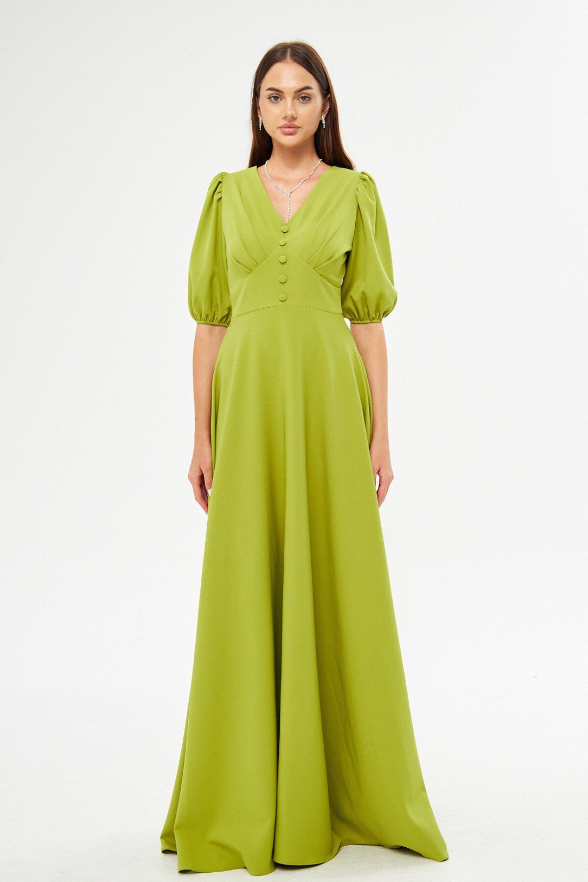 Long Balloon Sleeve V-Neck Pleated Bust Draped Evening Dress - Pistachio Green
