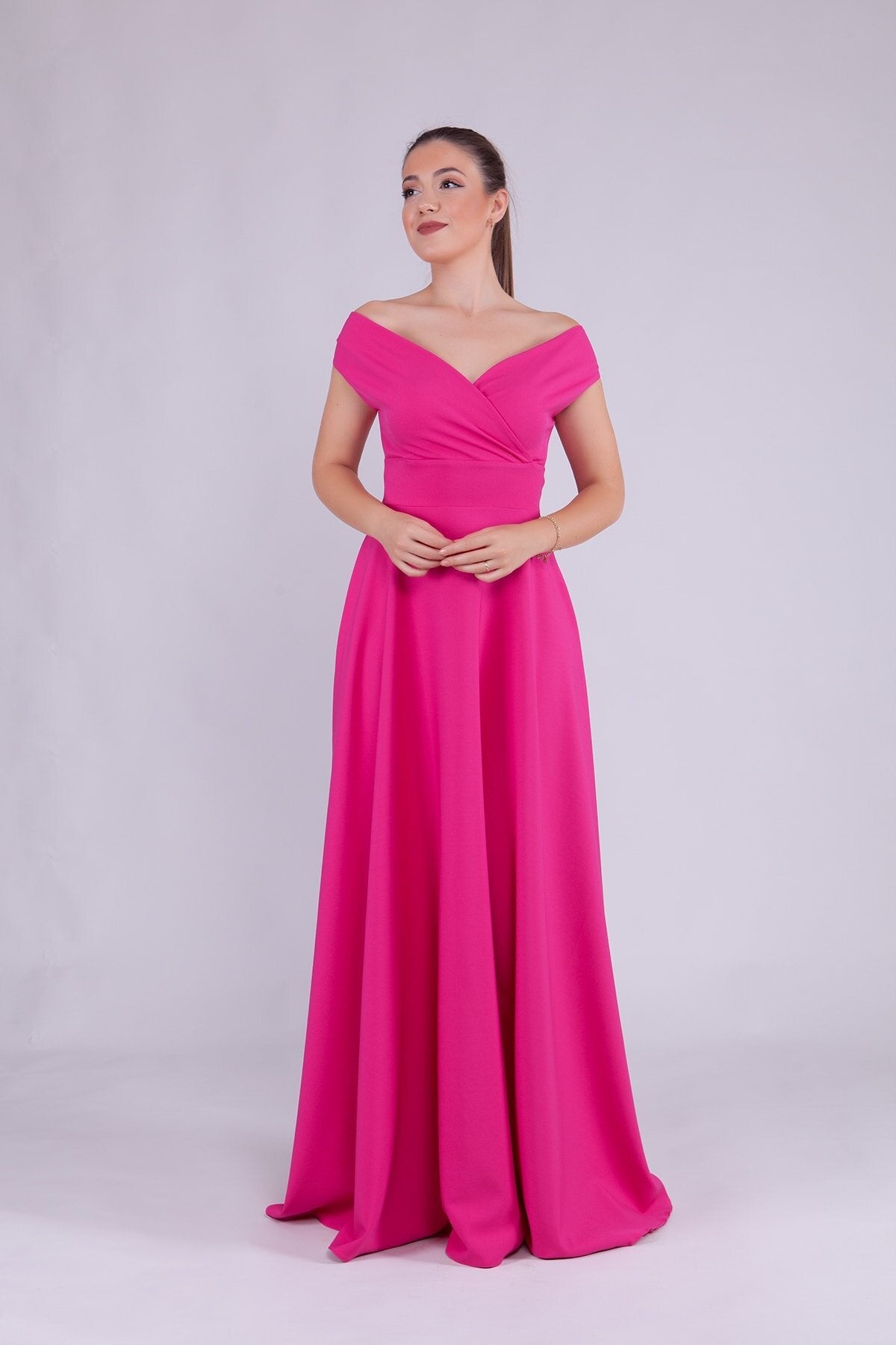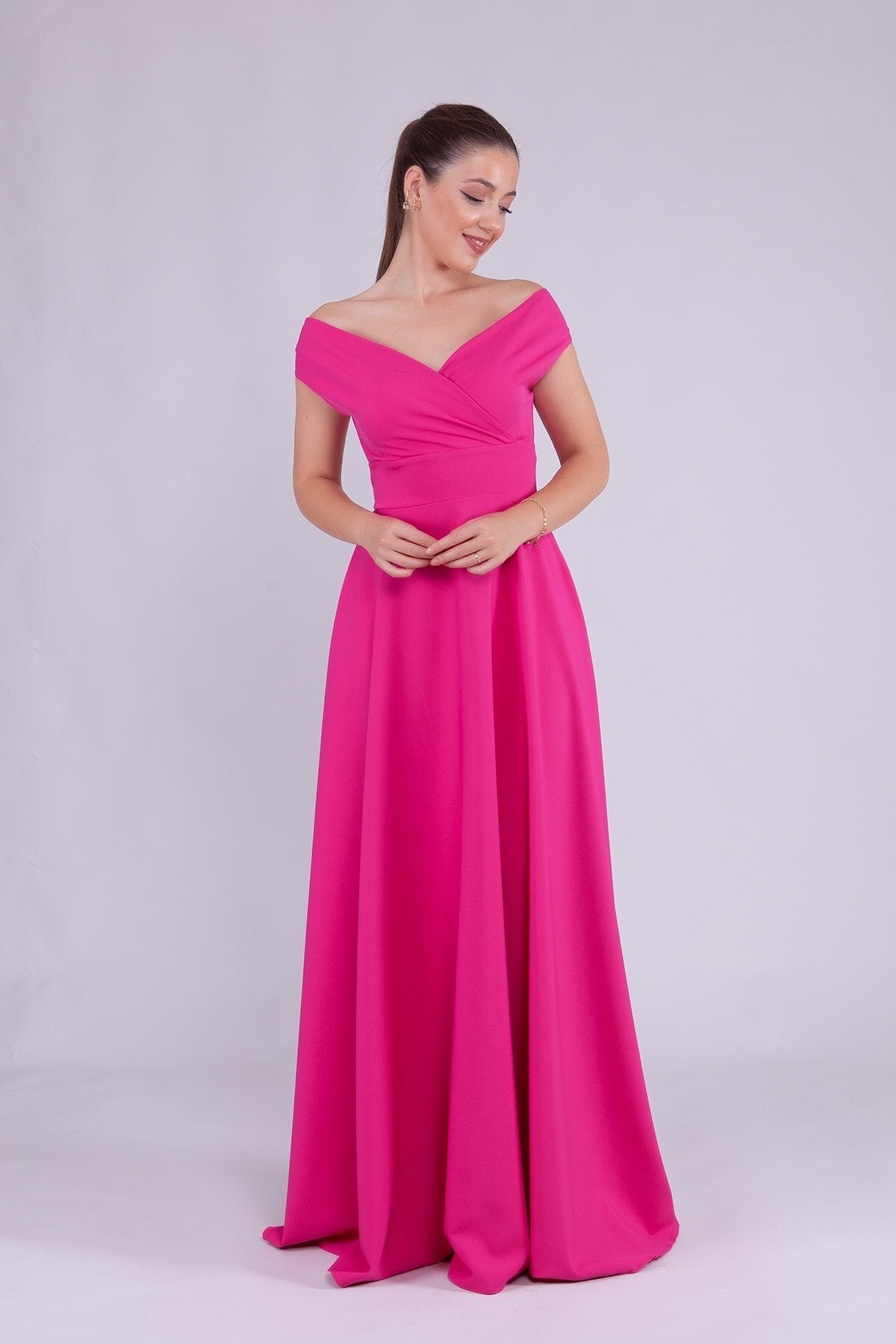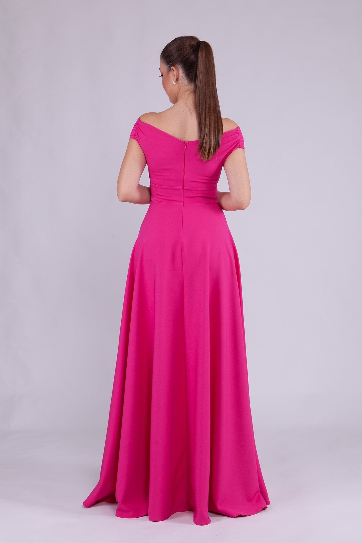Long Boat-Neck Evening Dress - Fuchsia