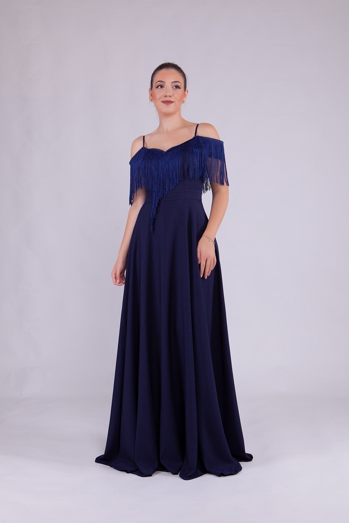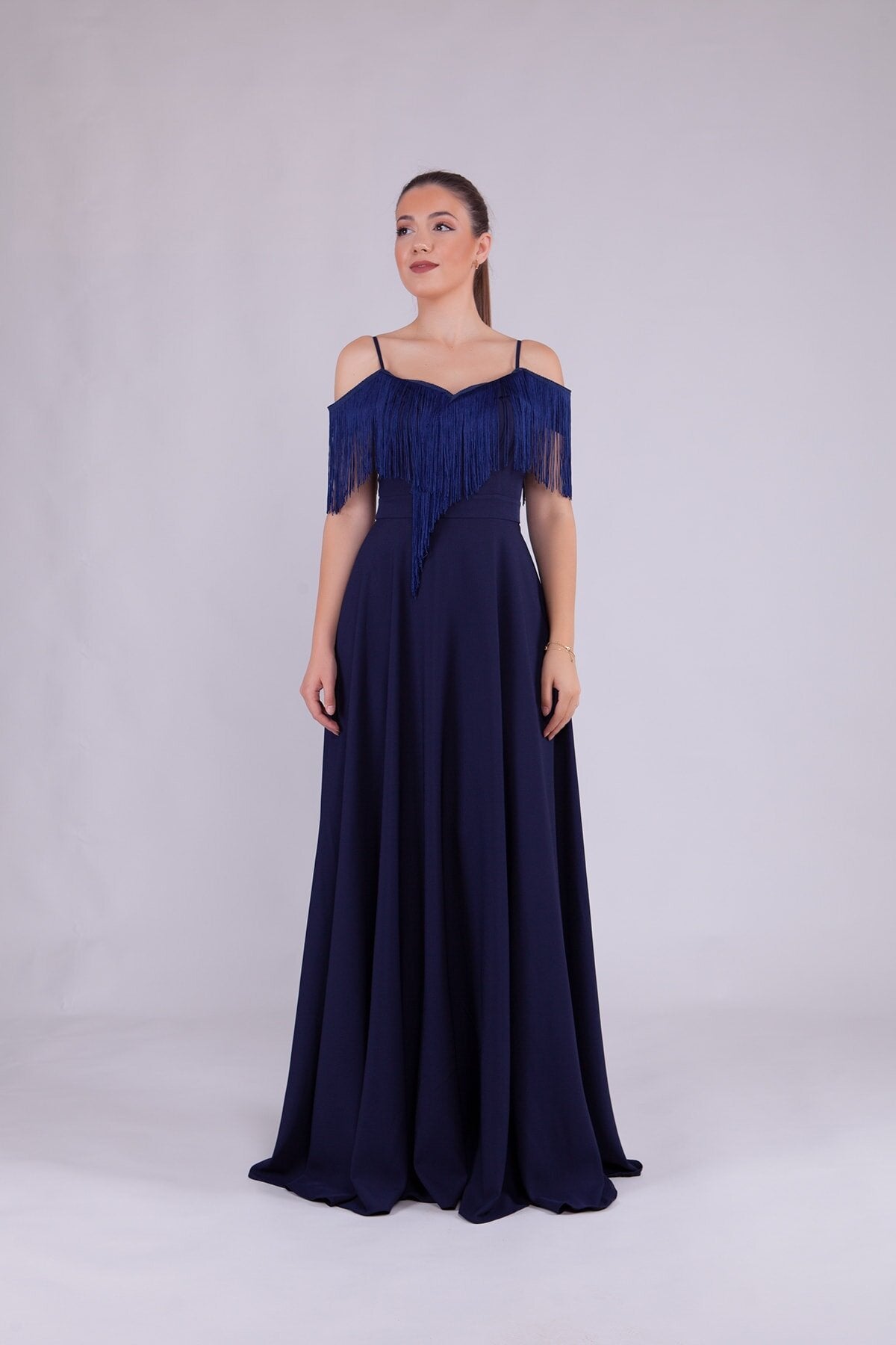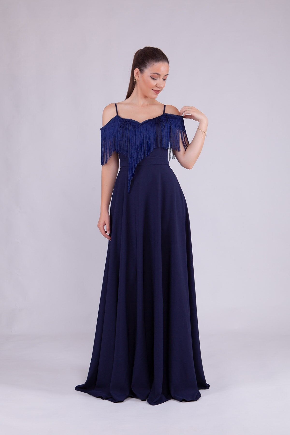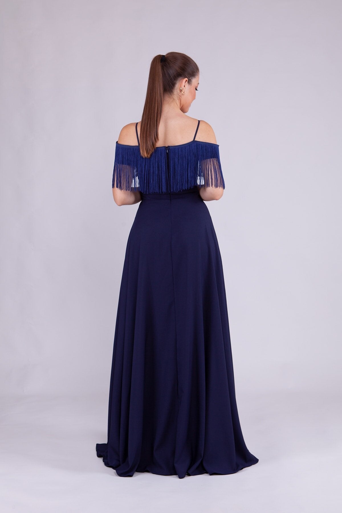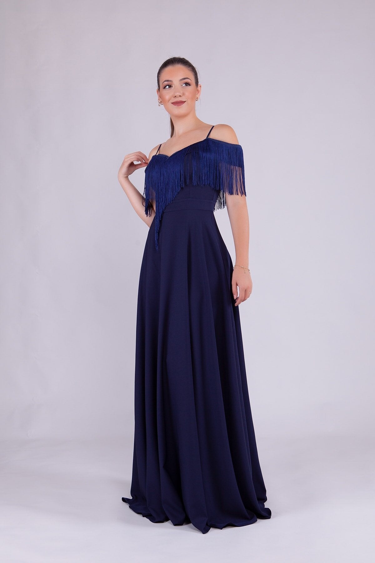 Long Boat Neck Tassel Detail Evening Dress - Navy Blue