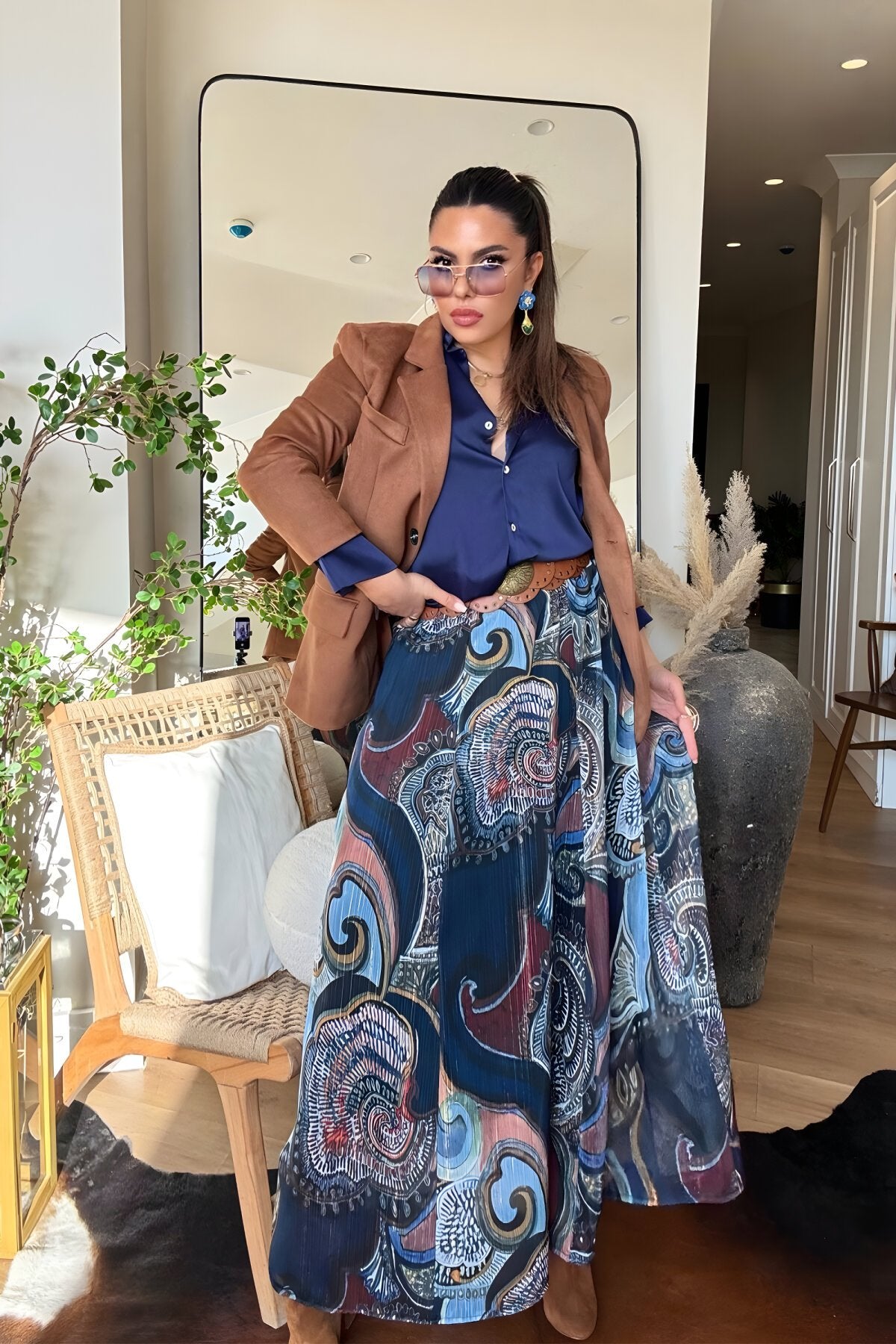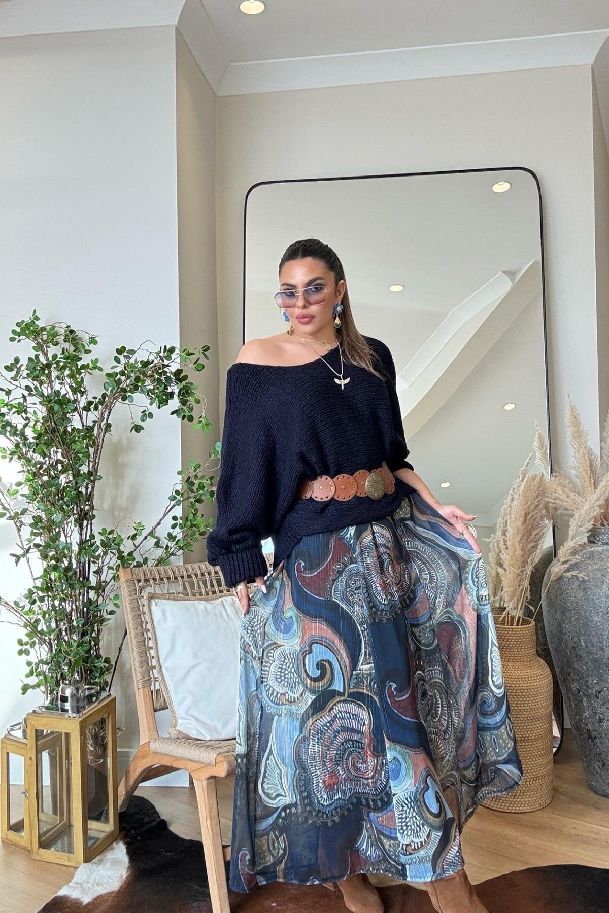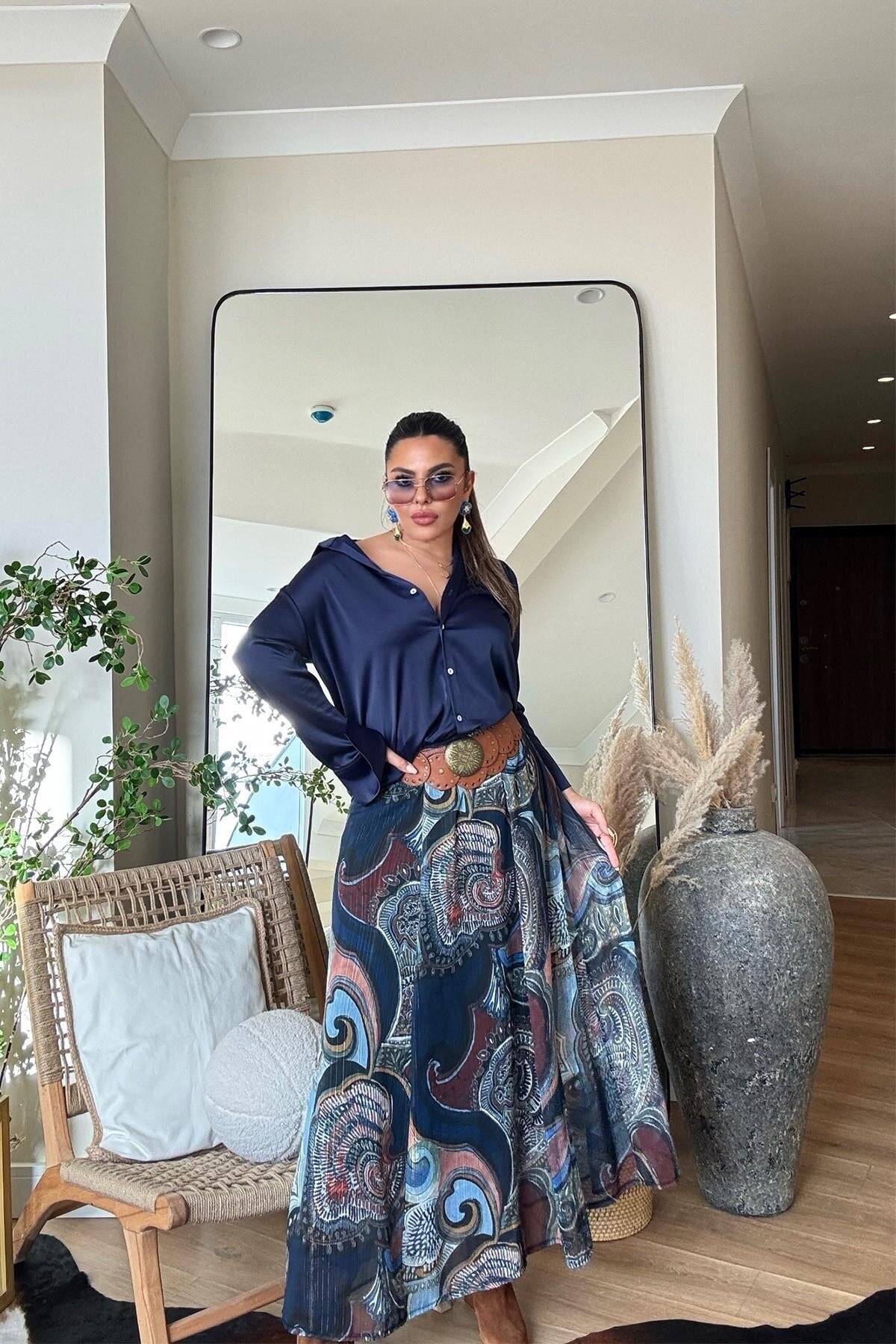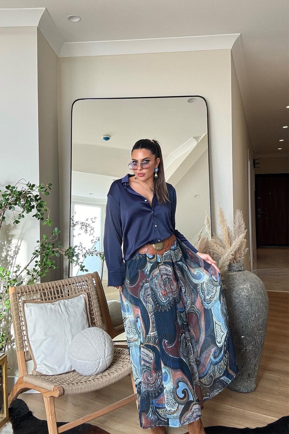 This stunning maxi skirt blends a classic bohemian aesthetic with modern, sophisticated details. Its flowing chiffon fabric creates a mesmerizing silhouette that moves beautifully with every step, making it a true statement piece for the fashion-forward wardrobe.