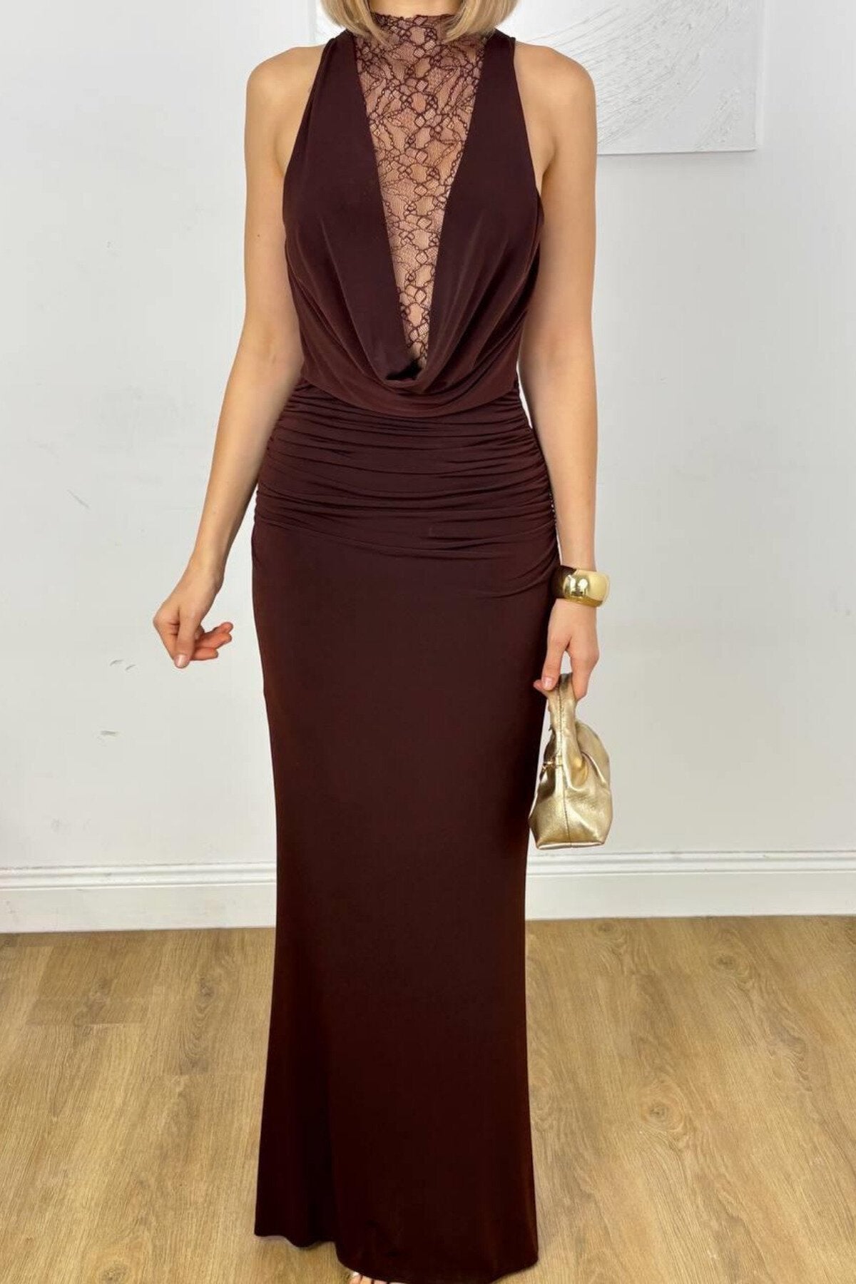 Long Cowl-Neck Ruched Lace-Detail Evening Dress - Brown
