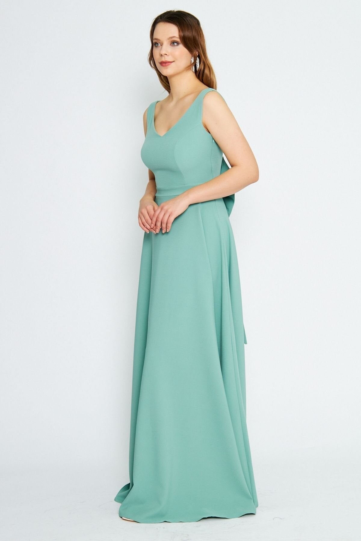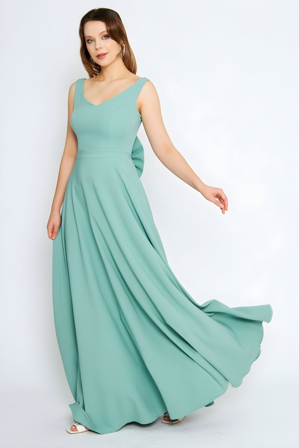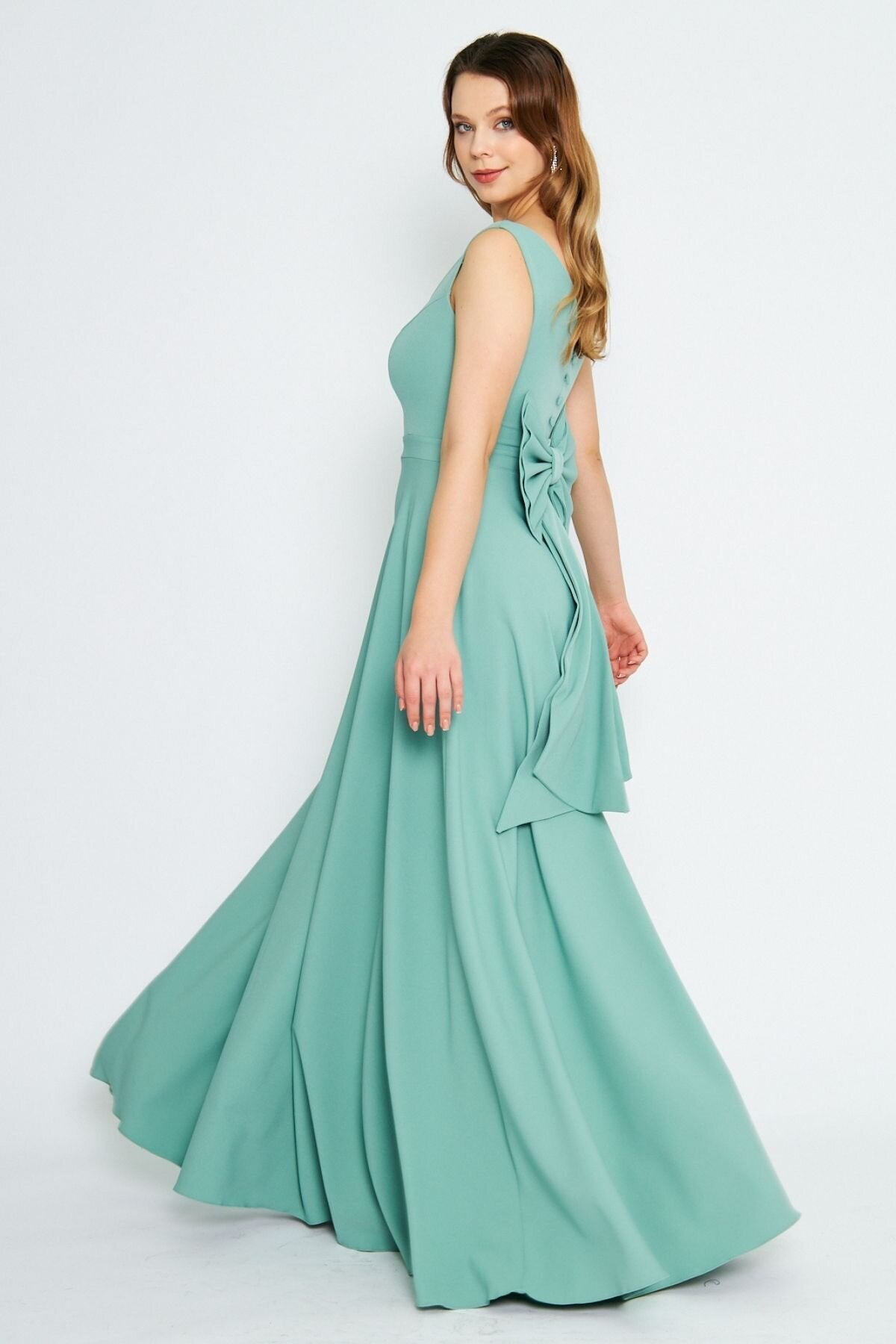 Long Flared Back Bow Evening Dress - Mint Green