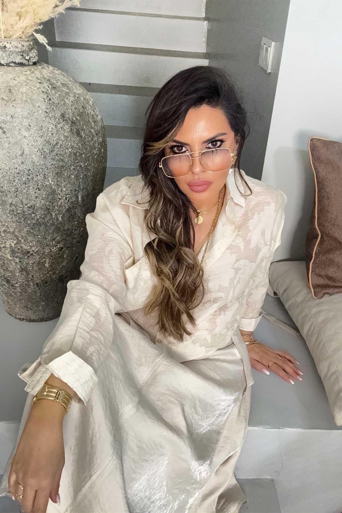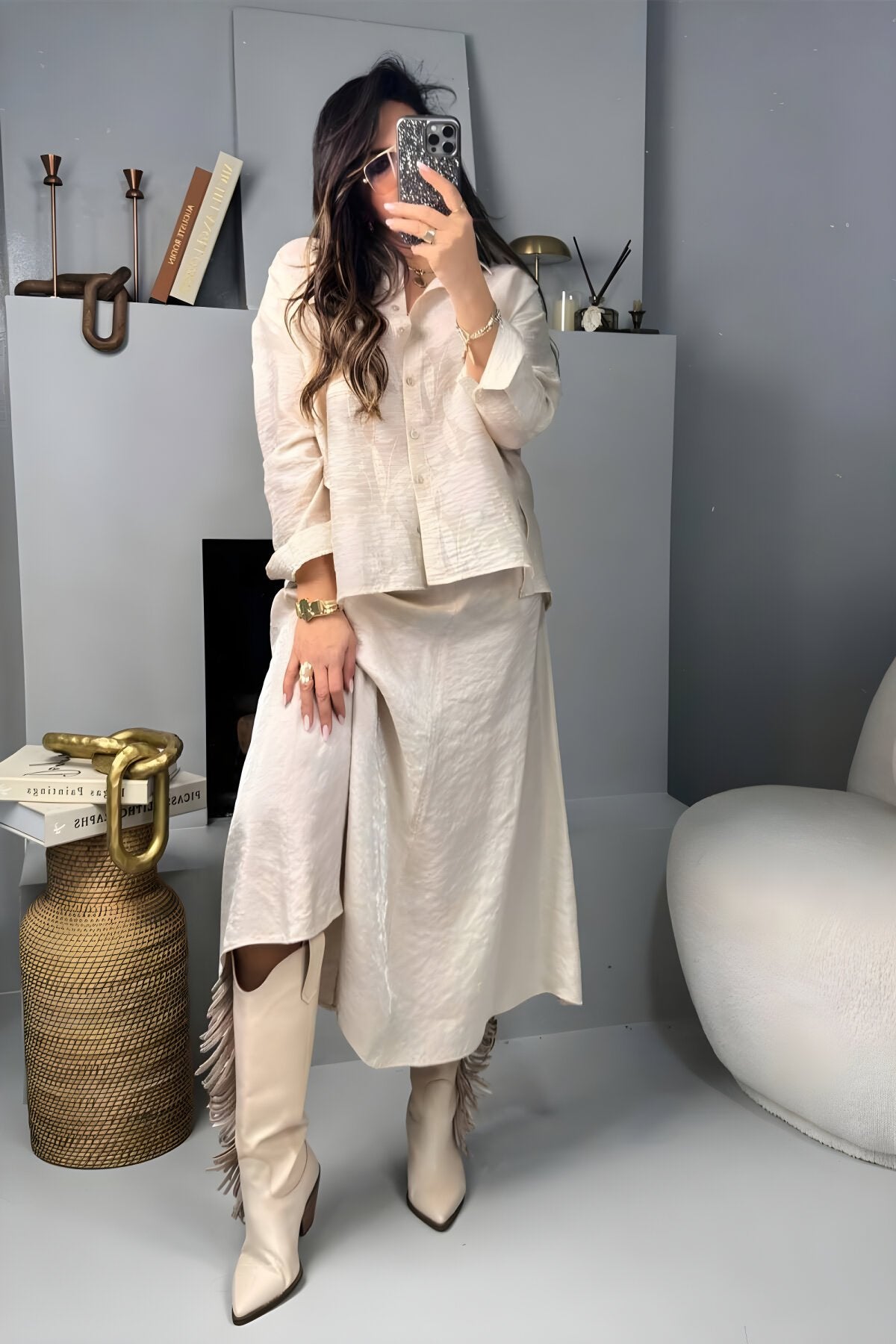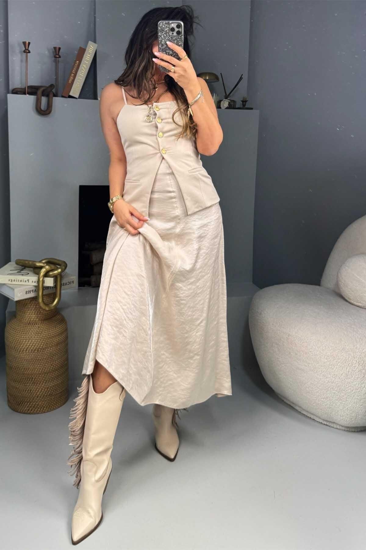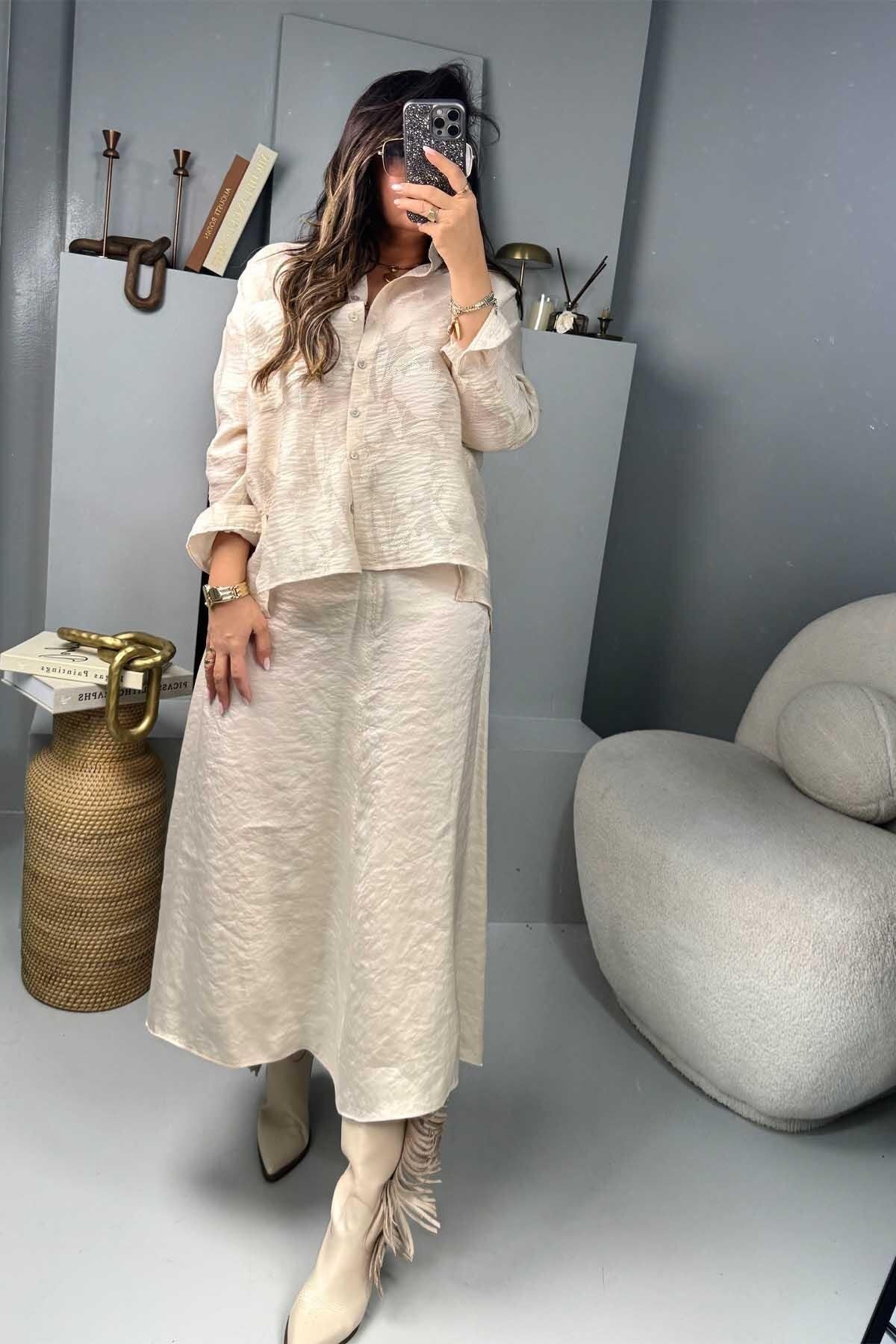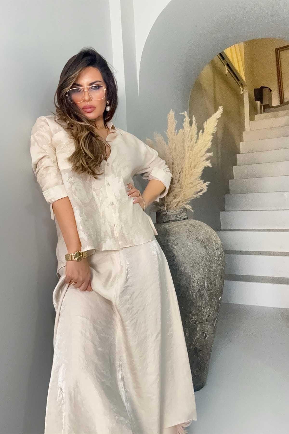 Long Flared Crinkled Viscose Skirt - Stone