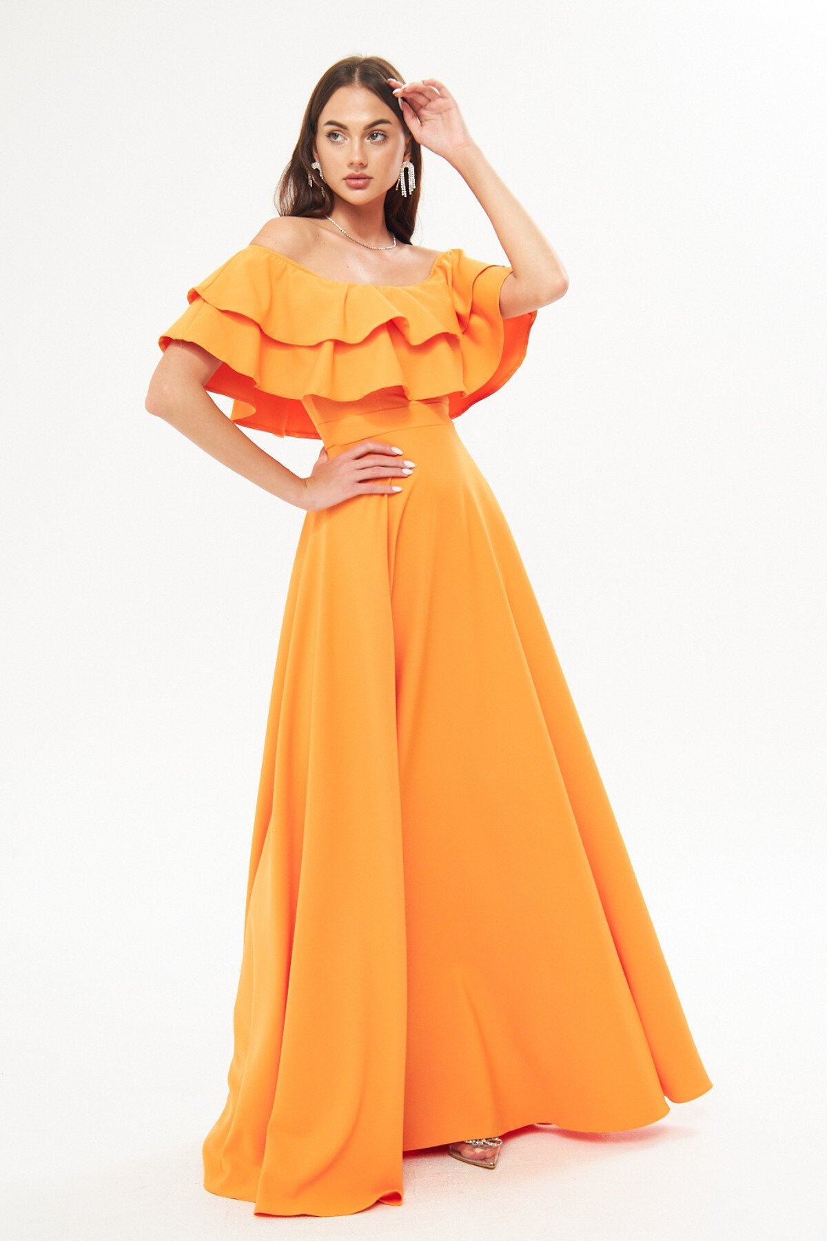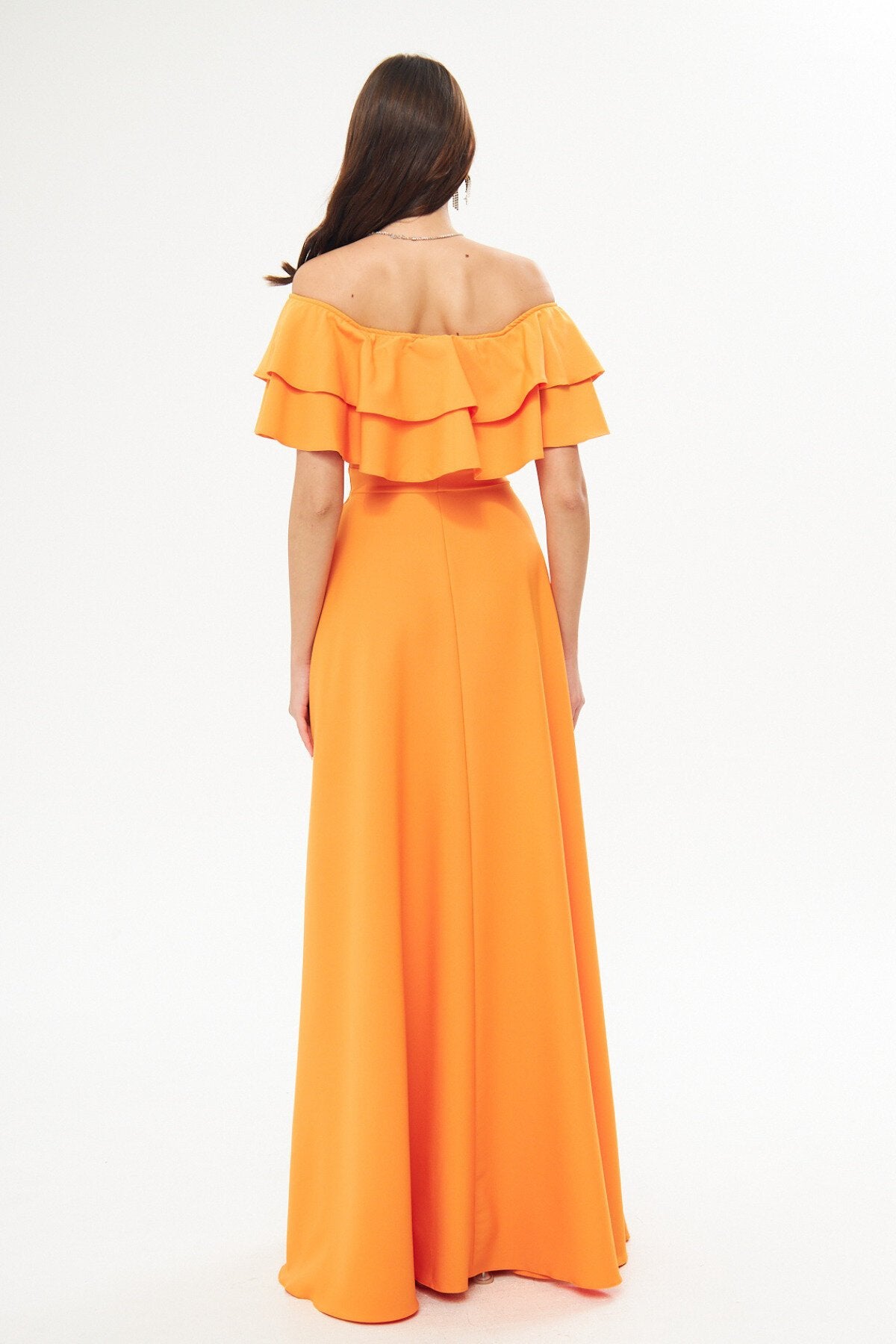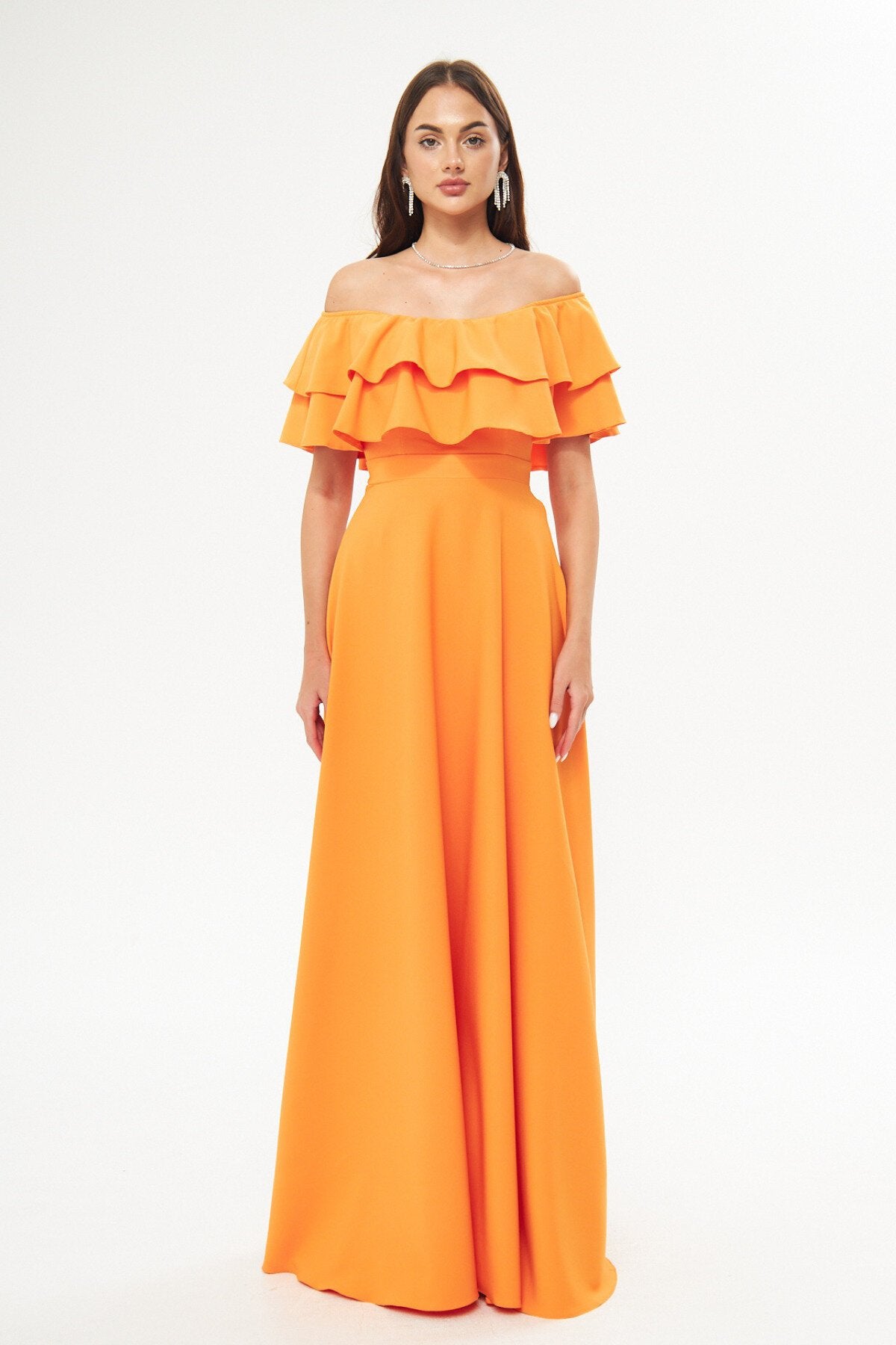 Long Flared Off-the-shoulder Double-layered Ruffle-detail Evening Dress - Orange