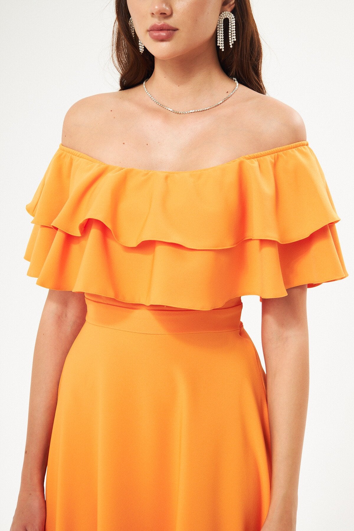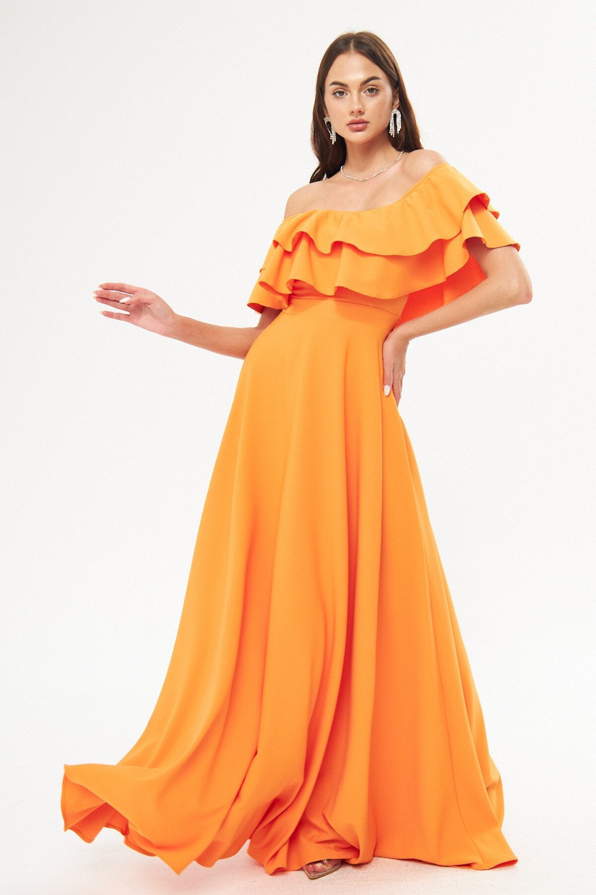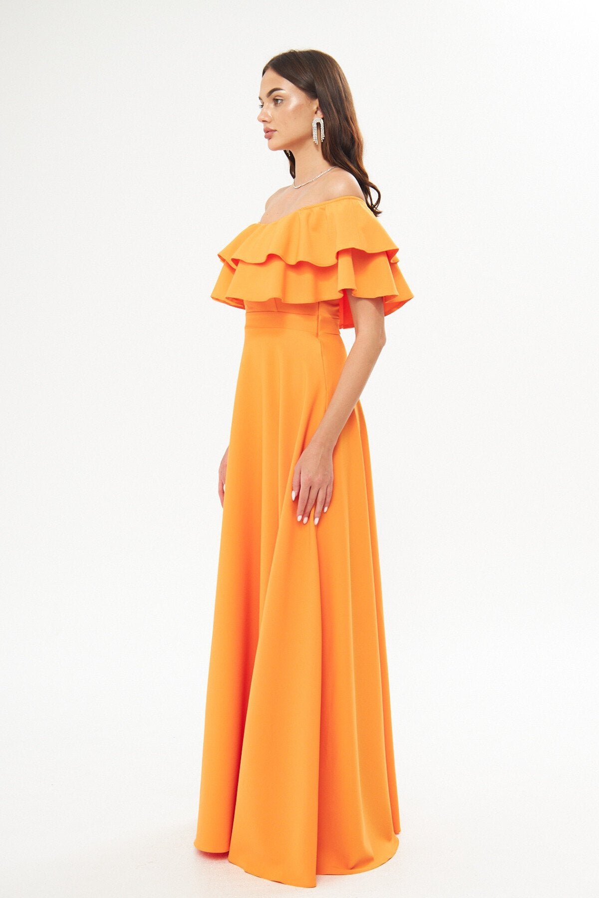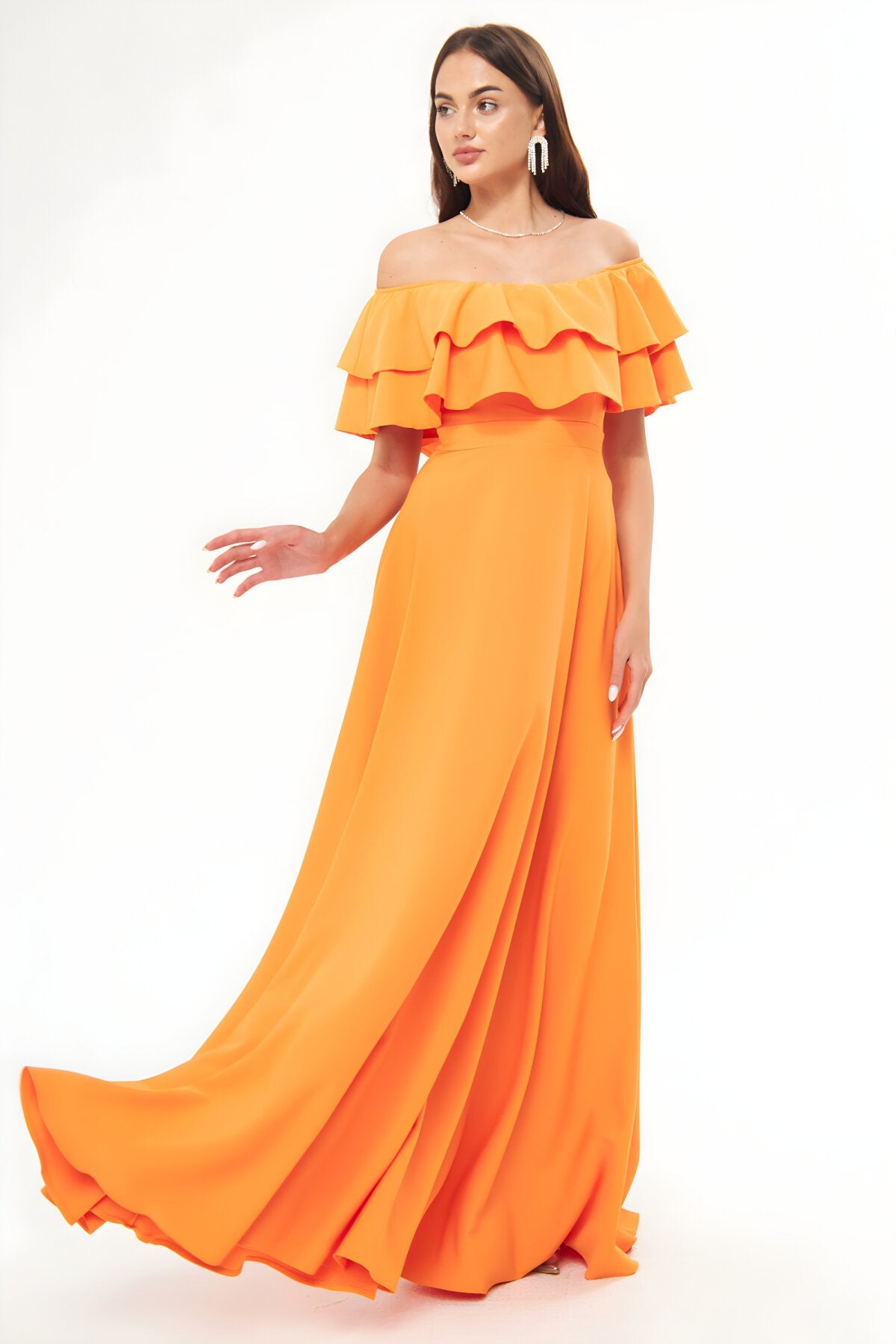 Long Flared Off-the-shoulder Double-layered Ruffle-detail Evening Dress - Orange