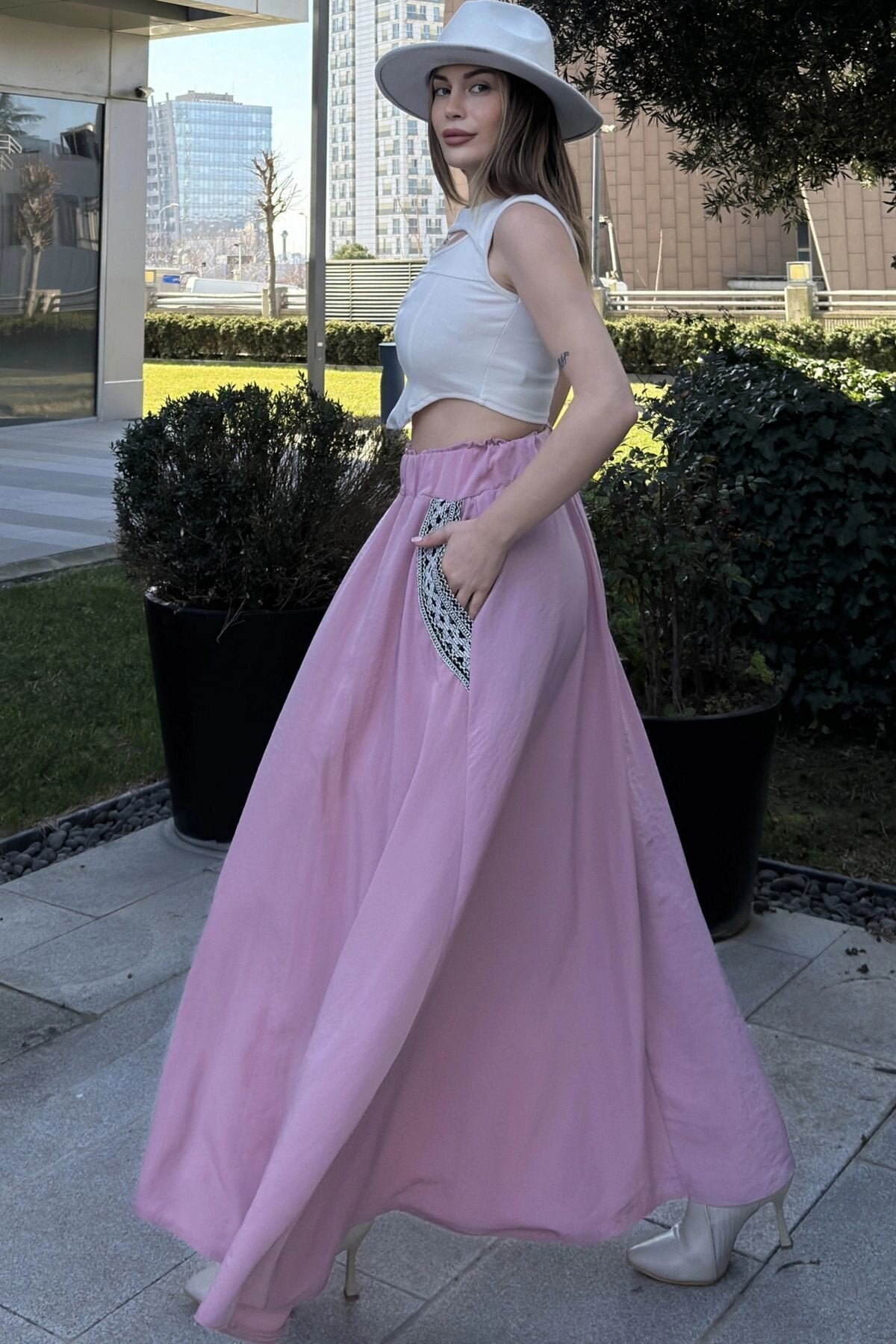 Long Flared Wicker Detailed Skirt - Dusty Rose