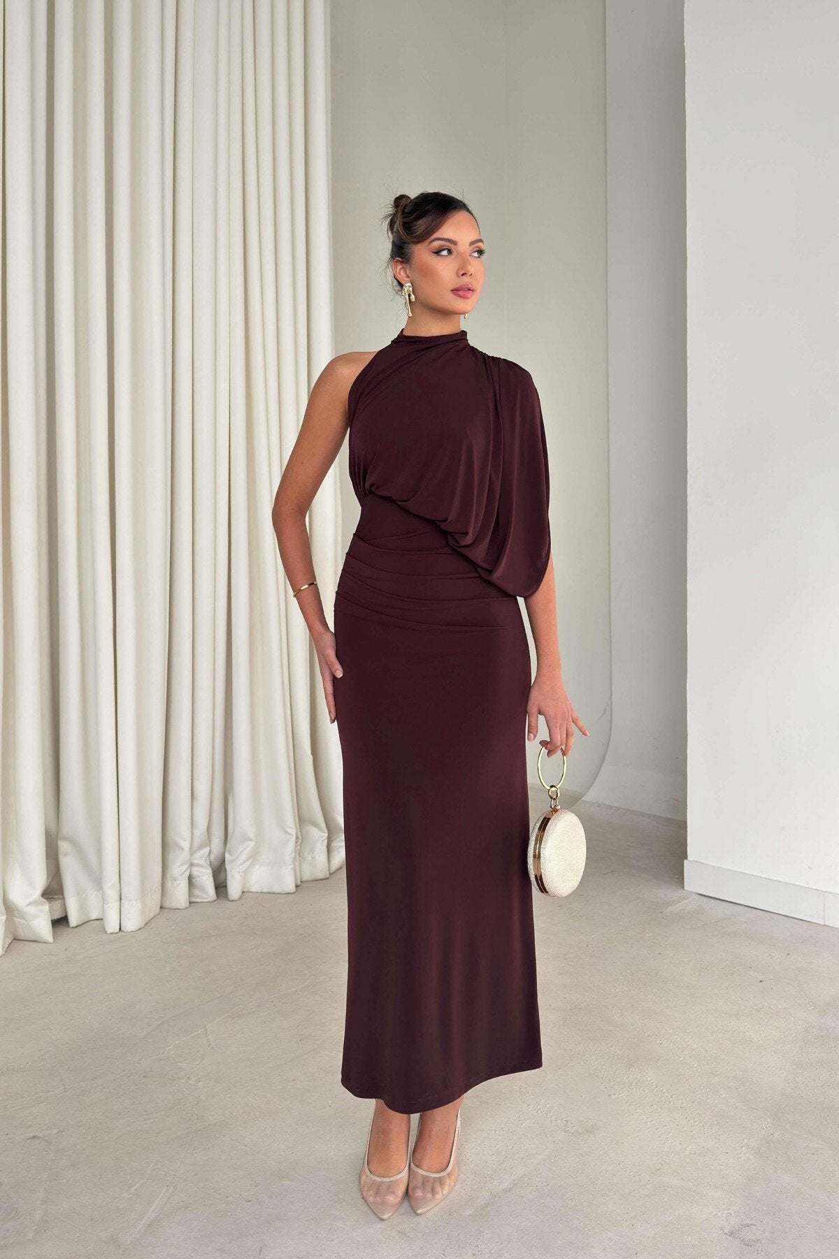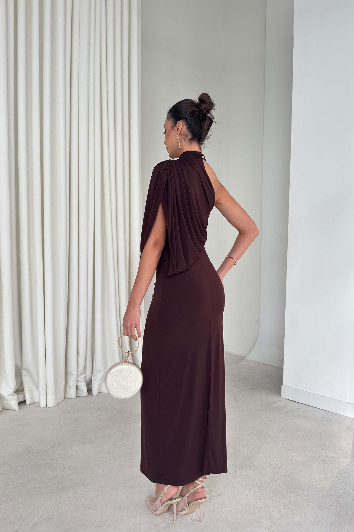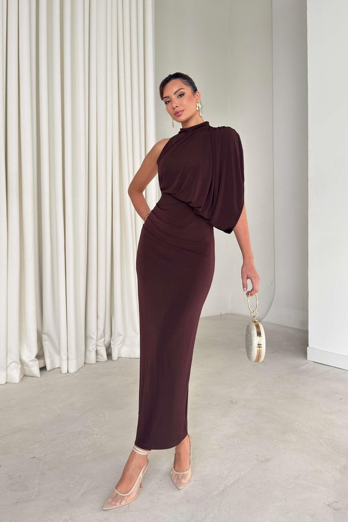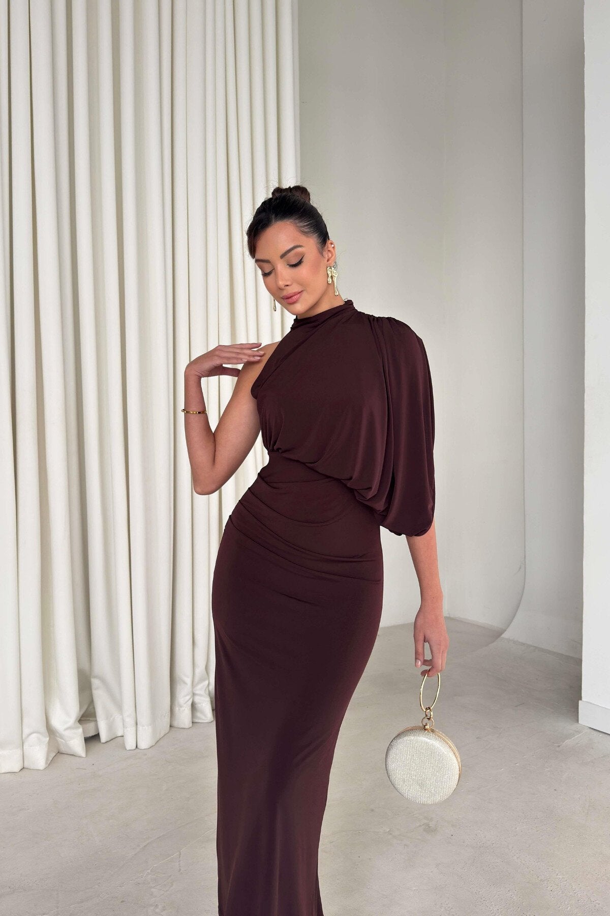 Long Flowy One-Shoulder Drape Detail Evening Dress - Brown