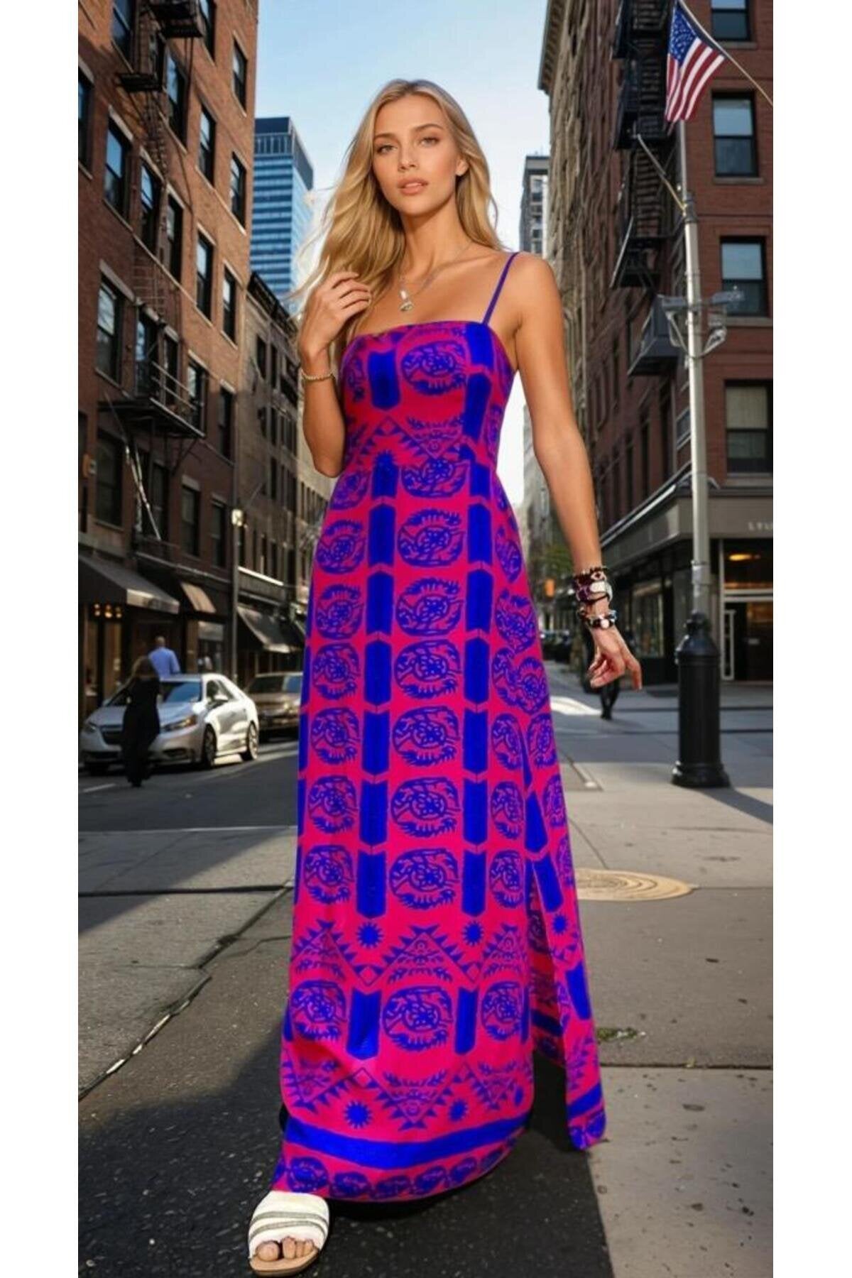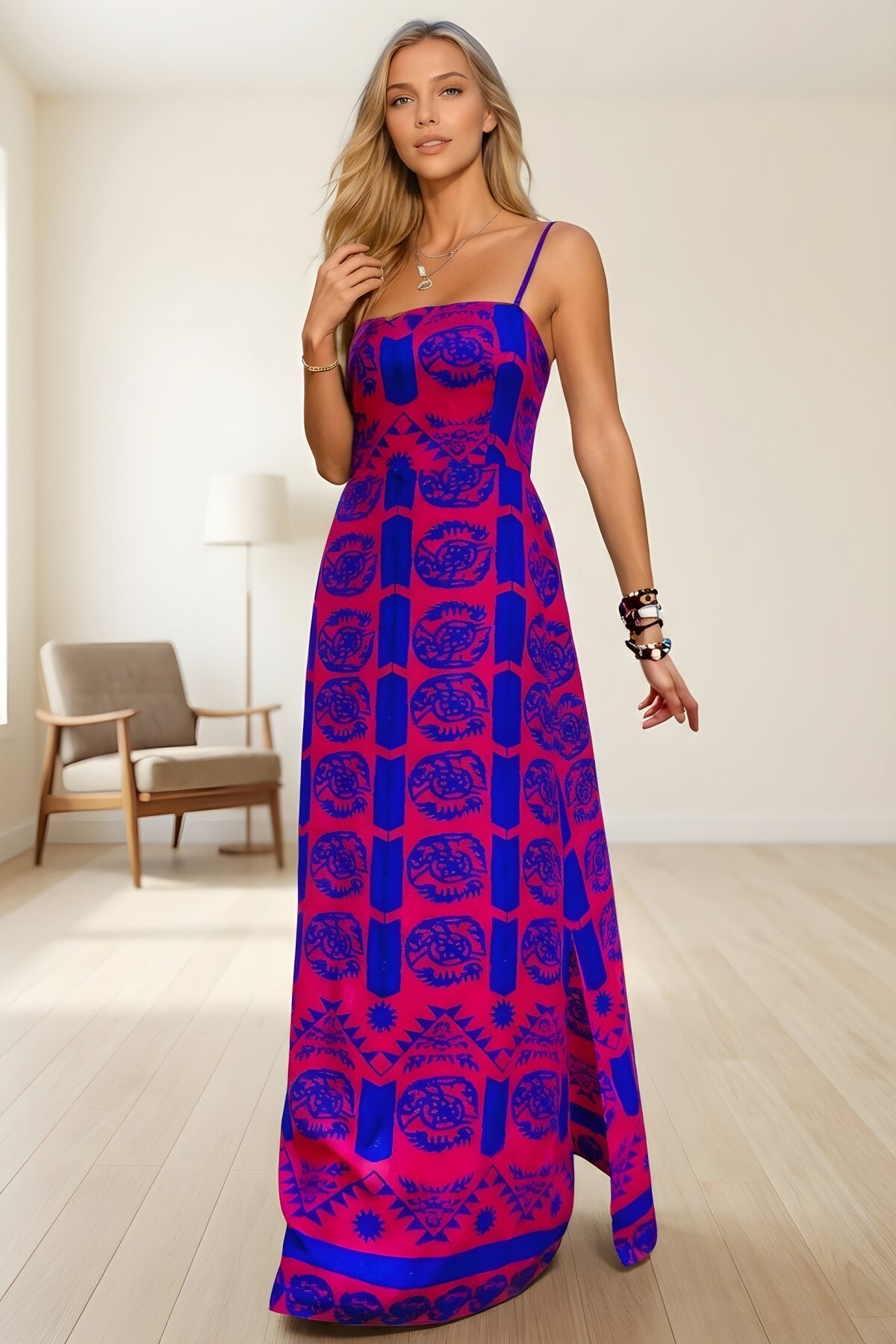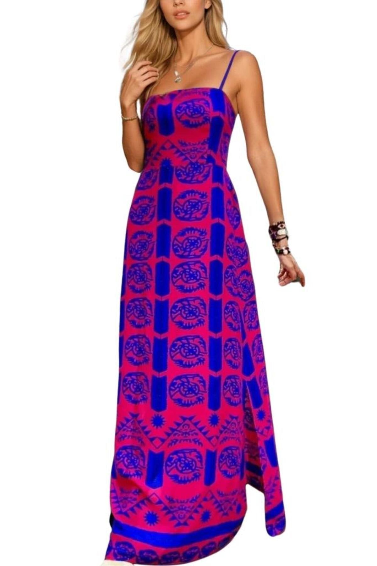 Long Fuchsia Patterned Slit Spaghetti Strap Dress - Blue
