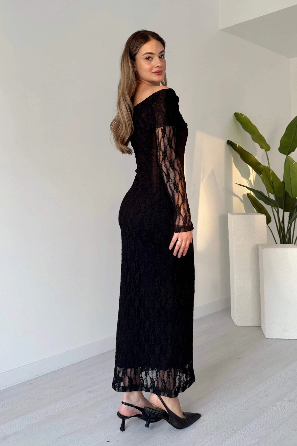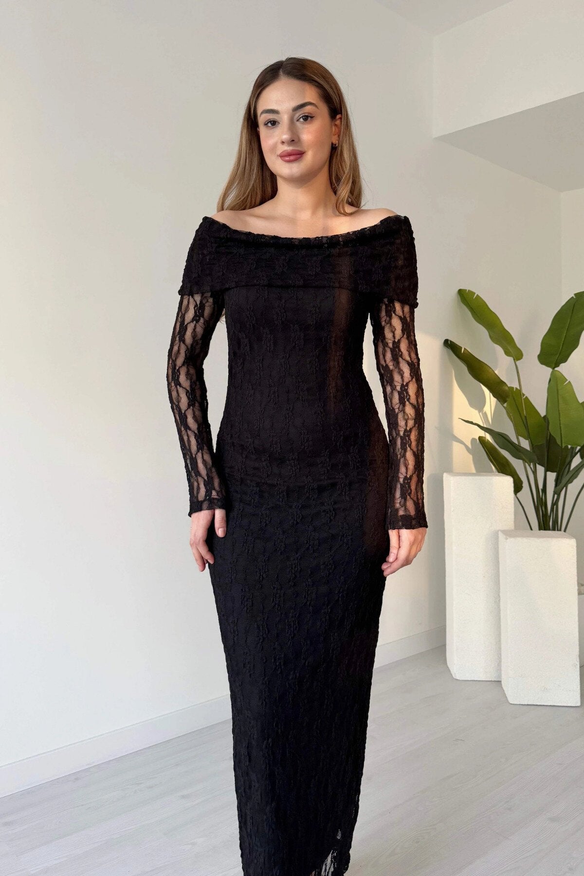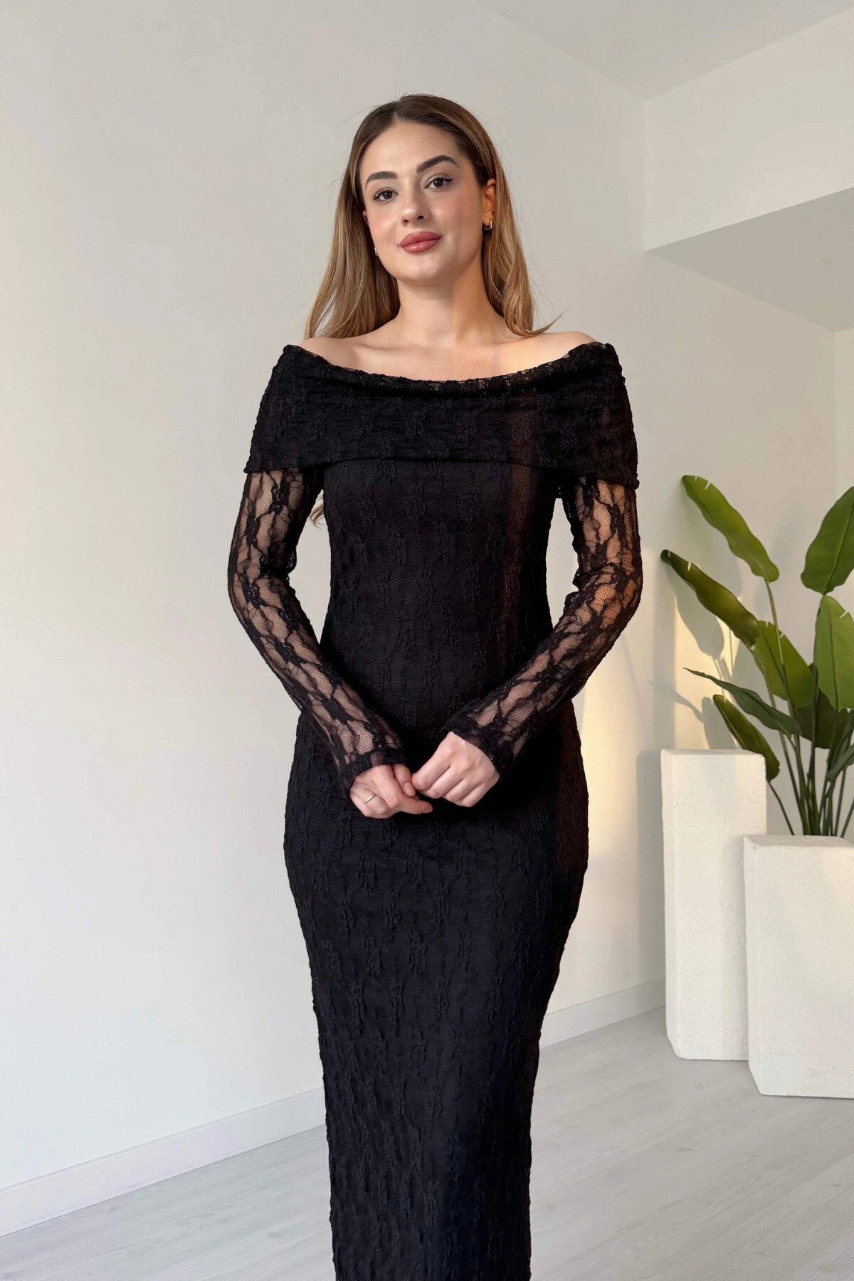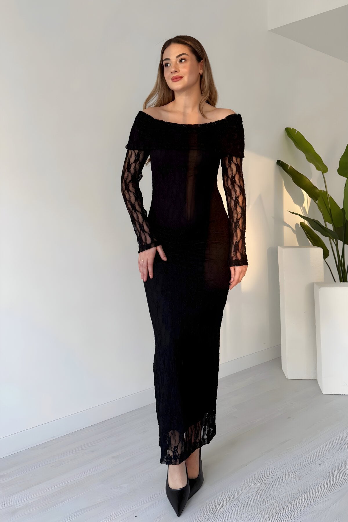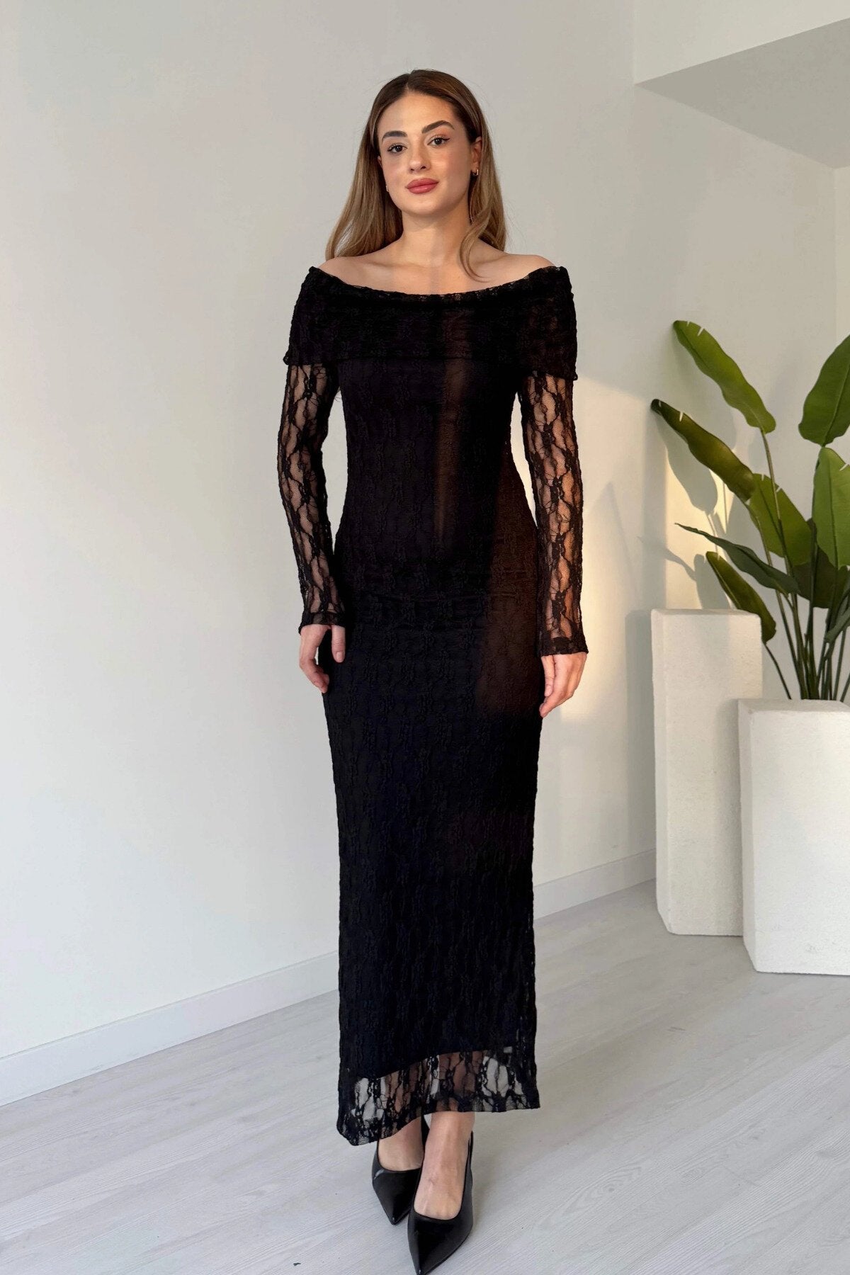 Long Guipure Lace Patterned Off-the-Shoulder Dress - Black