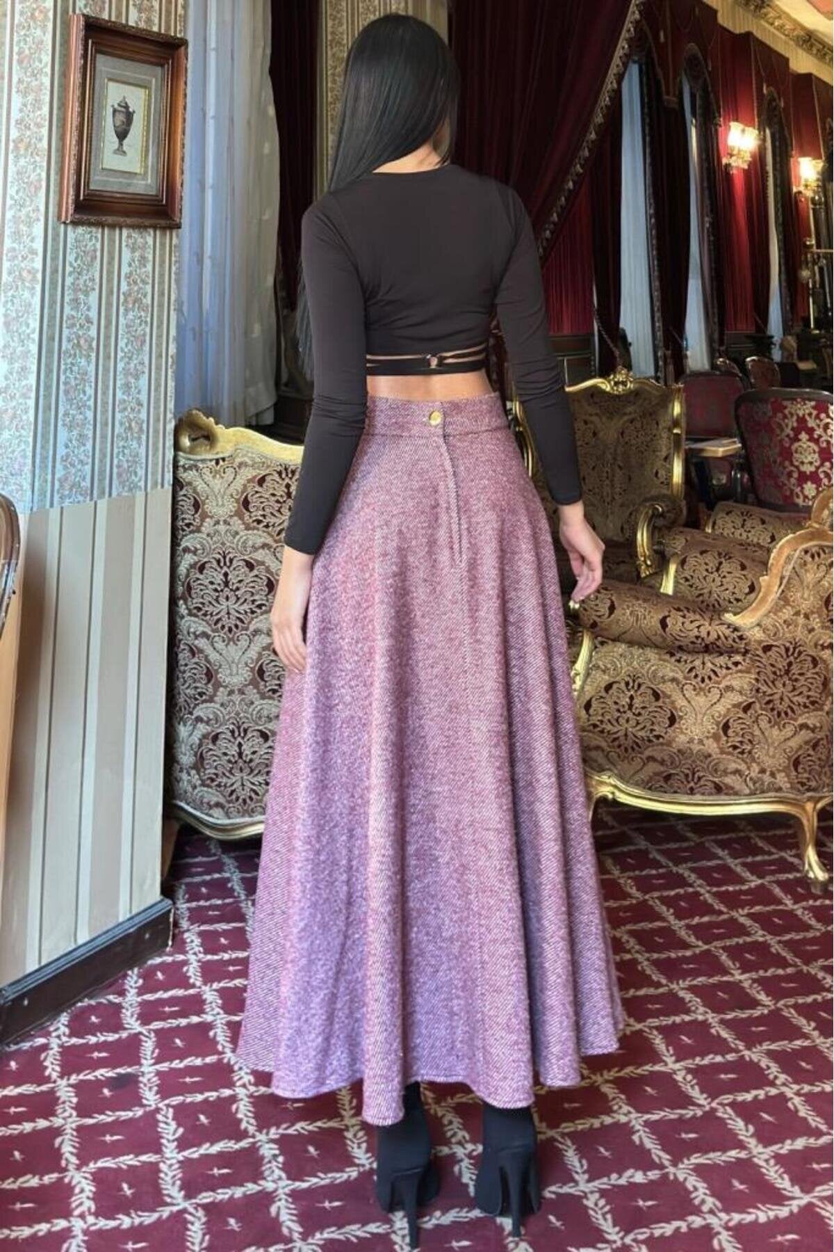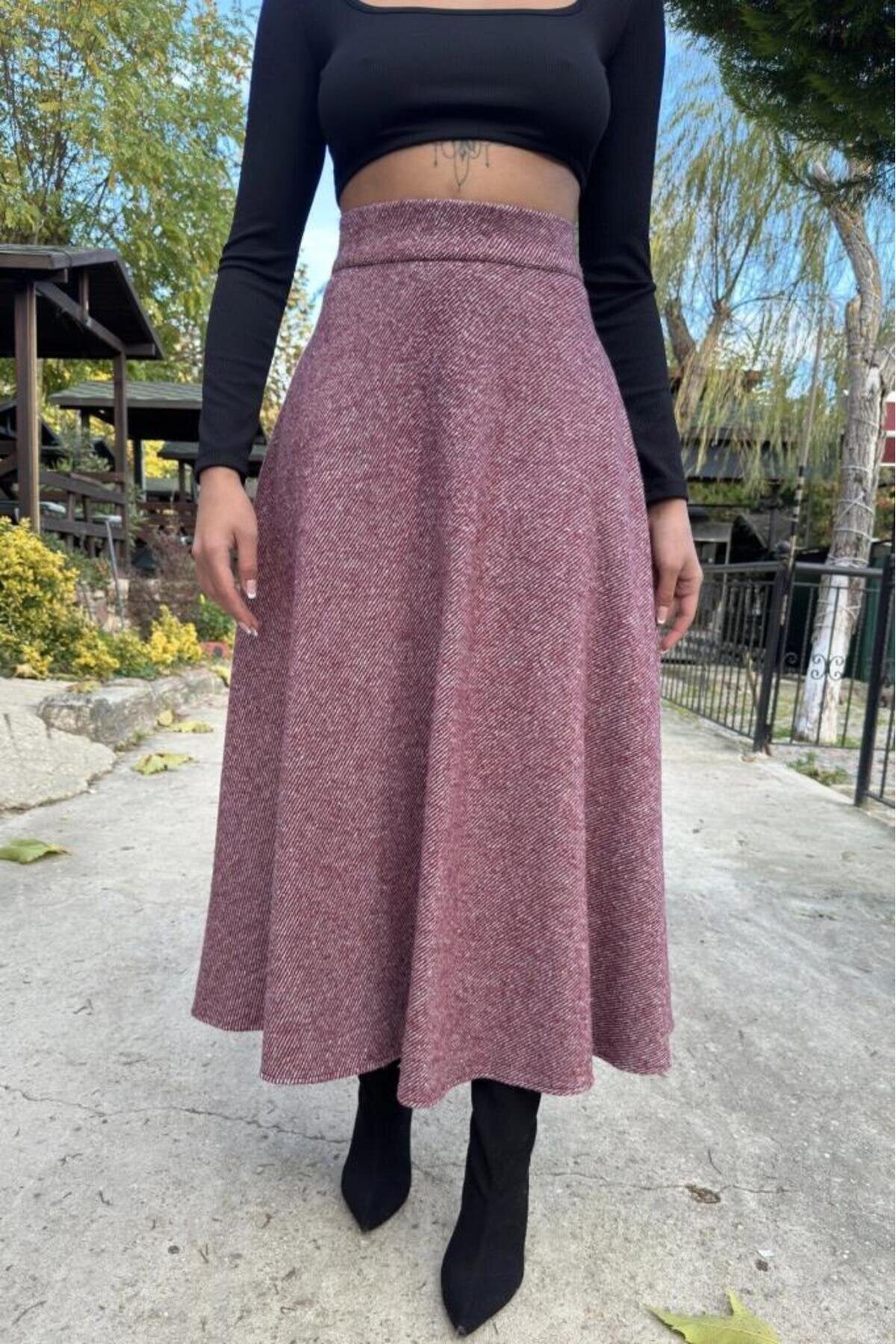 Long High-Waist Flared Flecked Cachet Pocket Skirt - Burgundy