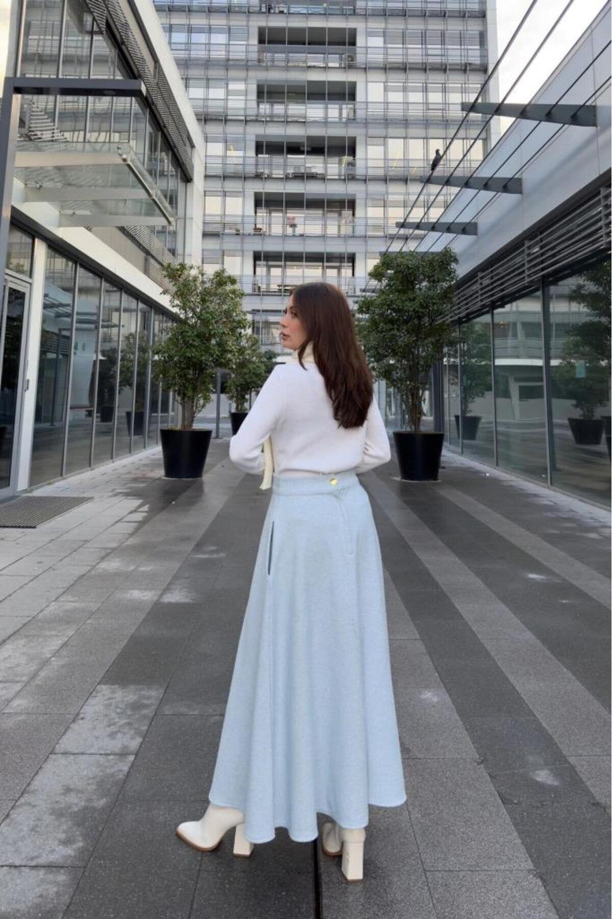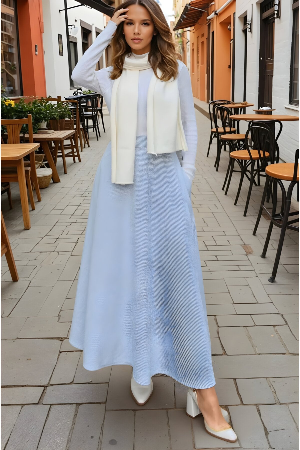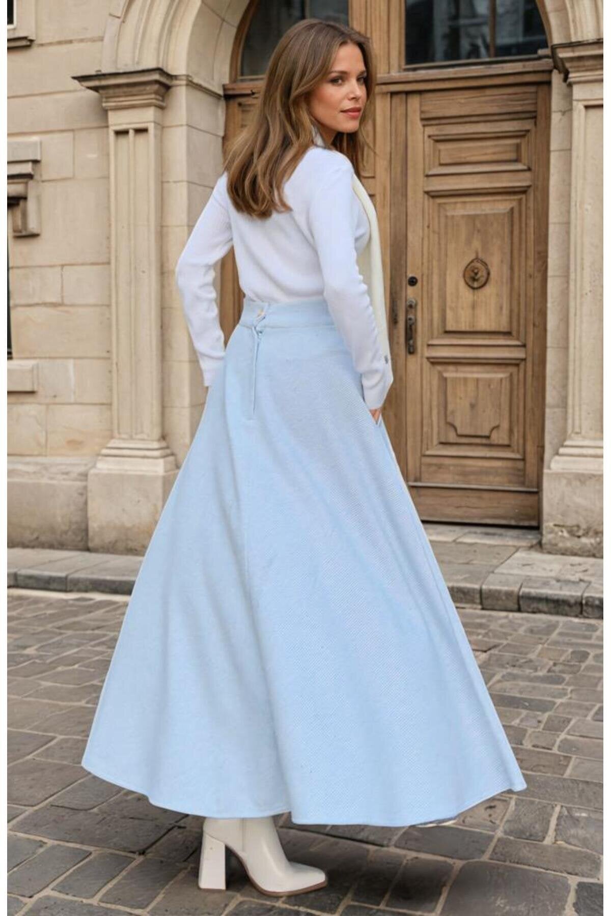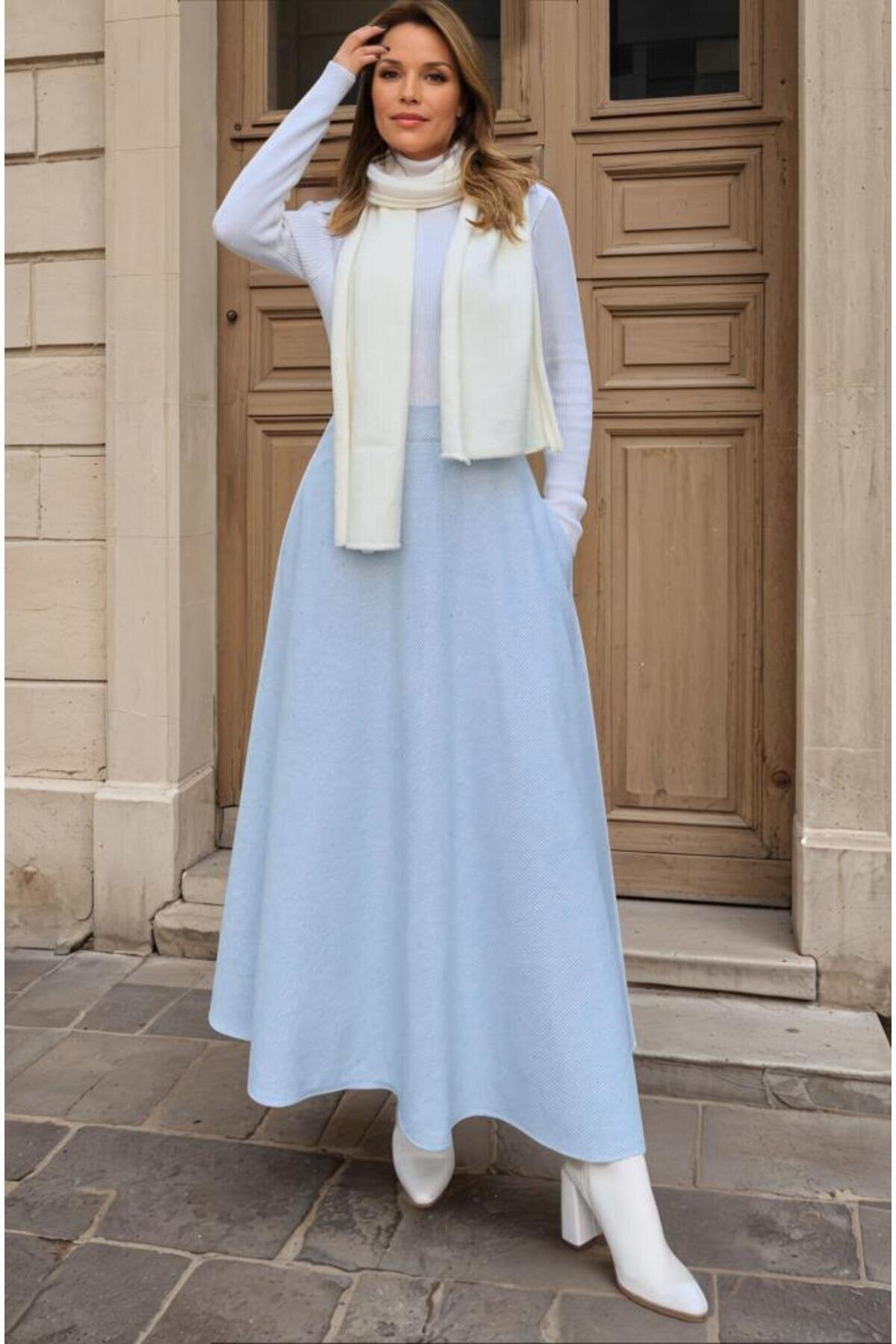 Long High-Waist Flared Flecked Cachet Pocketed Skirt - Blue