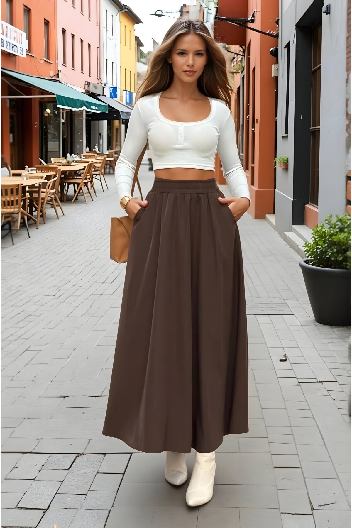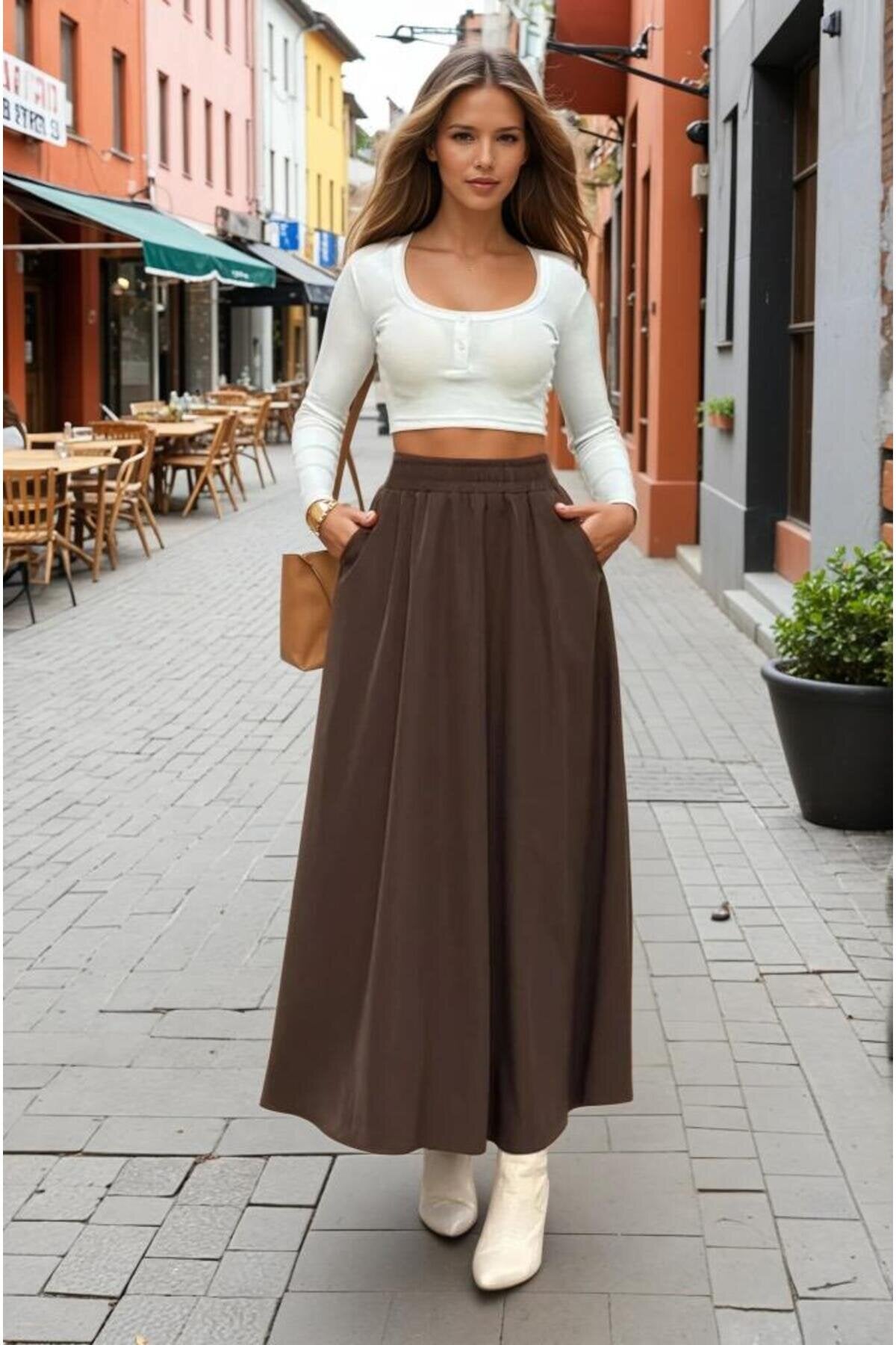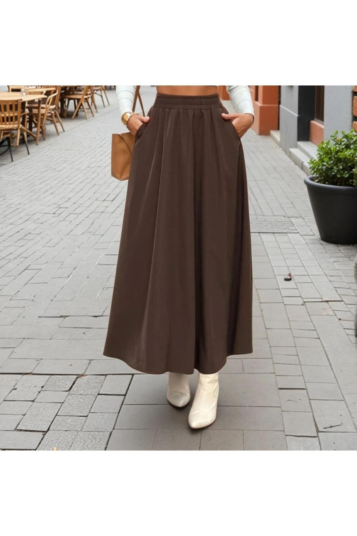 Long High-Waisted A-Line Elastic-Waist Skirt - Brown