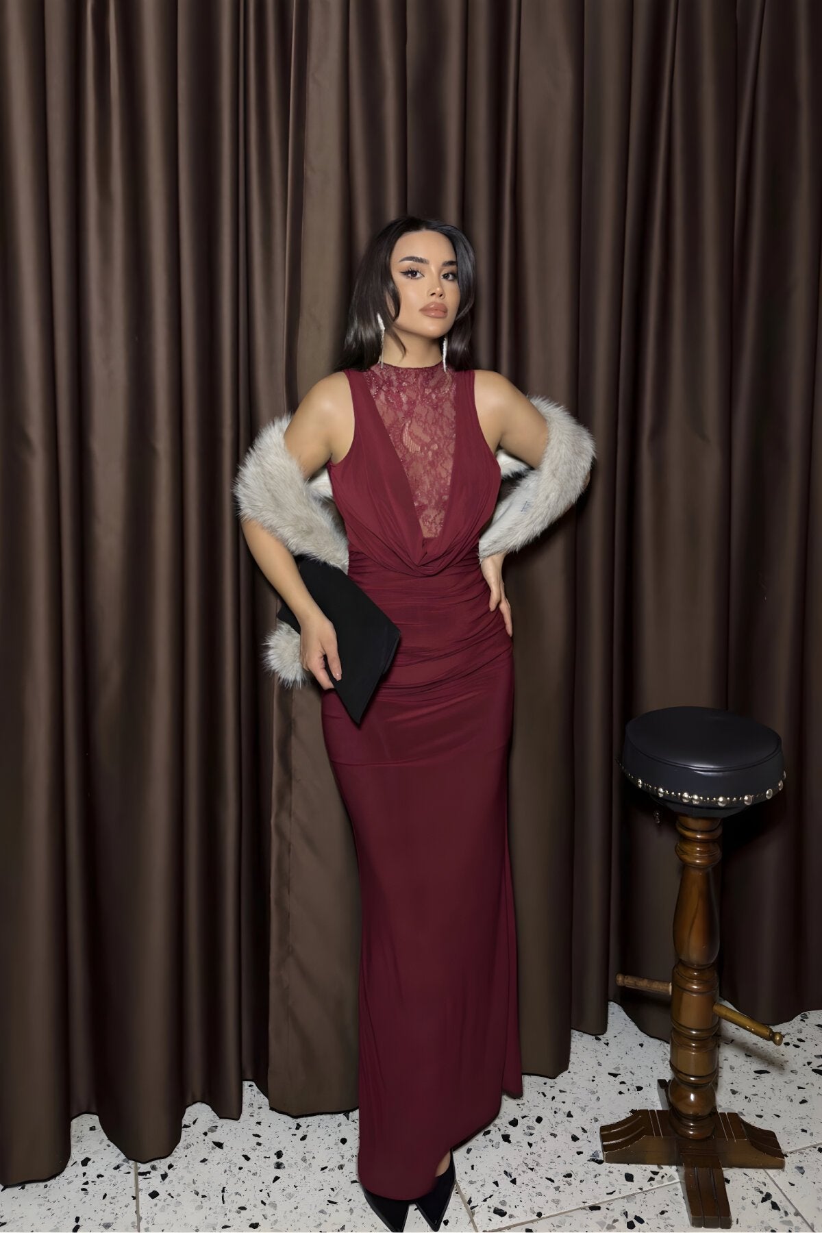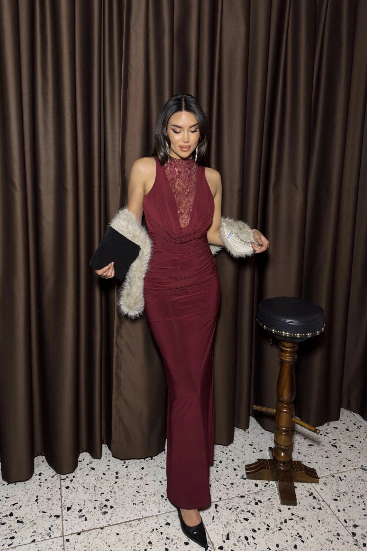 Long Lace Cowl Neck Evening Dress - Burgundy