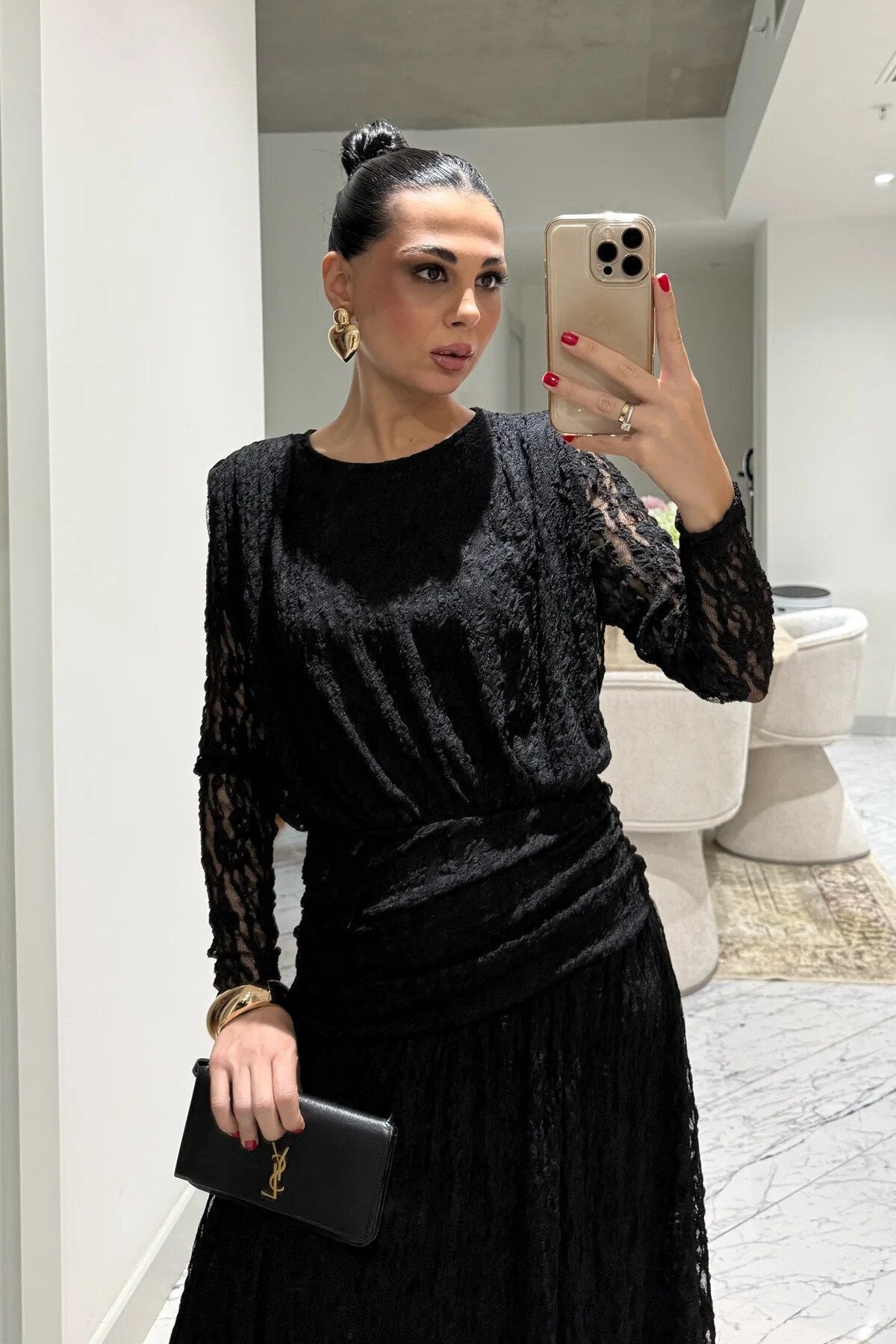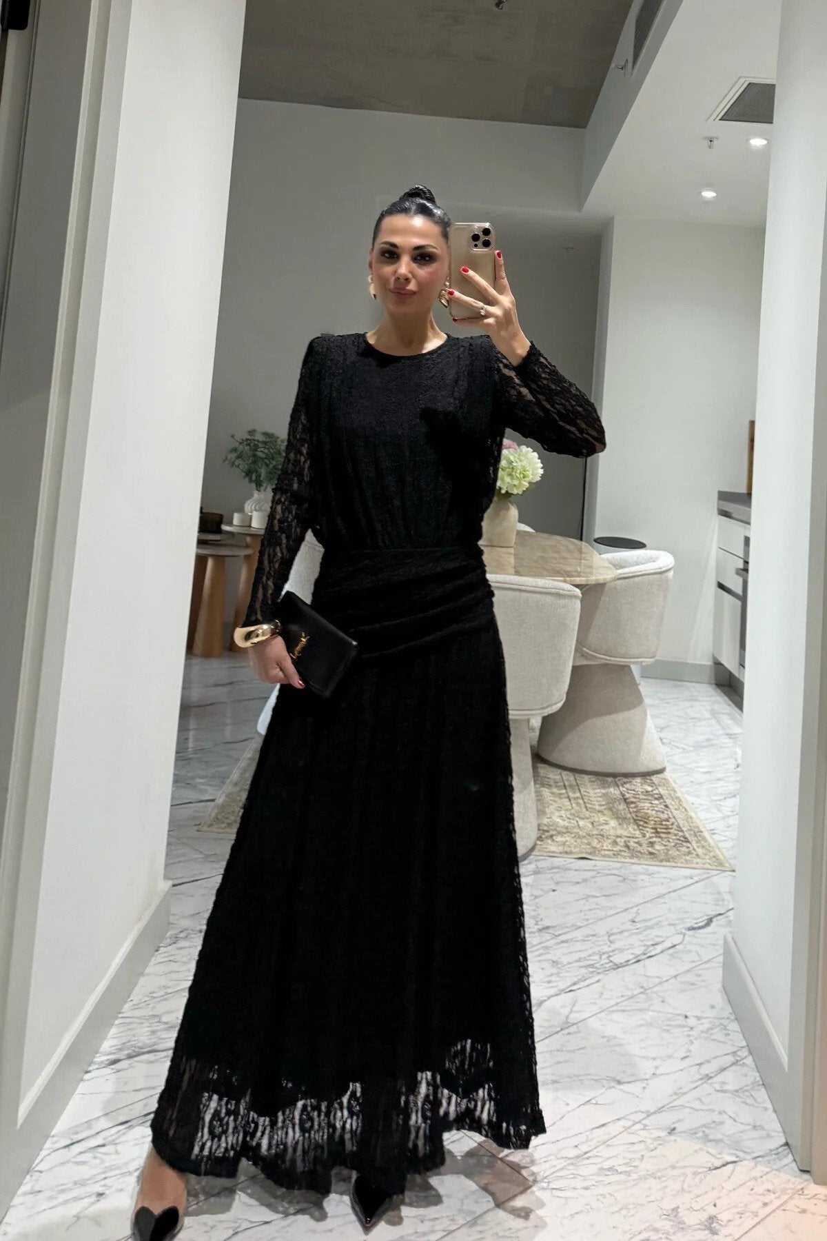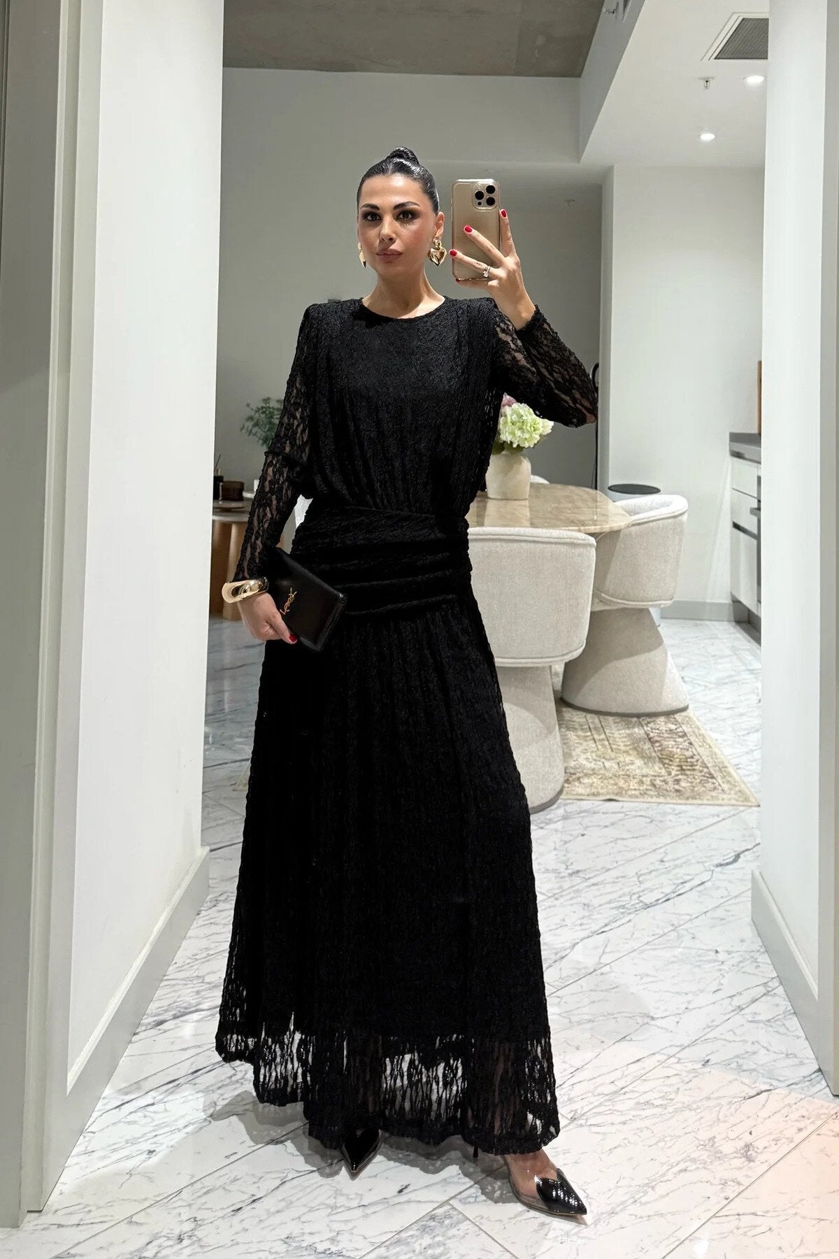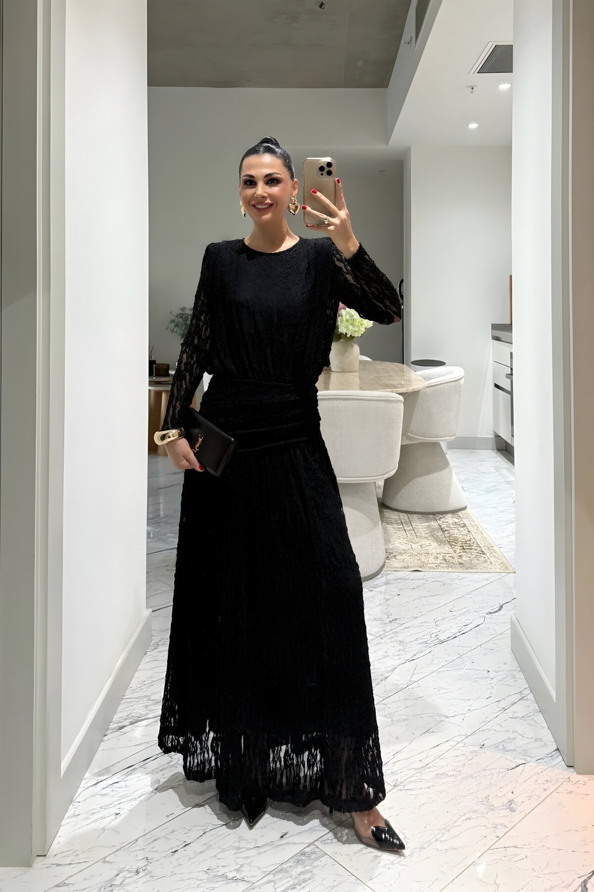 This stunning black maxi dress embodies sophisticated grace, combining the romantic allure of guipure lace with a modern, sleek silhouette. Its floor-skimming length and rich texture make it a standout choice for those seeking a look that is both refined and captivatingly feminine.