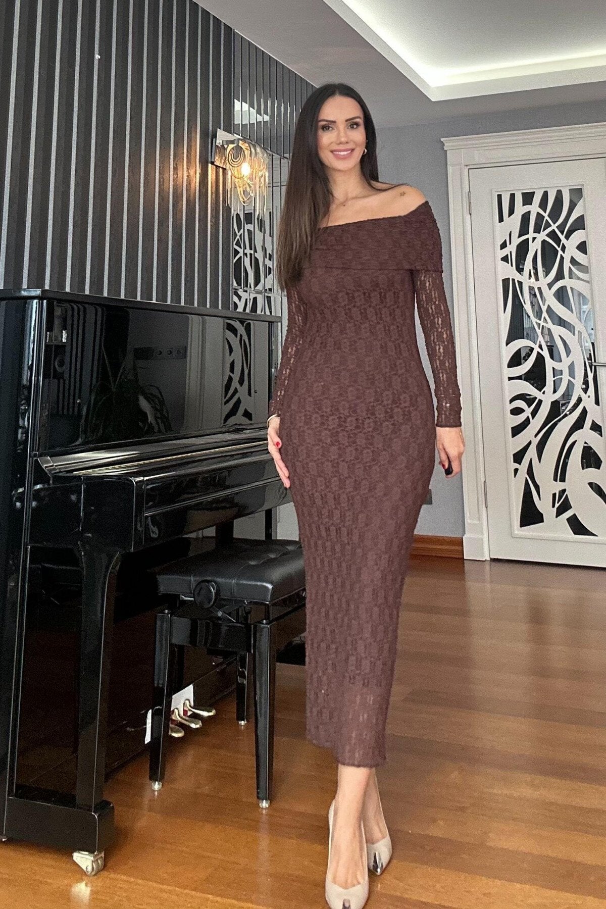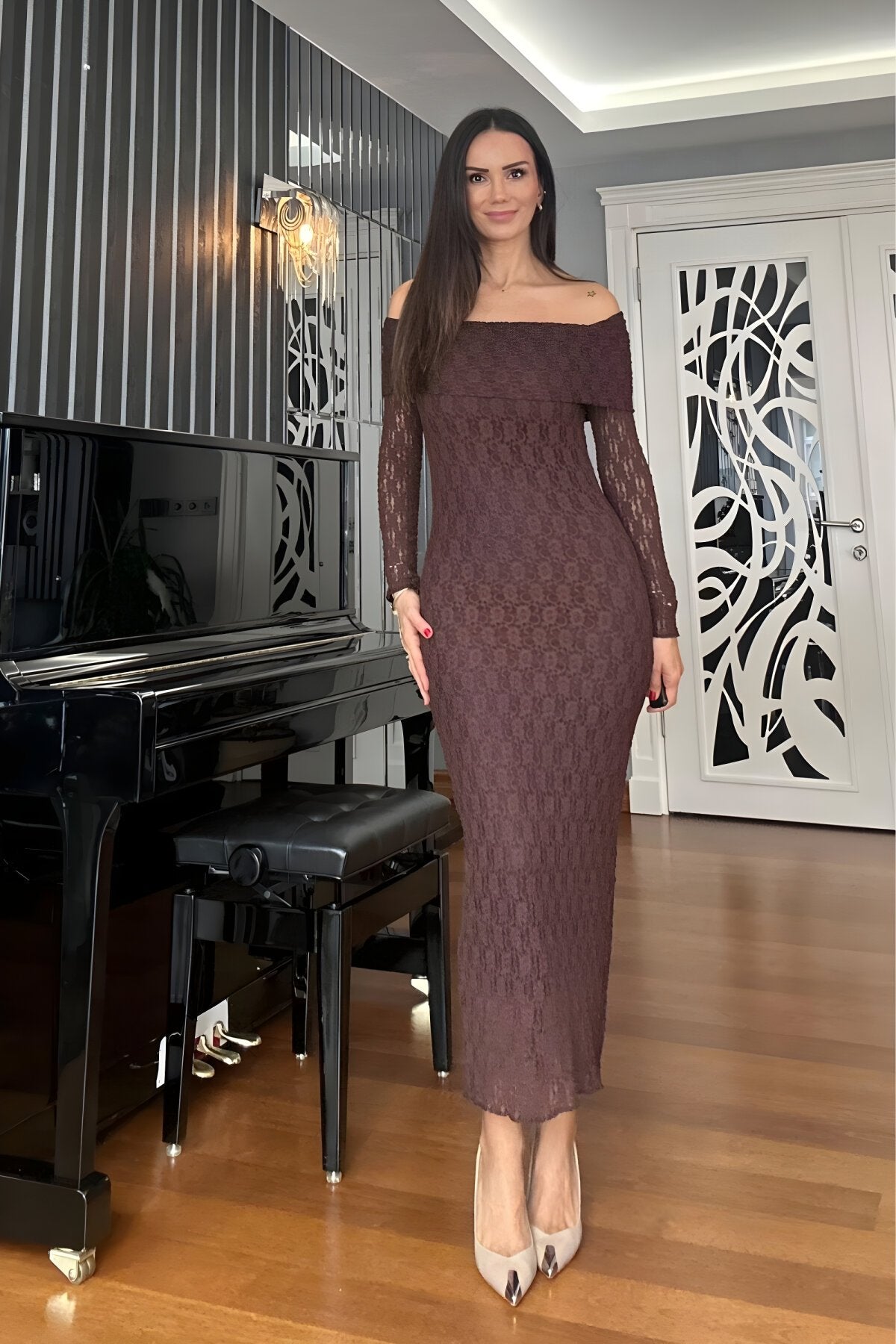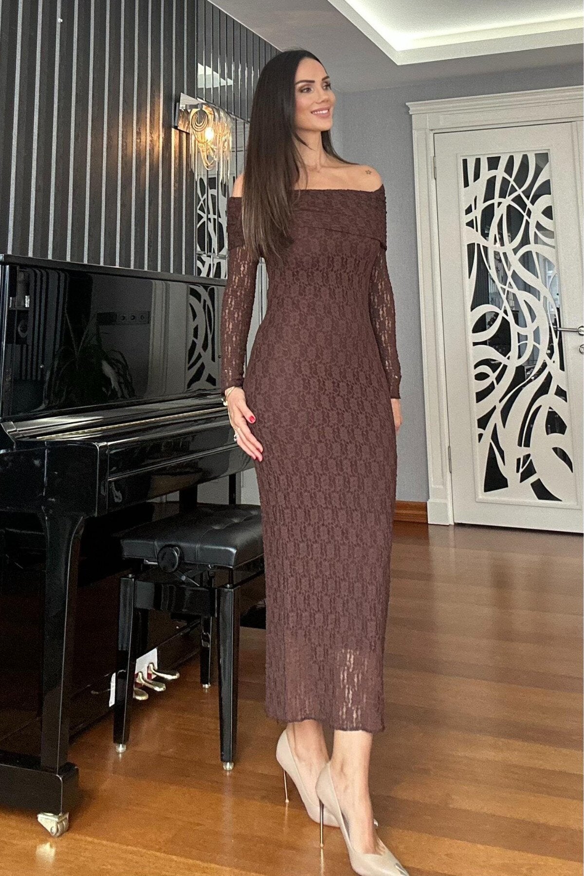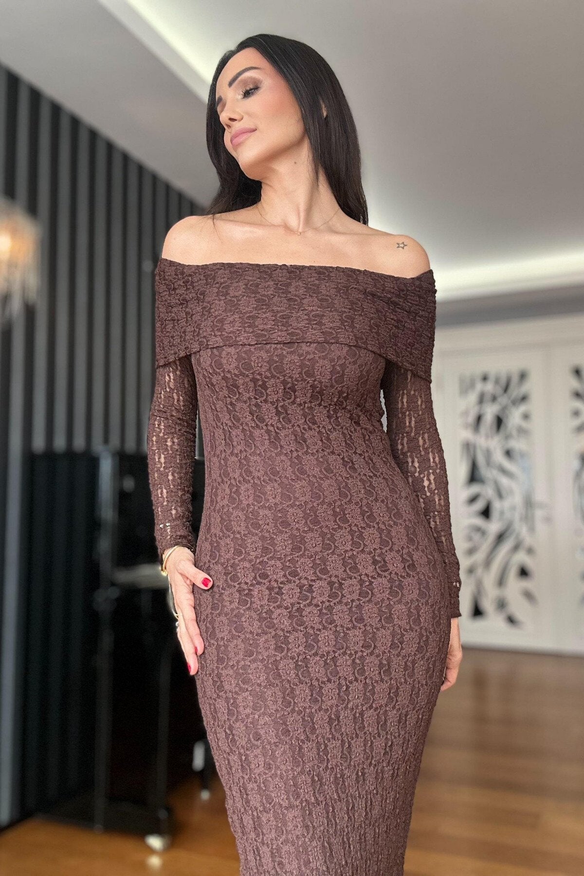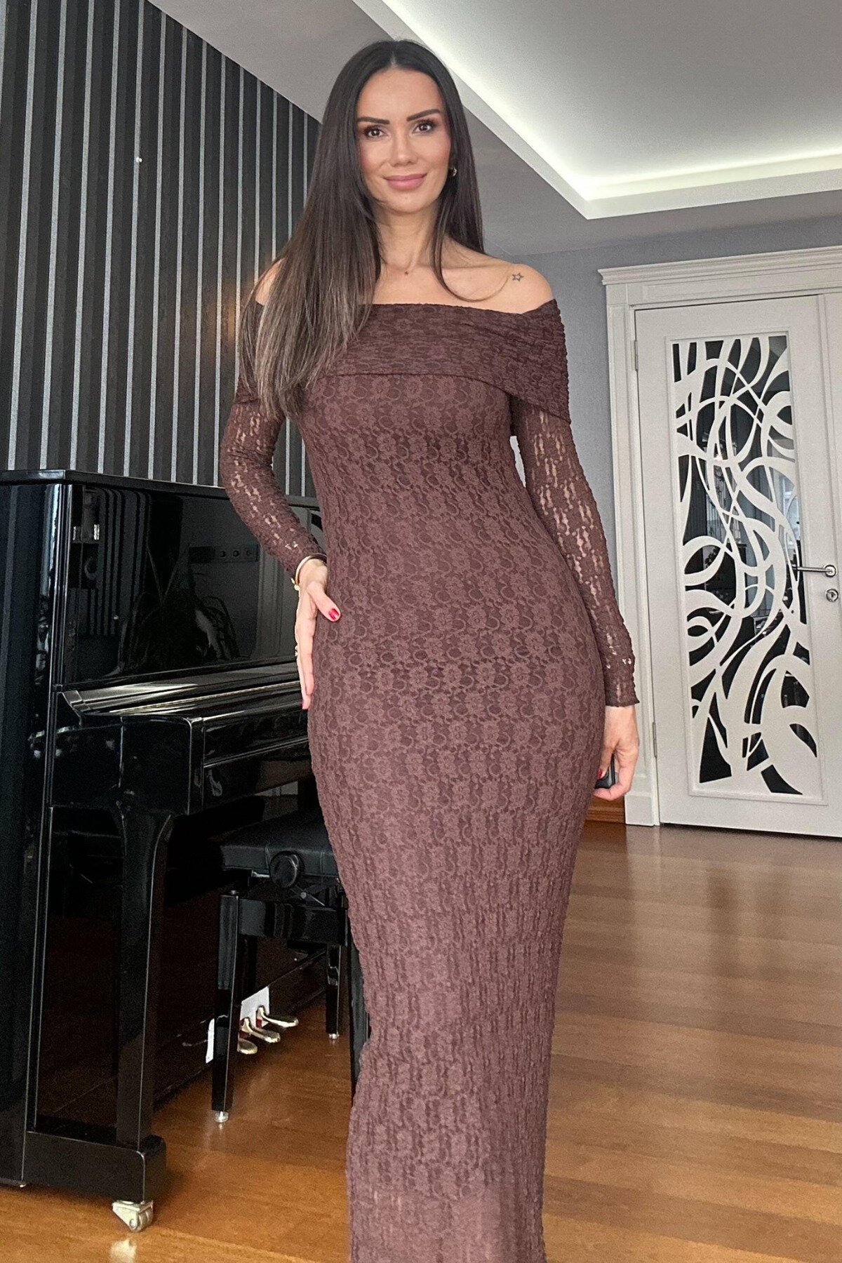 Long Lace Off-the-Shoulder Neck Evening Dress - Brown