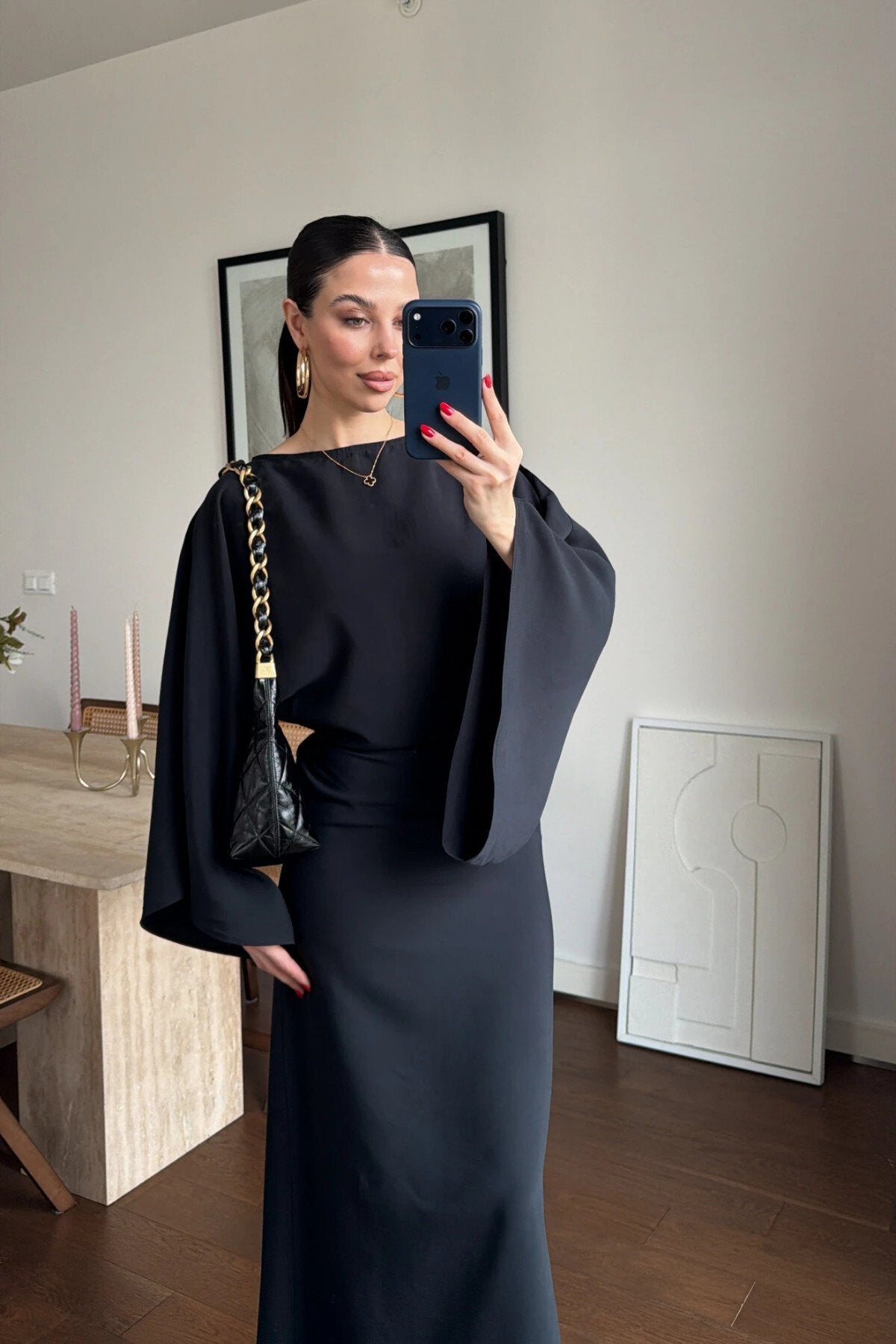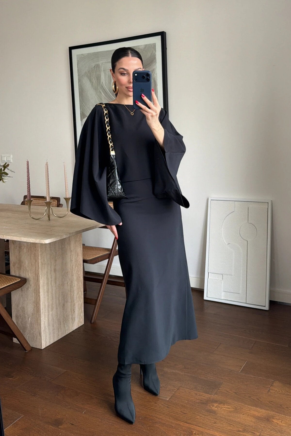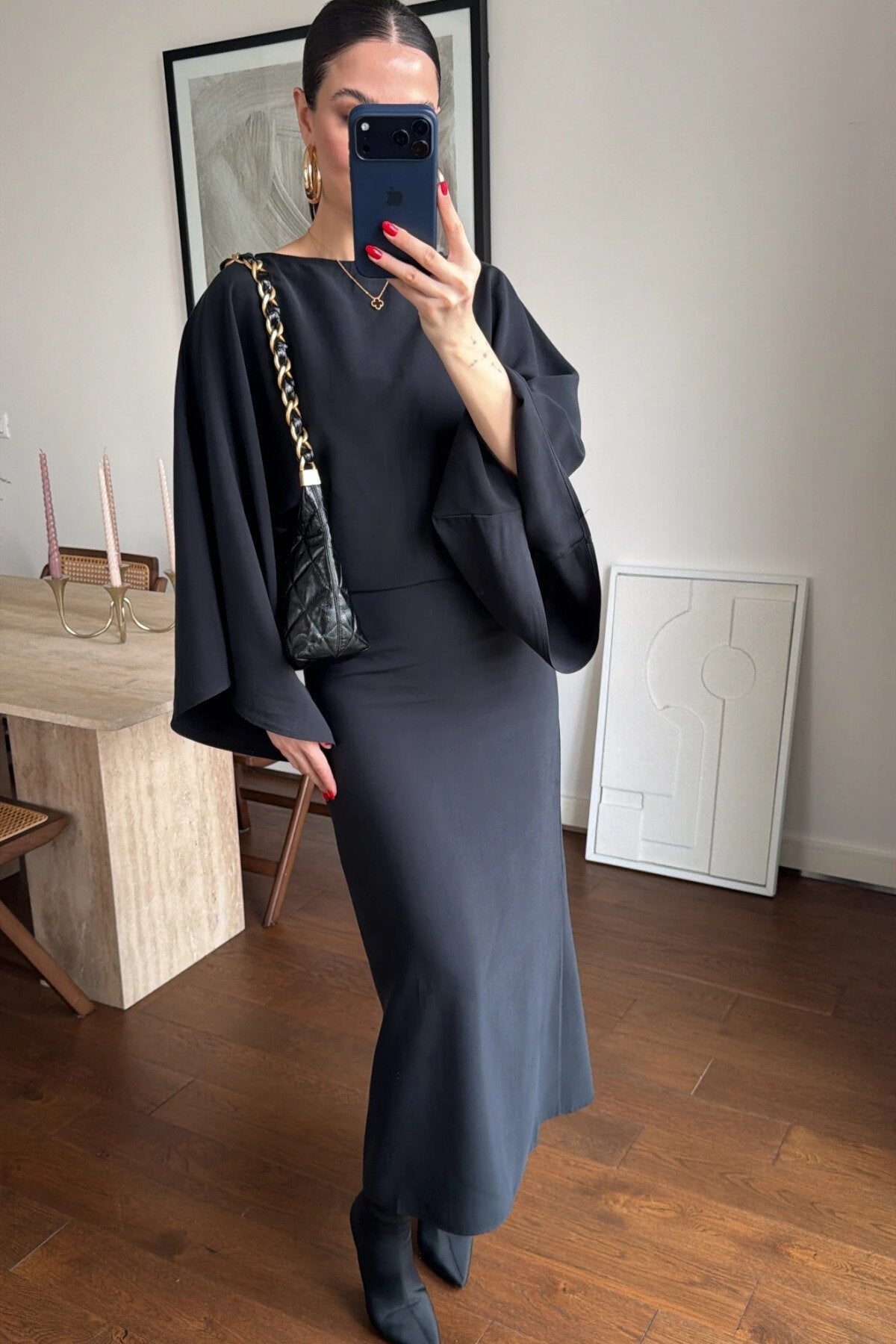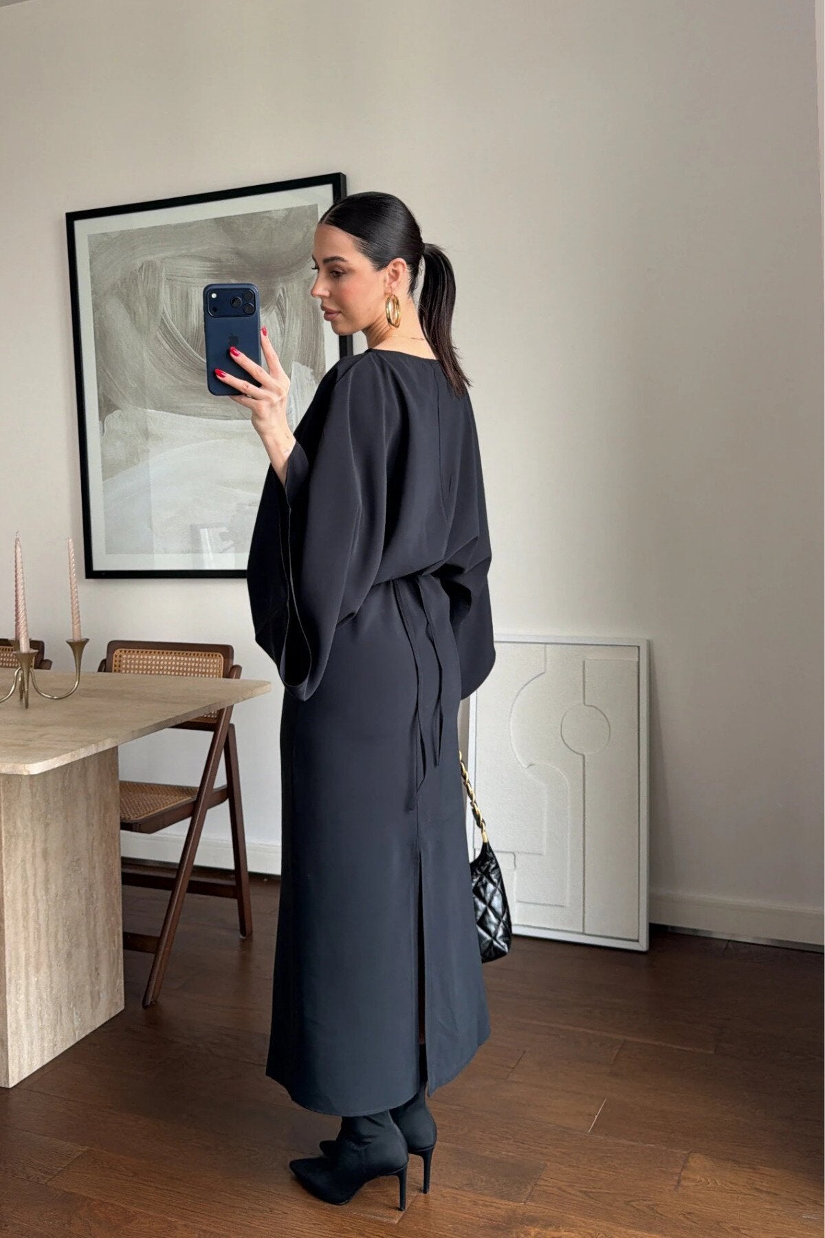 Long Loose-Fit Batwing Sleeve Belted Slit Dress - Black