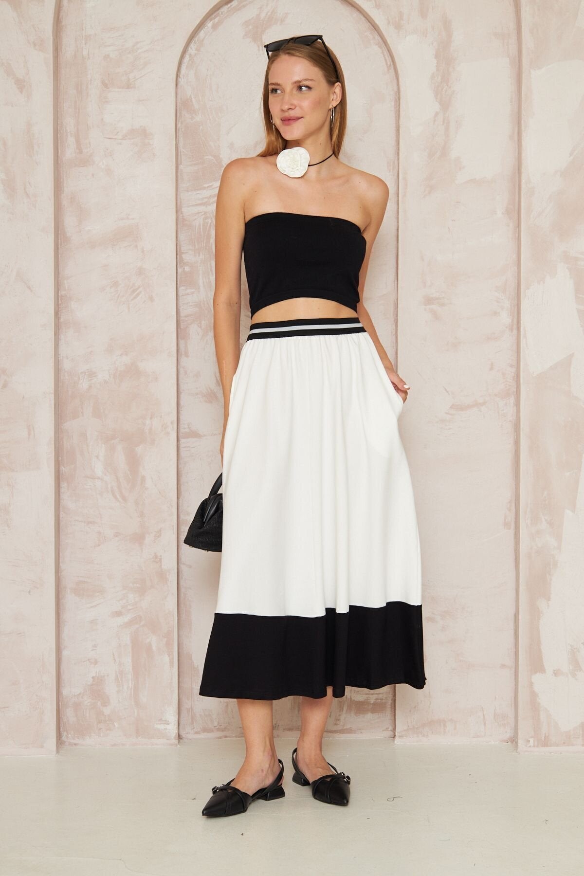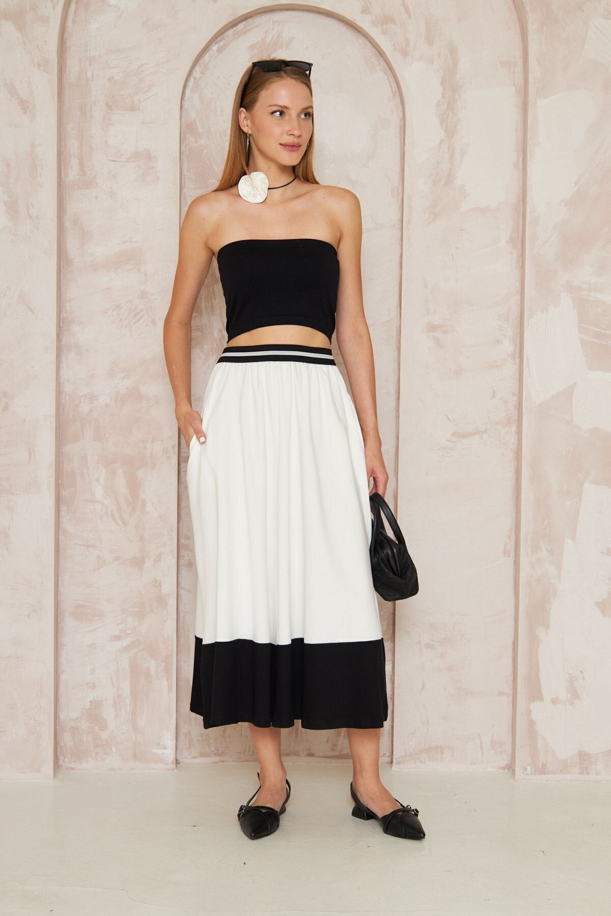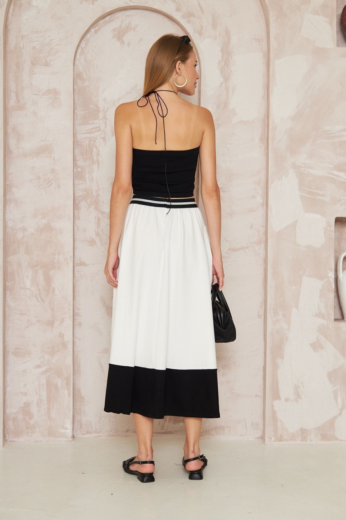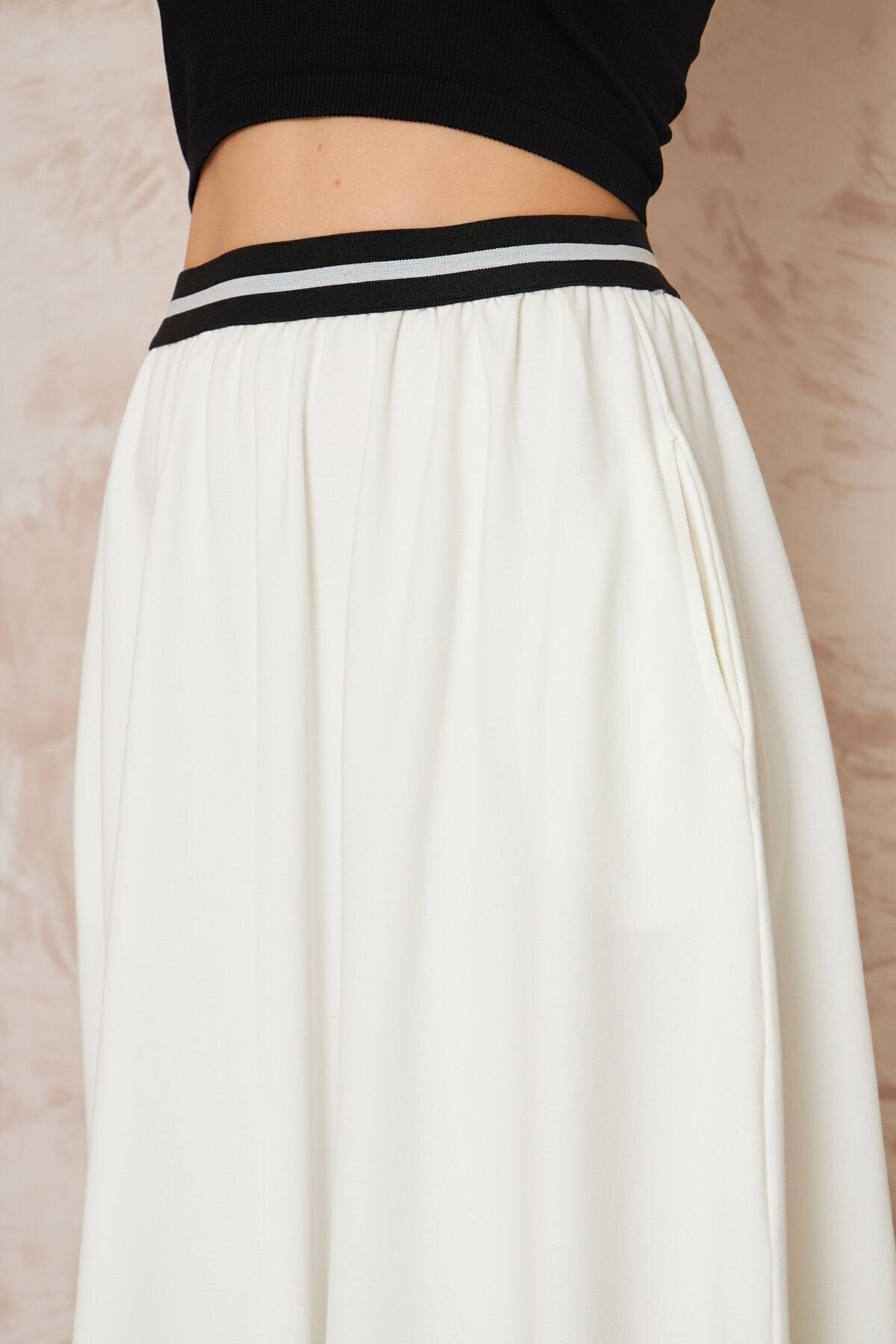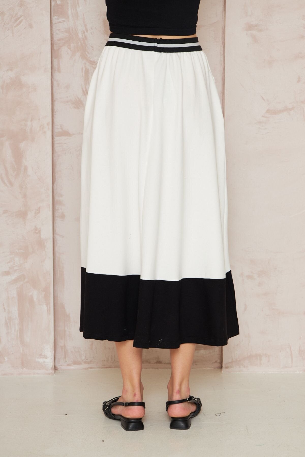 Long Loose Flared Blocked Boho Skirt - White Stripe Detail