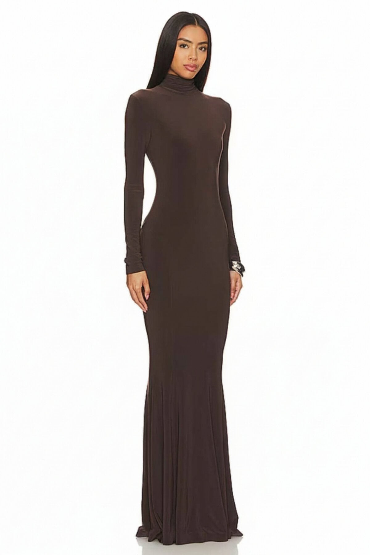 Long Mock Neck Ruffle Hem Evening Dress - Brown